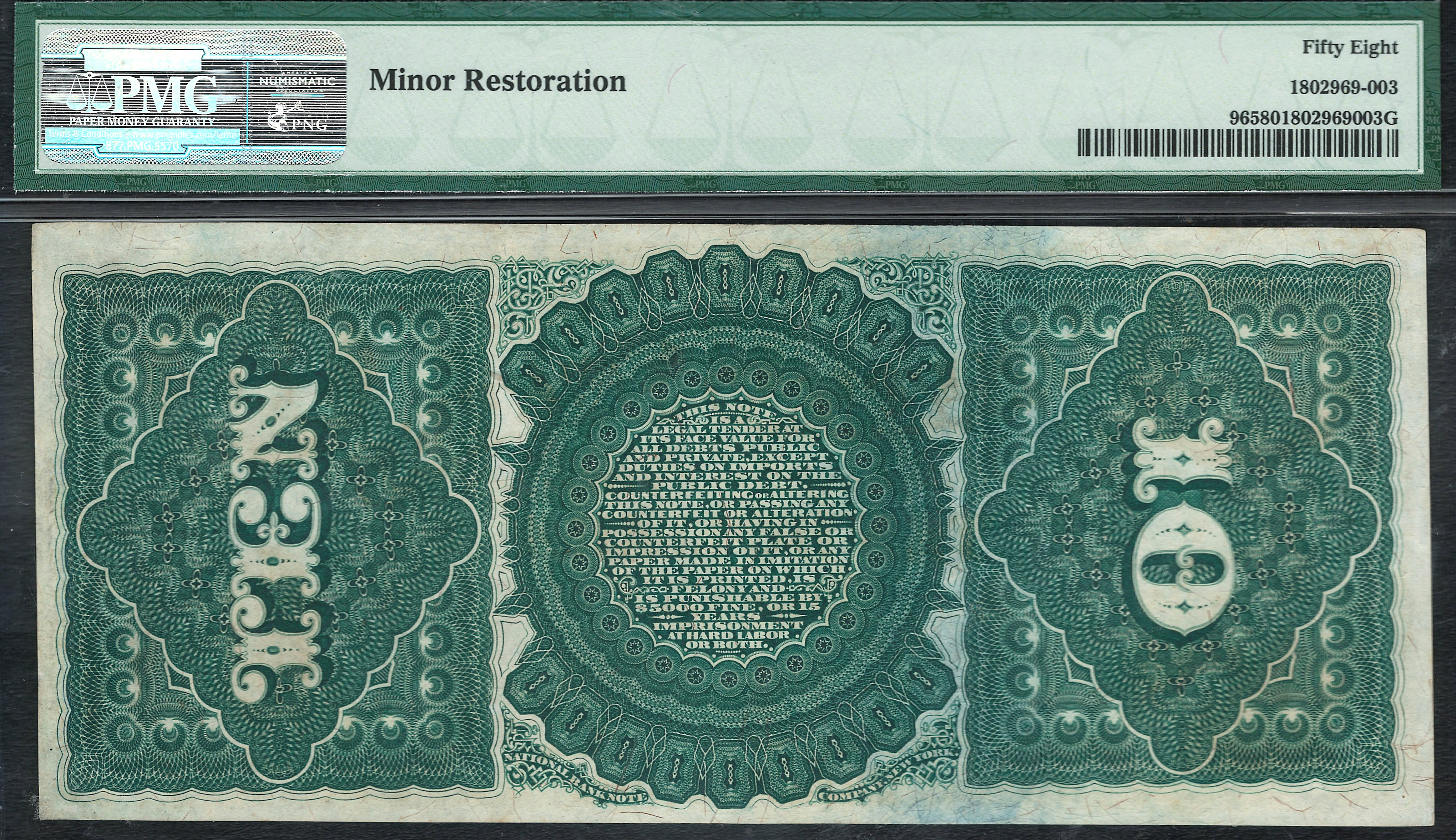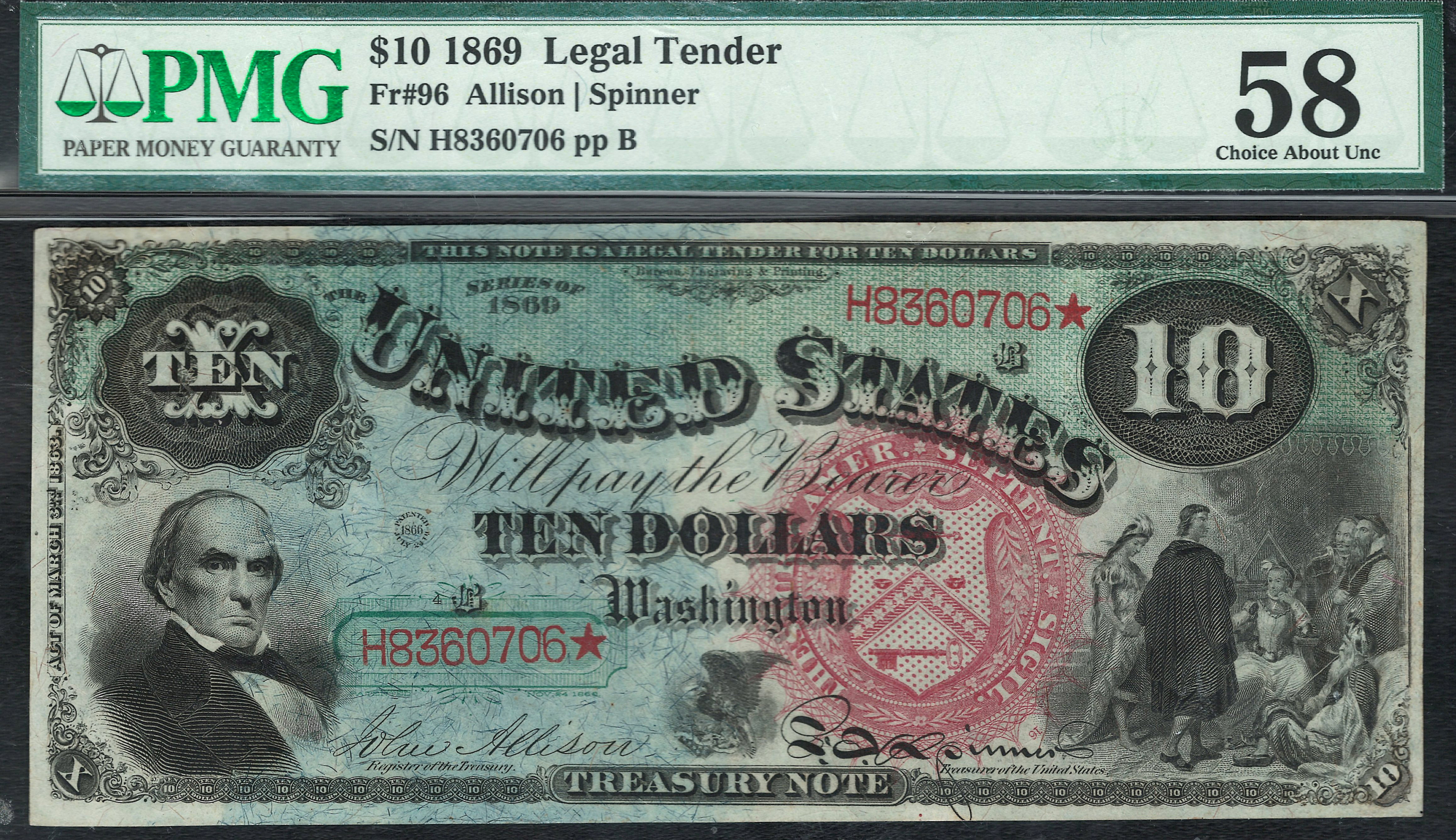 Fr.-96 1869 $10 Legal Tender (RAINBOW) Ser. H8360706 PMG 58