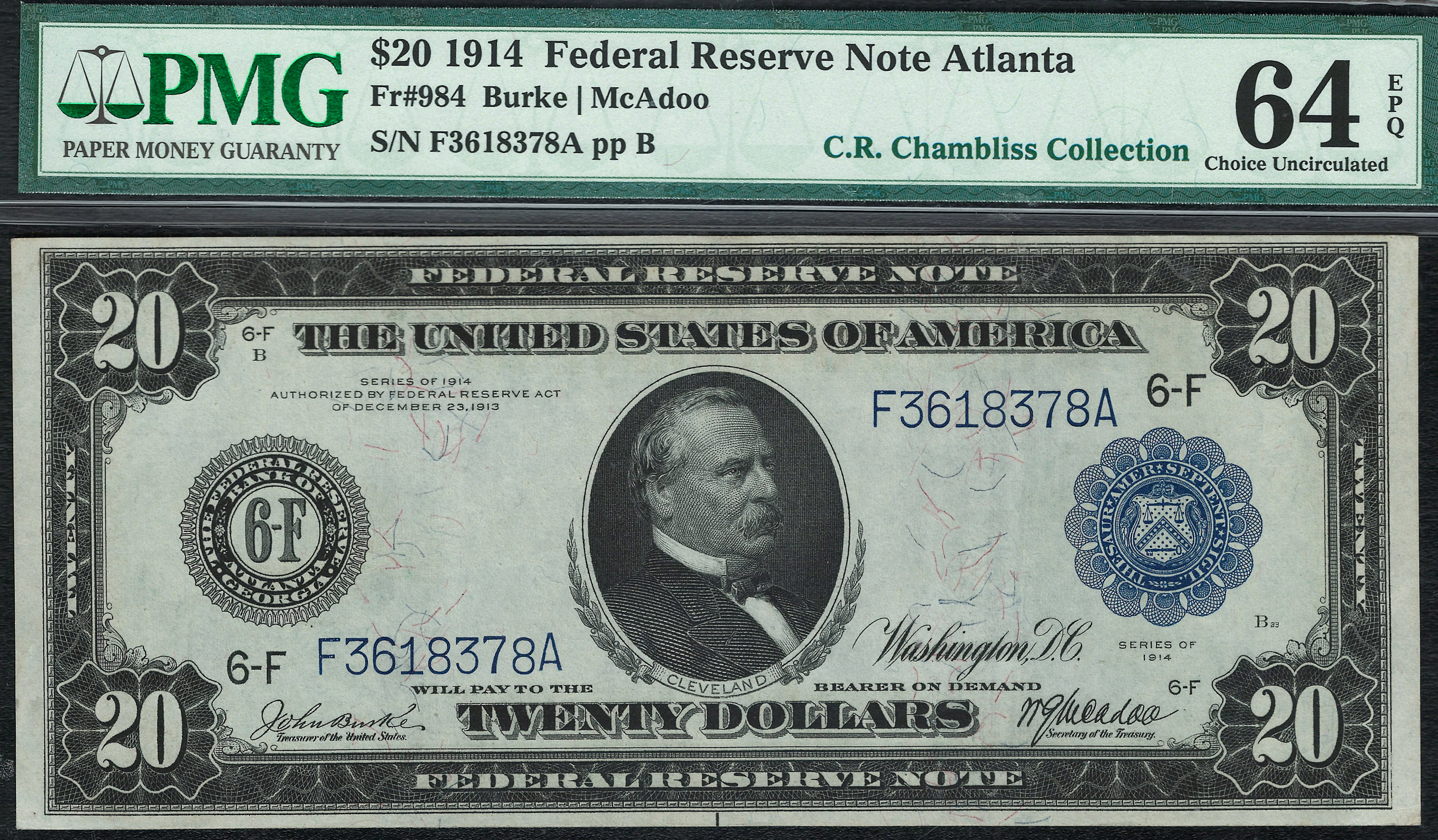 Fr.-984 1914 $20 Atlanta FRN (Blue Seal) Ser. F3618378A PMG-64EPQ