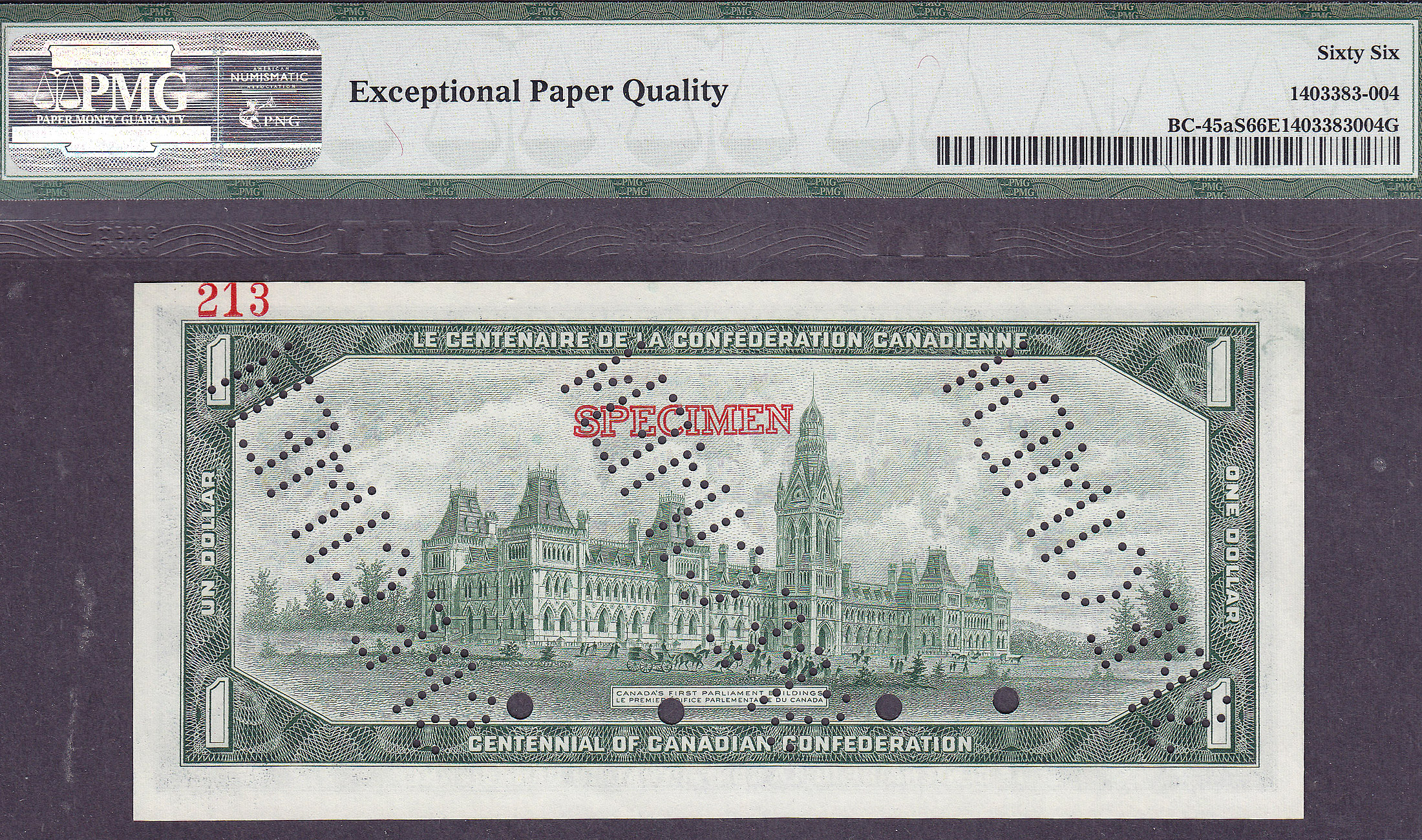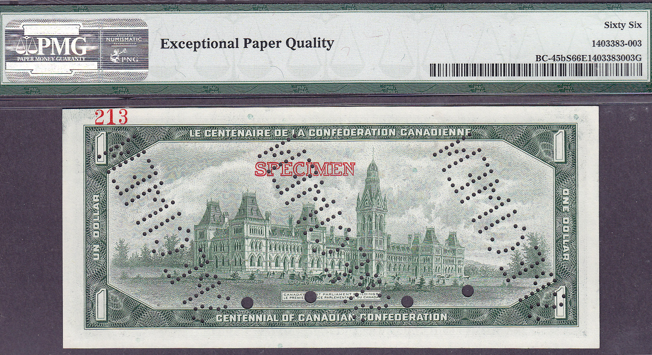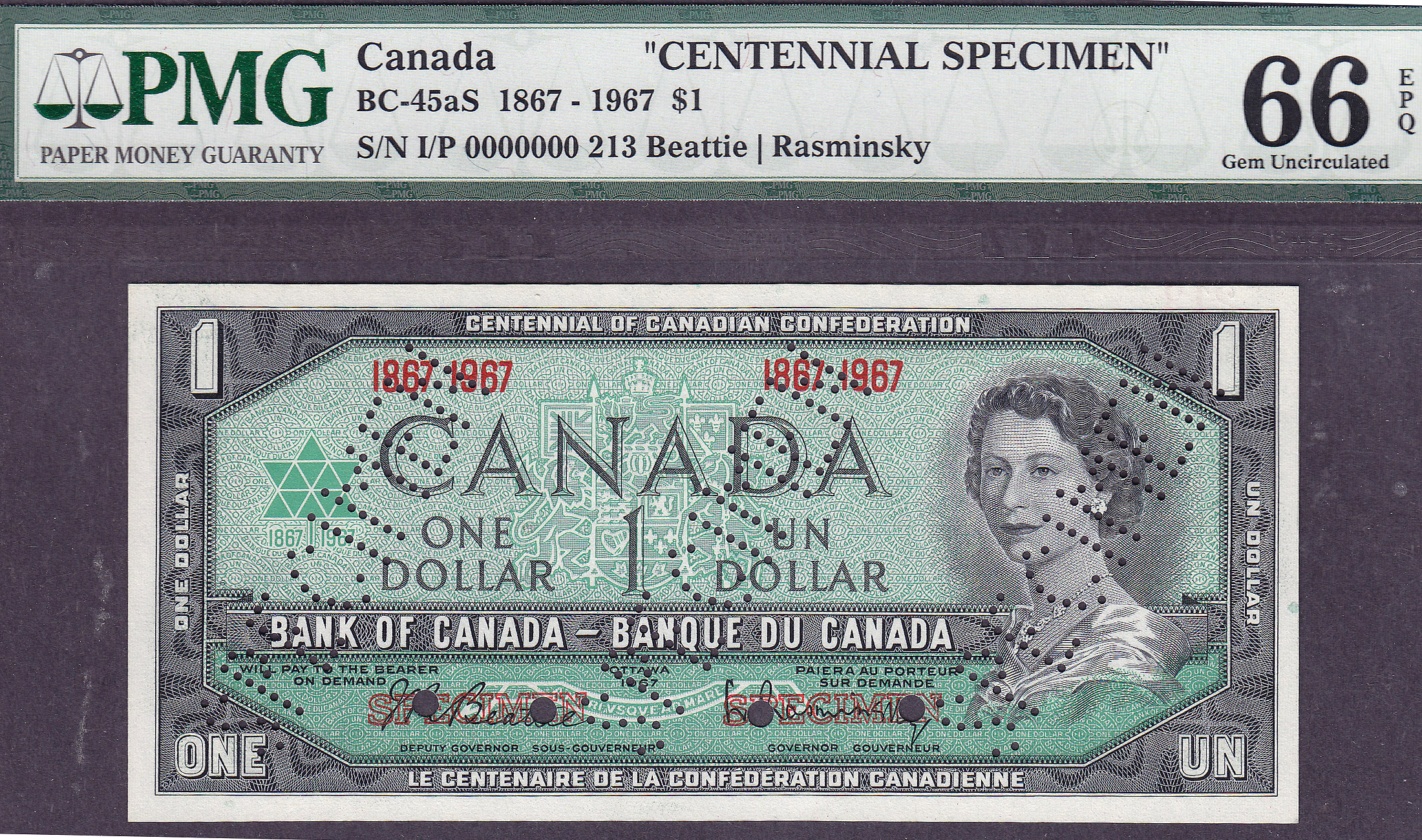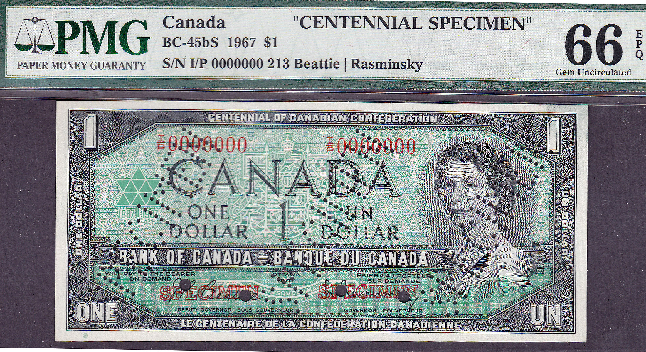 Here is something you rarely see or come across. You never see these Canadian Centennial Specimen sets for sale anywhere. This set consists of two multi-faced 1967 $1 Canadian Dollar bills that are punched canceled with the words Specimen across the bill. It is also the only set that is a Centennial Specimen. In other words they cover 100 years from 1867 to 1967. They do not carry serial numbers as they are Specimen notes. Specimen notes were sent from one country to other countries to use to properly identify real Canadian currency from counterfeit currency. They were not designed for general use by the public. Therefore you rarely come across these sets. If you are into Canadian currency or simply want something that is very unusual to own, this is for you. You won’t find these Specimen sets in many collections of any type. These two notes are in ONE large PMG holder. They are graded as superb GEM PMG-66EPQ.
