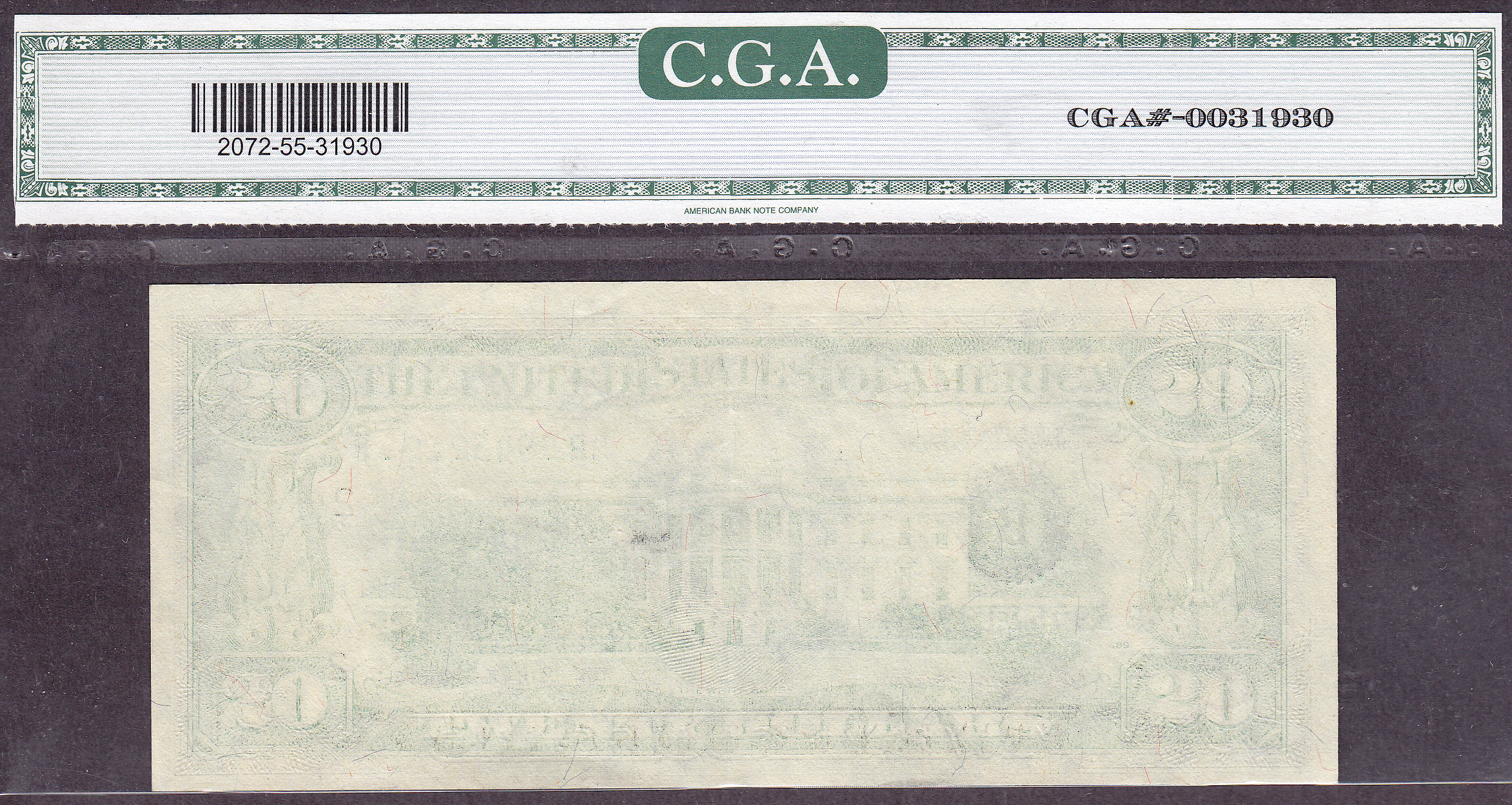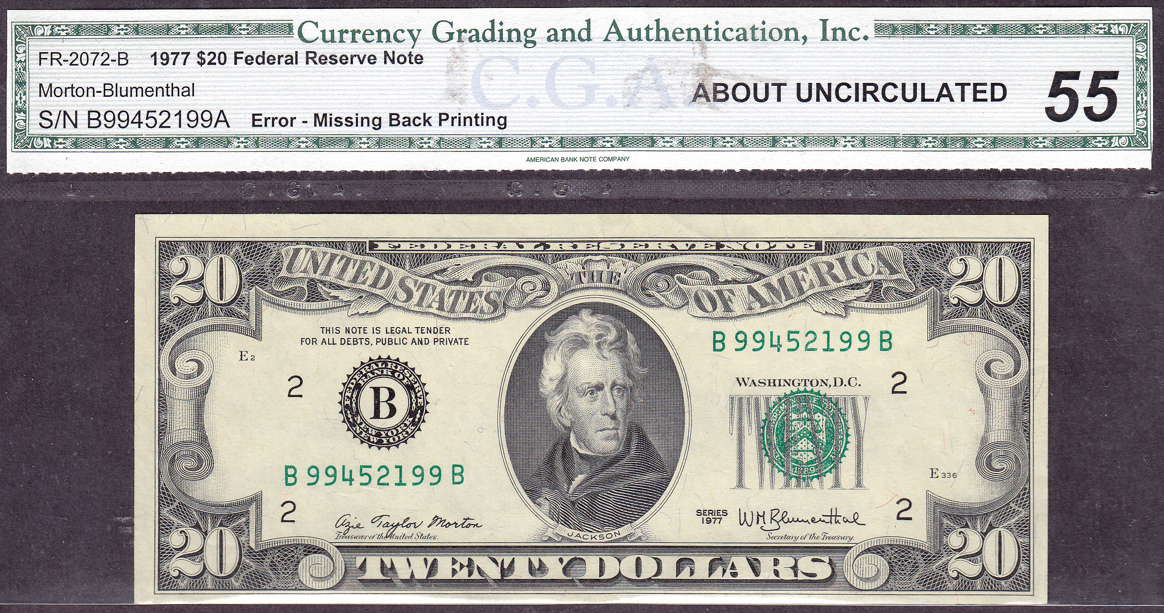 This is a 1977 $20 FRN Blank Back or missing the first print, however you want to say it. It has been a CGA holder for about 9 years. This is a real nice example of this popular error type. You can see the one clean crease down the back side horizontally. It is advertised at a price you can't argue with...$550!