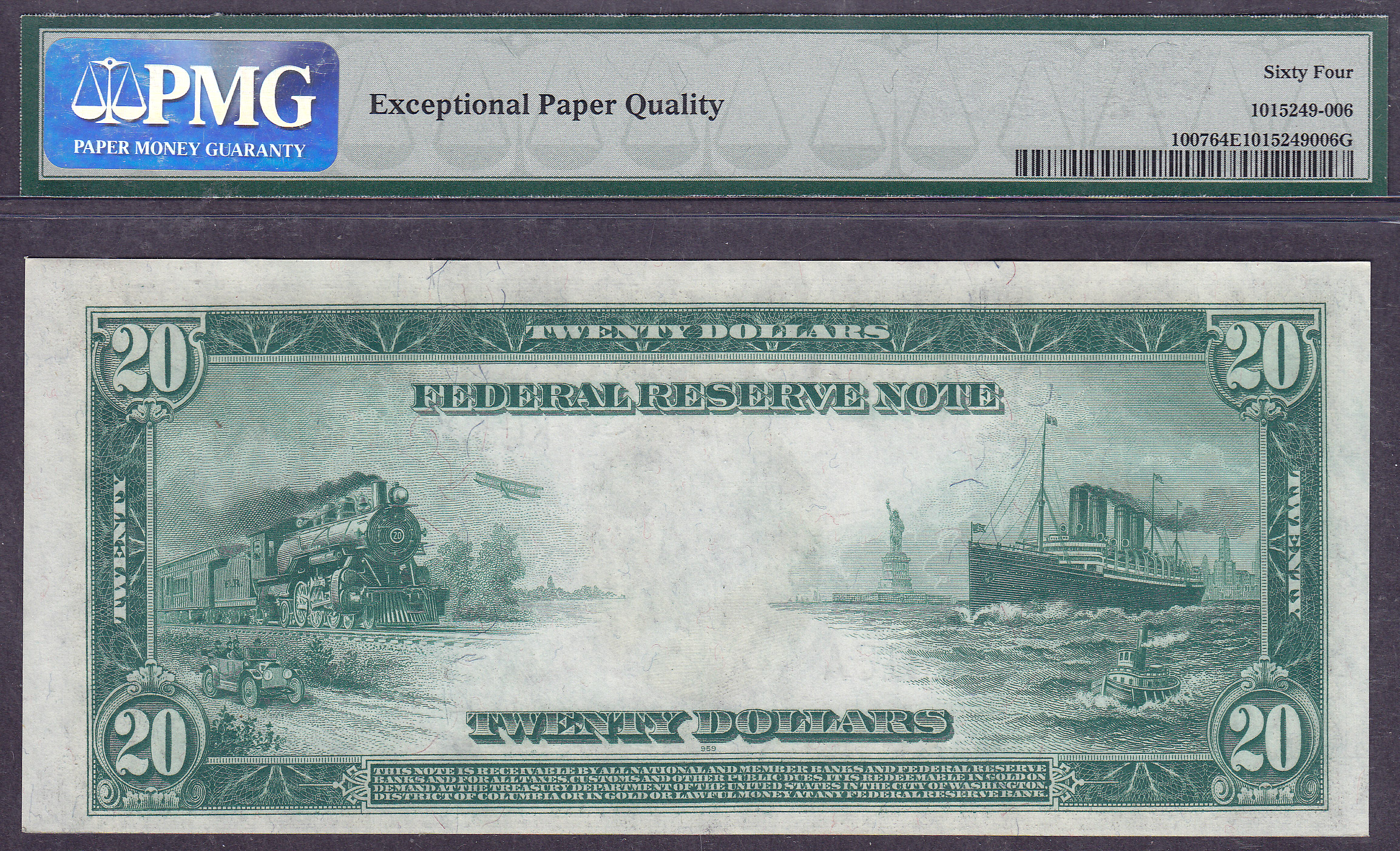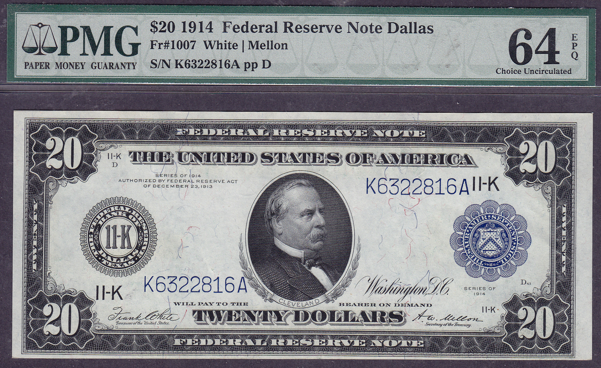 A special 1914 $20 Dallas FRN. Ser # K6322816A. Graded as a serious PMG-64EPQ. This is one of the finer Dallas notes available for this FR #. If youve ever considered putting a set together in UNCs, you wont find a better deal on a Dallas note in this FR number anywhere on the internet.