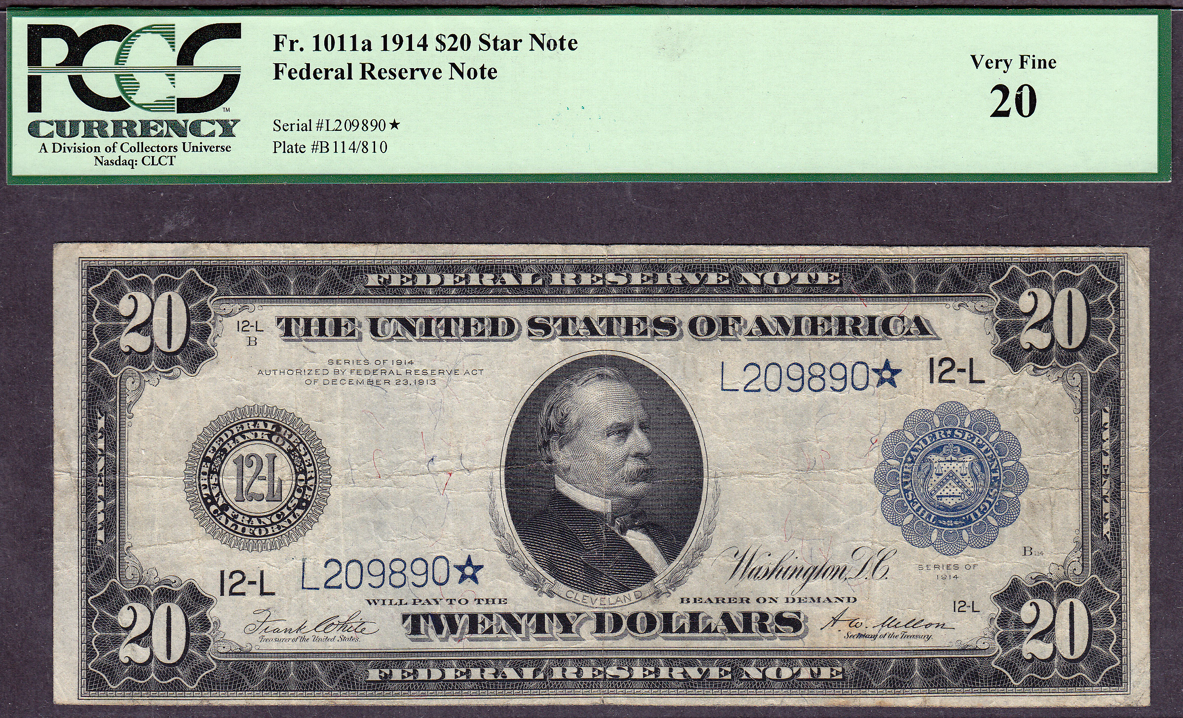 This is a nice rare 1914 $10 FRN Star from the San Francisco district. The serial # is L209890* and is graded as a PCGS VF-20 .There are only 15 known and I have two of them available on this web site. Although circulated there are no rips, tears or pinholes at all. No bad for a star note this old.