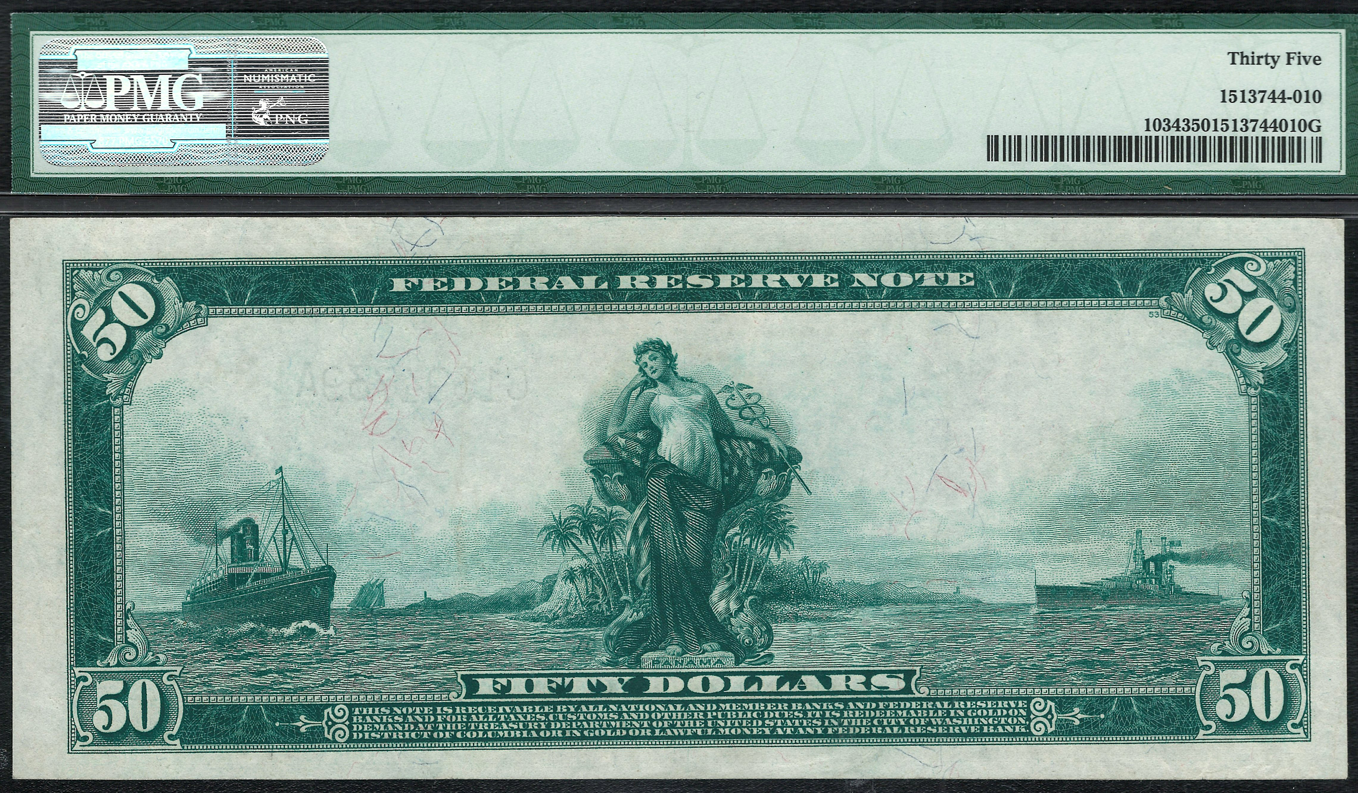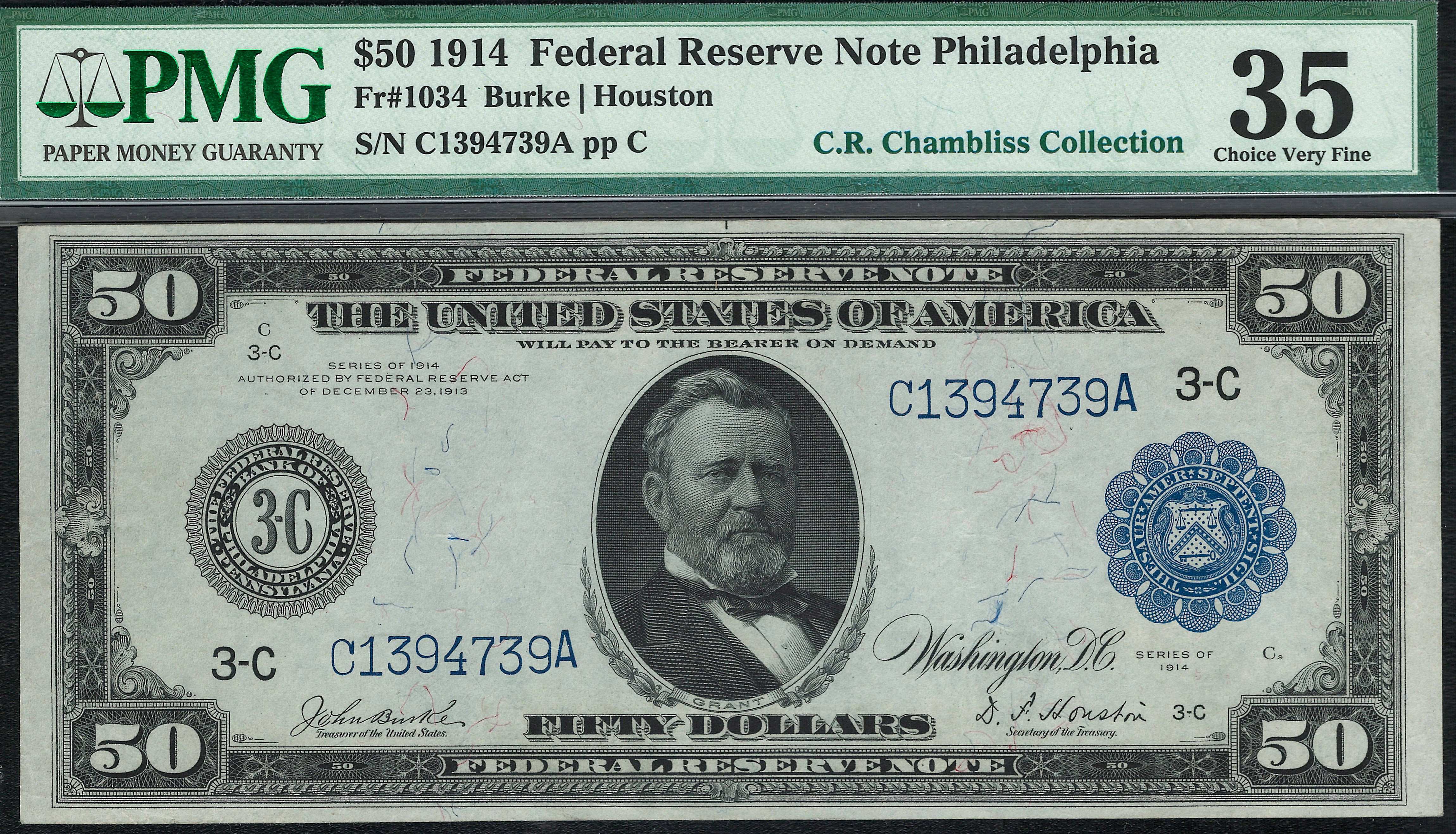 Fr.-1034 1914 $50 Philadelphia FRN (Blue Seal) Ser. C1394739A PMG VF 35
