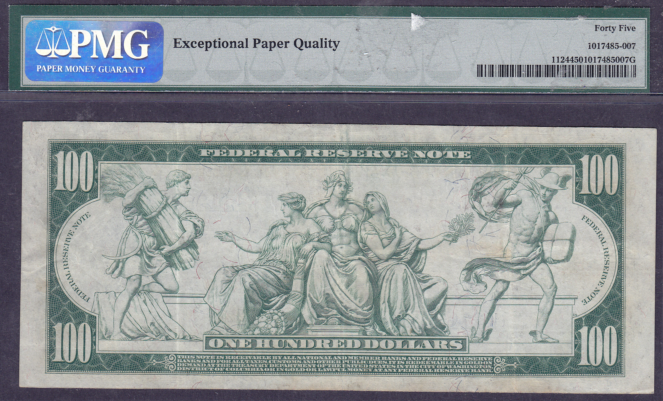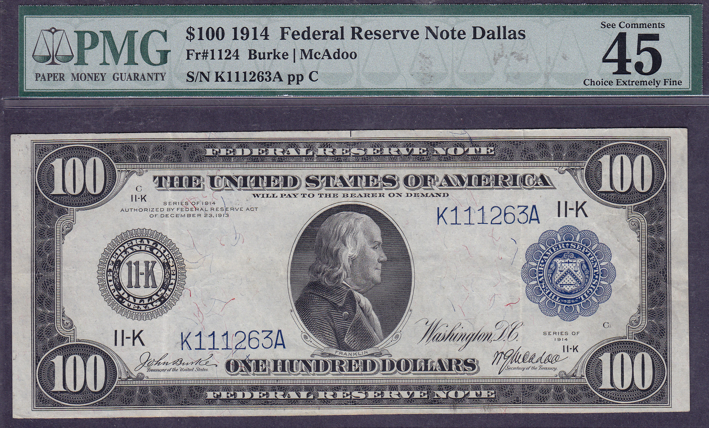 This is a nice 1914 $100 Dallas FRN with the serial # of K111263A. Ben Franklin graces the front.It is graded as a PMG EF-45EPQ. This is one of the few EPQ notes around. Most all of these 1914 $100 FRN notes were pressed and cleaned many years ago when it was acceptable to do so. This is the fourth finest Dallas known according to the PMG population report. There are only a few of these notes that are problem free and carry the "EPQ" designation. There are no rips, tears, pinholes or bank marks. Dallas is THE KEY DISTRICT of this series. You will be hard pressed to find a nicer note with this grade at this price. Look around and you will see.