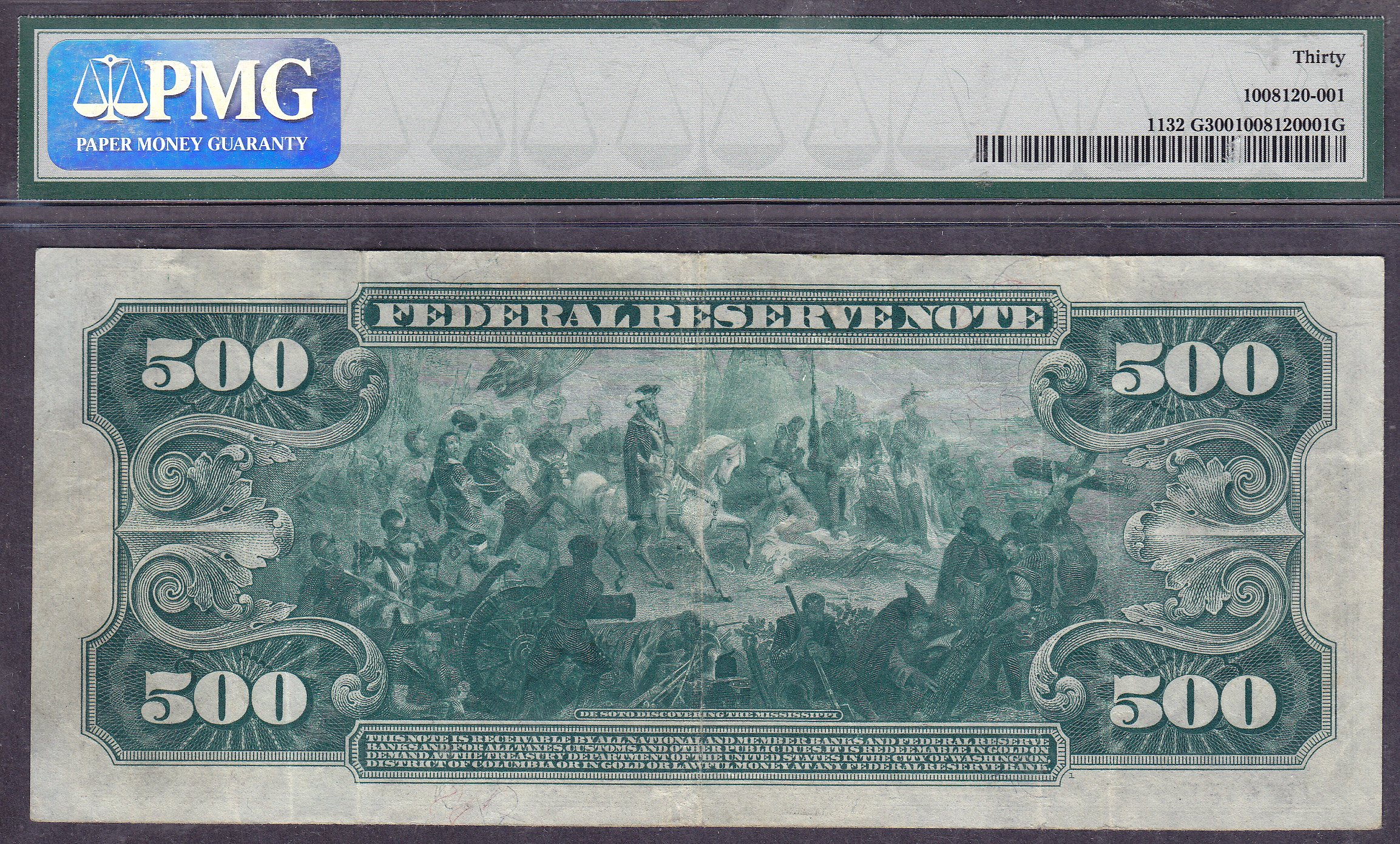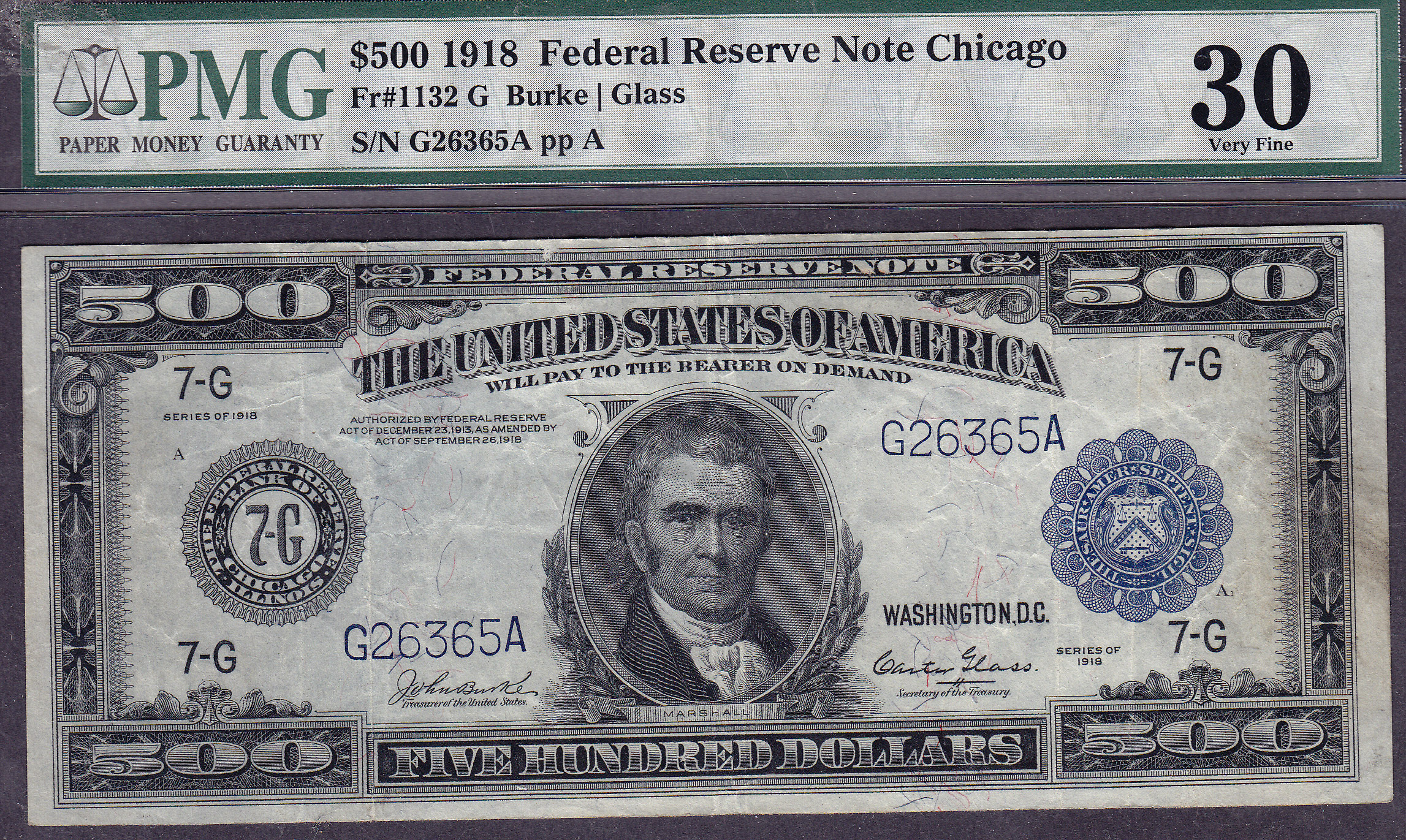 This is a very nice and "Totally Original" 1918 $500 Federal Reserve Note from the from the Windy City of Chicago. This note is also sometimes refered to as the Marshall Note. This note is the second finest graded by PMG. It features great body firmness and decent margins on both sides. It is graded as a PMG VF-30. Notice the boardwalk margins on the reverse. This is one of the few no-problem VF notes available. Almost all of the uncirculated or high grade almost uncirculated 1918 $500 and $1,000 FRN notes were purchased by an overseas buyer when Lyn Knight auctioned off the famous Rickey Collection of 1918 $500 and $1,000 FRNs several years ago in Chicago. Most of the lower graded have splits, tears or repairs.
