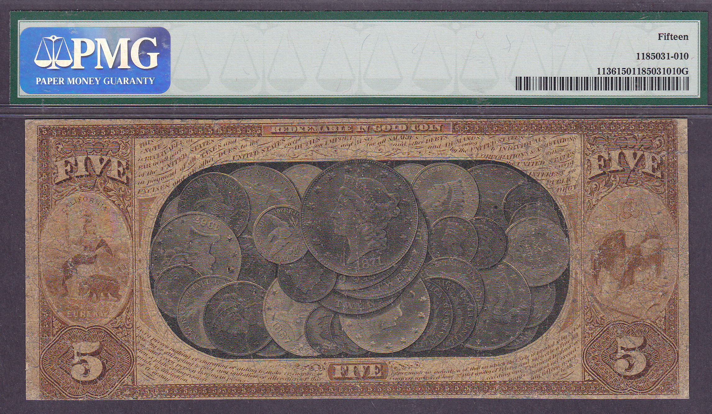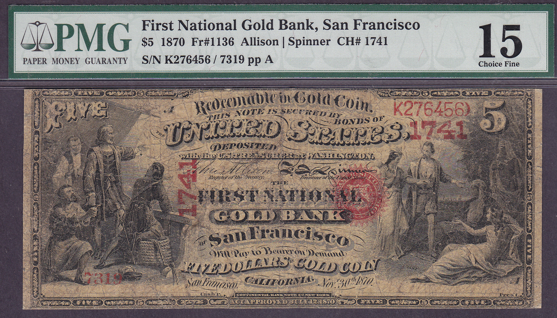 This is a 1870 $5 Gold Coin Note From The First National Gold Bank of San Francisco, California. This is the famous Gold Coin Note named because of its back design which shows many gold coins. These are very rare notes in any condition. I don't care what PMG states on their holder this is a Very Fine Note...all day! It doesn not matter how much money you have, you simply don't see these notes appear anywhere at any cost. They are highly sought after and collectiable. The charter number is 1741 and the serial number is 7319.
