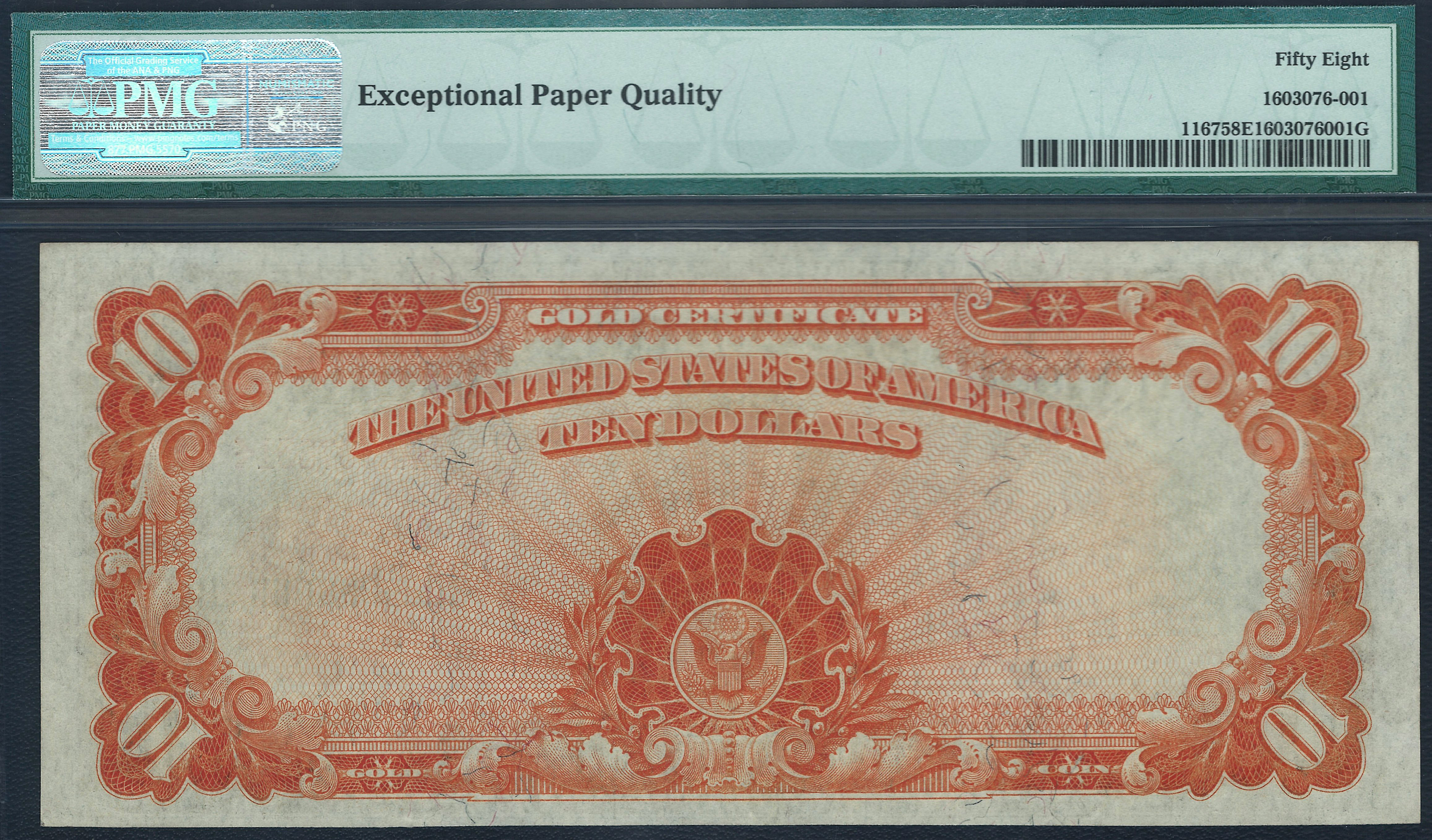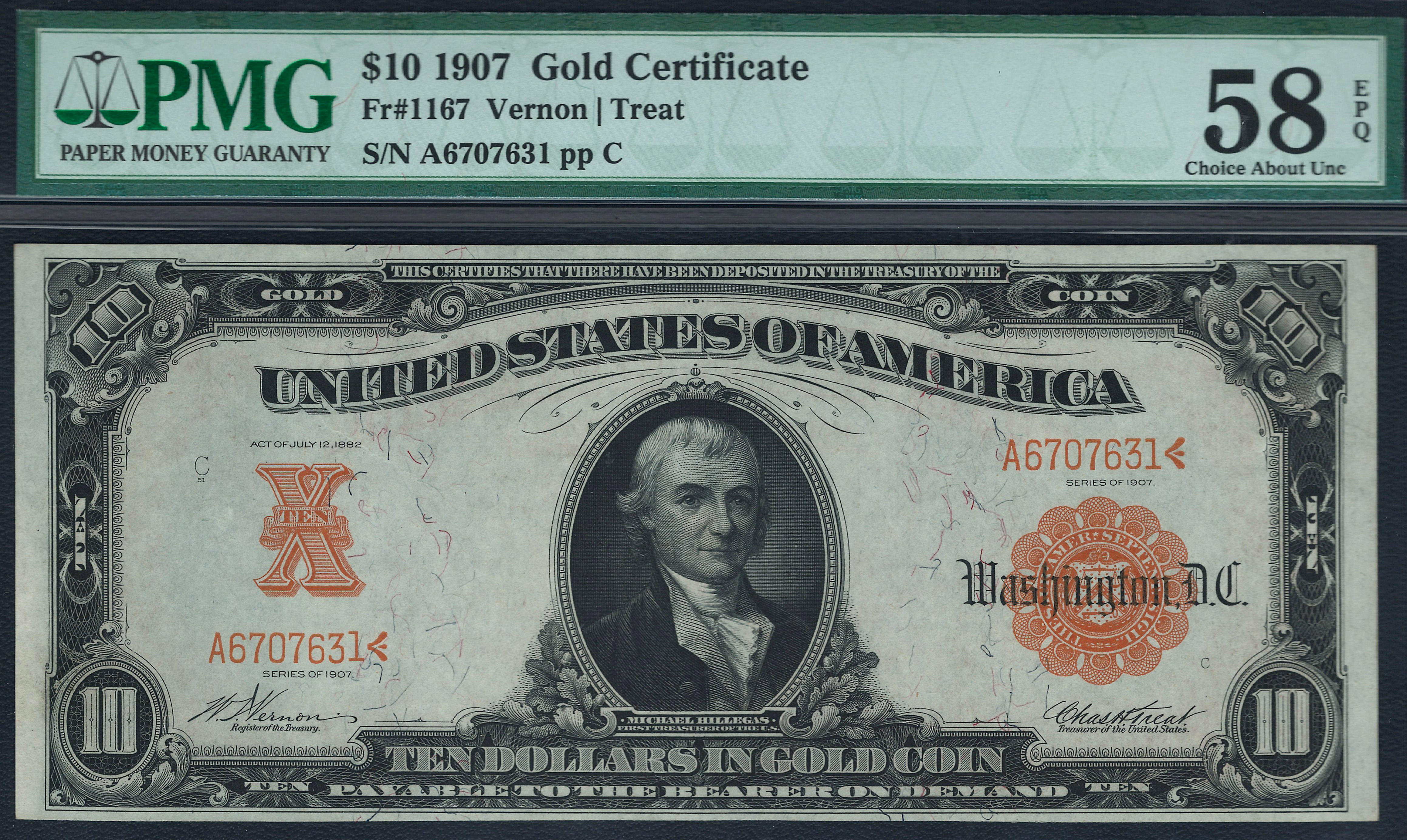This is the Fr.-1167 or a 1907 $10 Gold Certificates which features the Vernon and Treat signature combination. It is in a PMG-58EPQ holder with a serial number A6707631.You will be hard to find any of these gold certificates in AU with the EPQ designation. Most of them have been cleaned and pressed out. The large size $10 gold certificate only had two issues, the 1907 and 1922 and both featured the bust of Michael Hillegas, the first Treasury of the US on the face. This note has no rips, tears, pinholes or marks. Great price for a great original 1907 gold certificate.