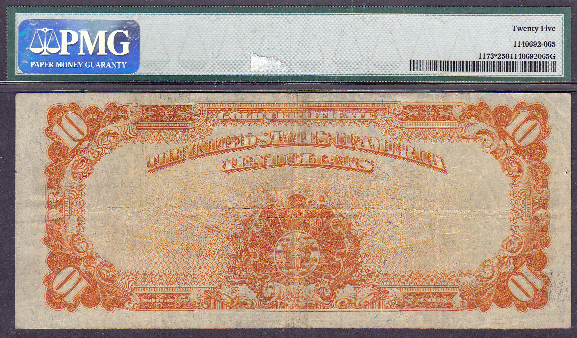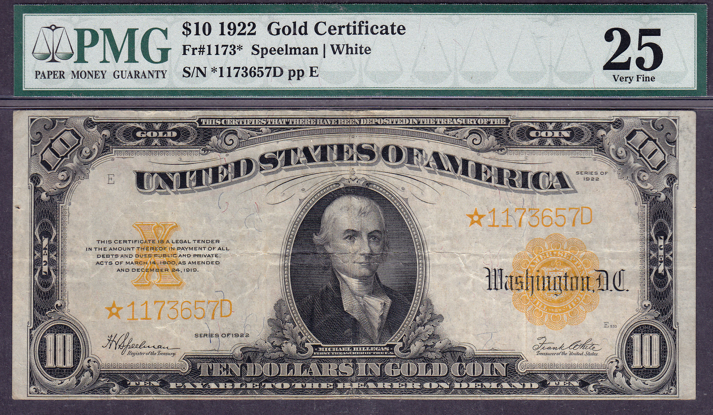 How about a 1922 $10 Gold Certificate Star note. This is a very clean lightly circulated example with no problems at all. There are no rips, tears,or bank stamps. The four corners are intact and the burnt-orange goldish color has not faded as so many have. There is a small pinhole in the left margin that does not go into or near the design. Want some neatness....How about the first 4 digits of the serial number is the same as the Freidburg number which is *1173. The serial number is *1173657D and it is in a PMG Vf-25 holder. Here is a great type note for the collector. I just reduced the price from $1350 to $950 for this sale. First come gets it.