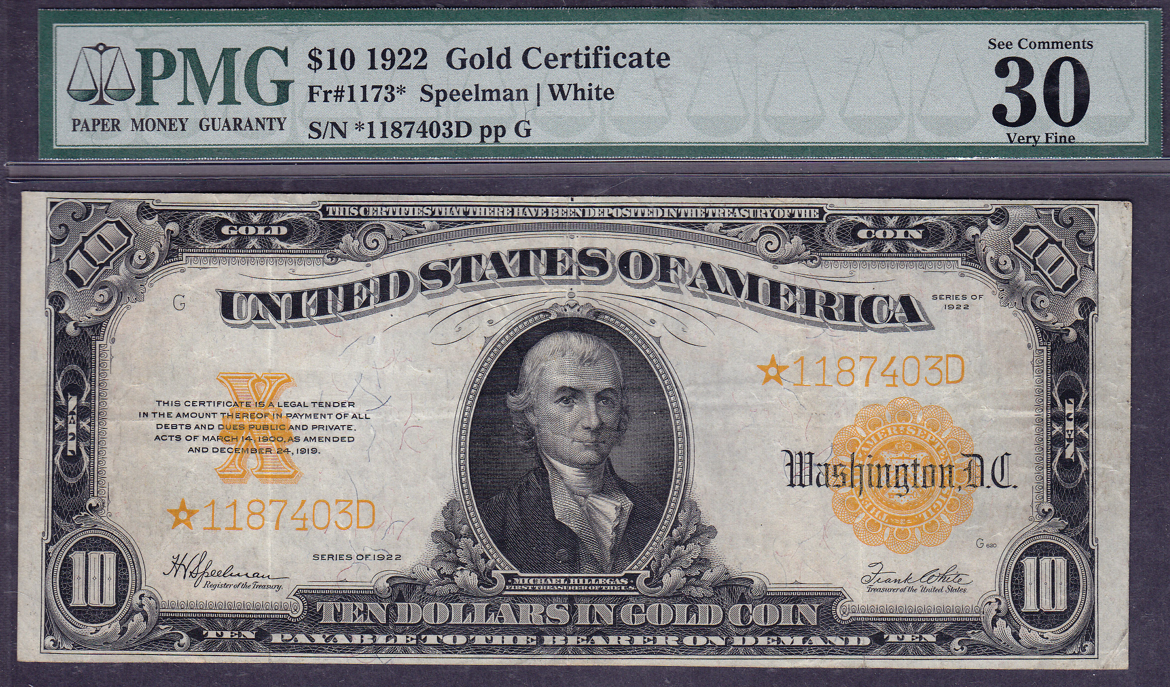 How about a 1922 $10 Gold Certificate Star note. This is a very clean lightly circulated example with no problems at all. It carries the PMG EPQ notation which means that it is 100% original. The scans will speak for themselves. There are no rips, tears, pinholes.
