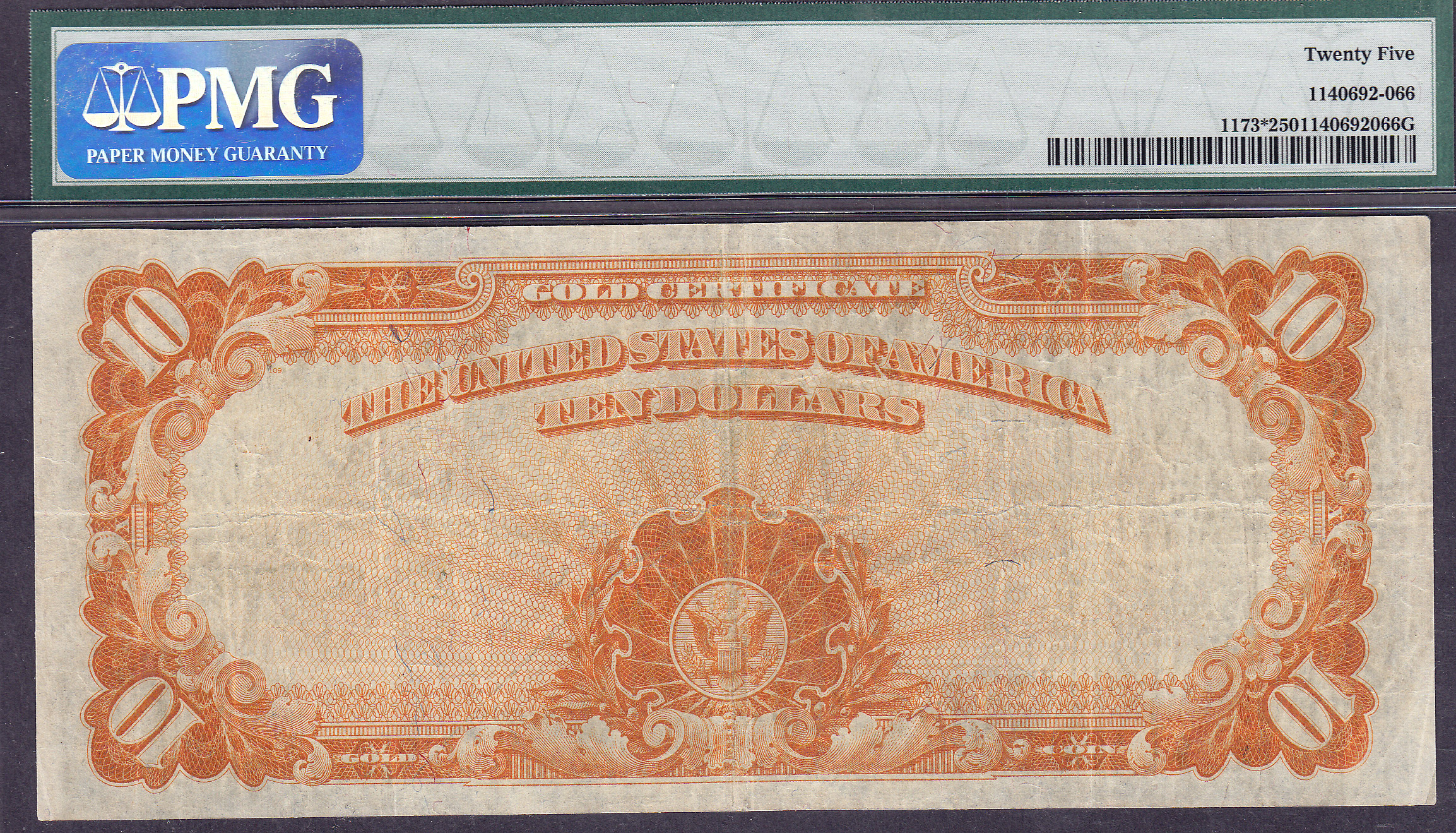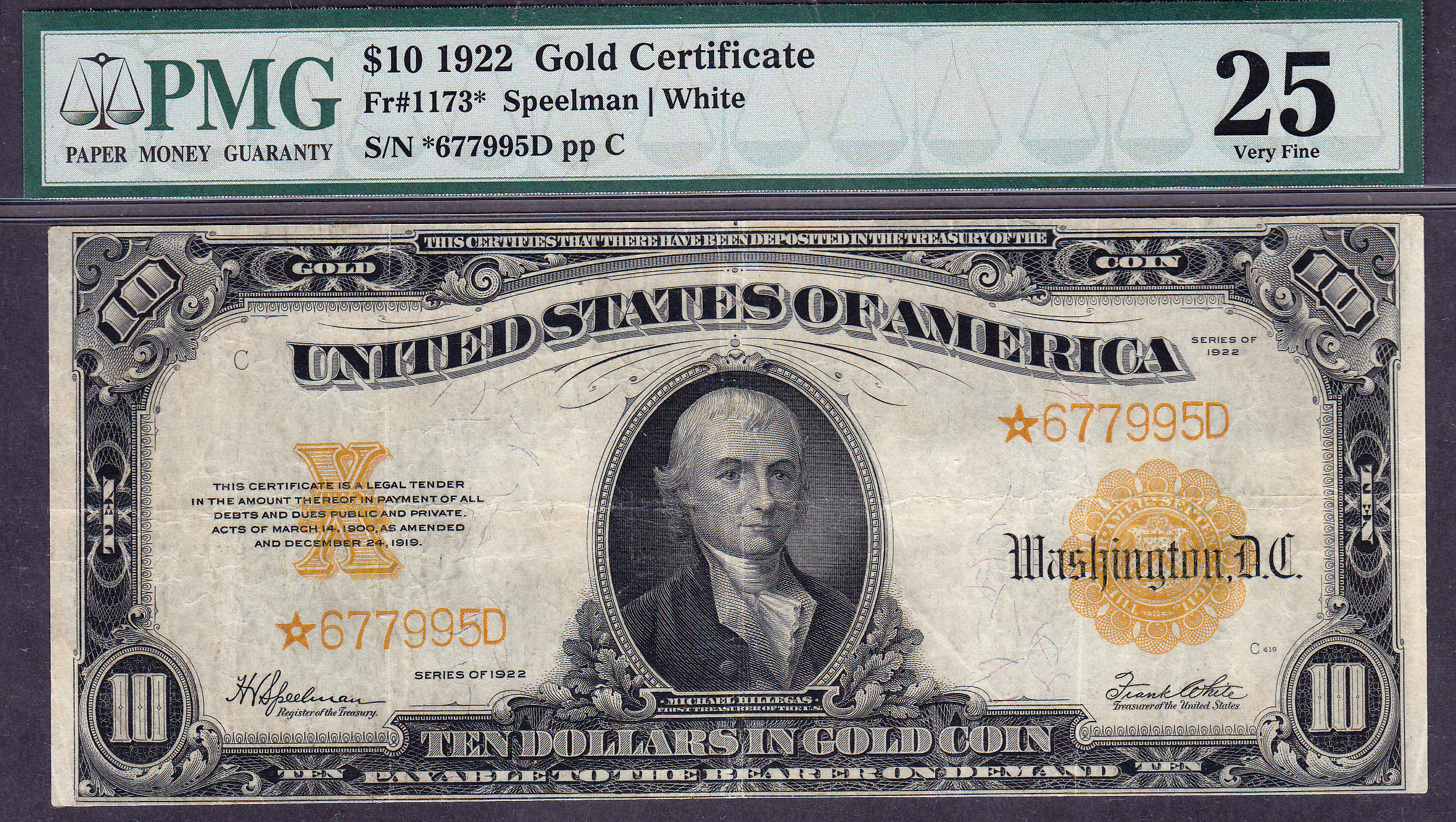 How about a 1922 $10 Gold Certificate Star note. This is a very clean circulated example with no problems at all. There are no rips, tears, pinholes or bank stamps. The four corners are intact and the burnt-orange color has not faded as so many have. The serial number is *677995D and it is in a PMG VF-25 holder. I just reduced the price from $1350 to $950 for someone who notices it first.