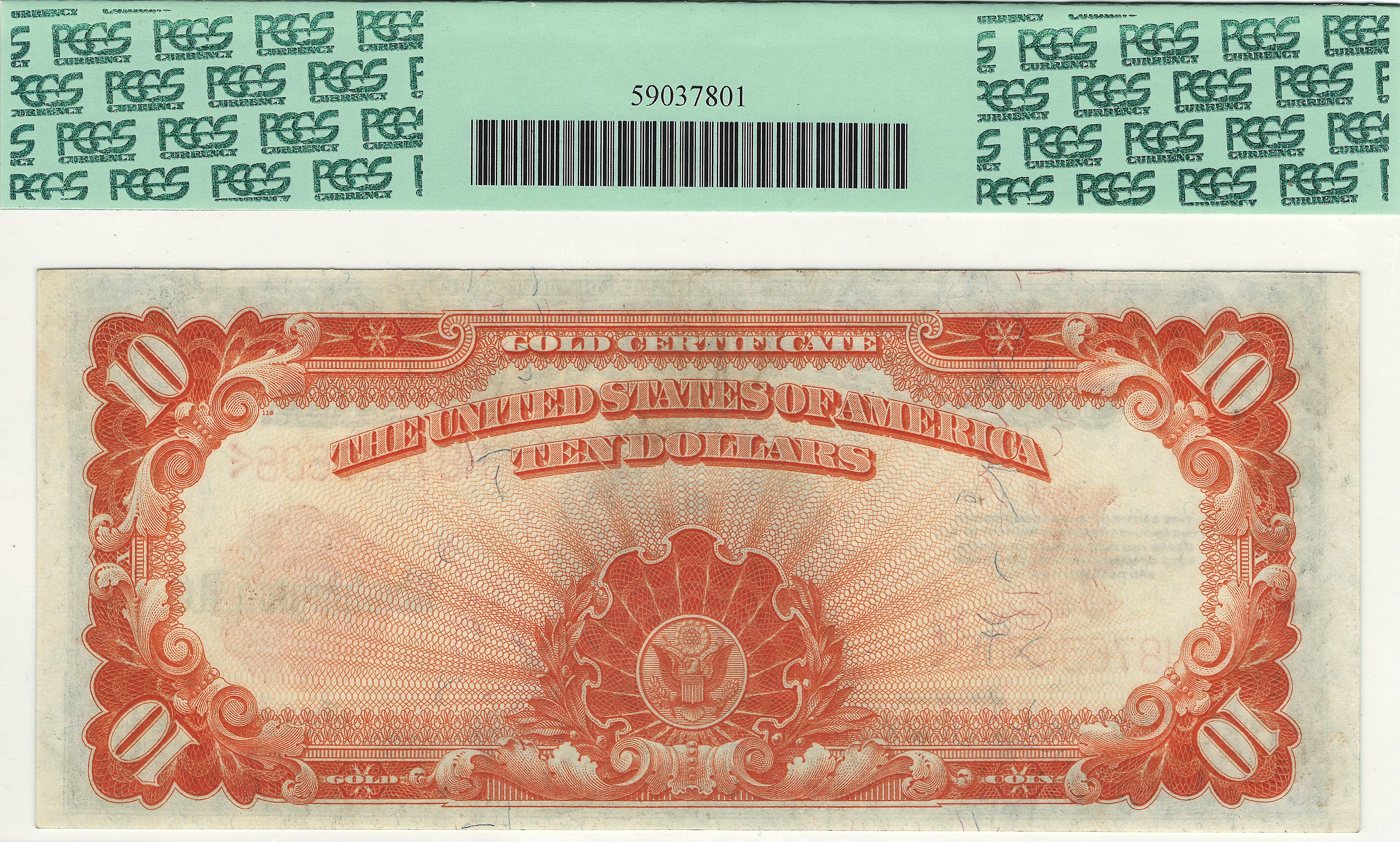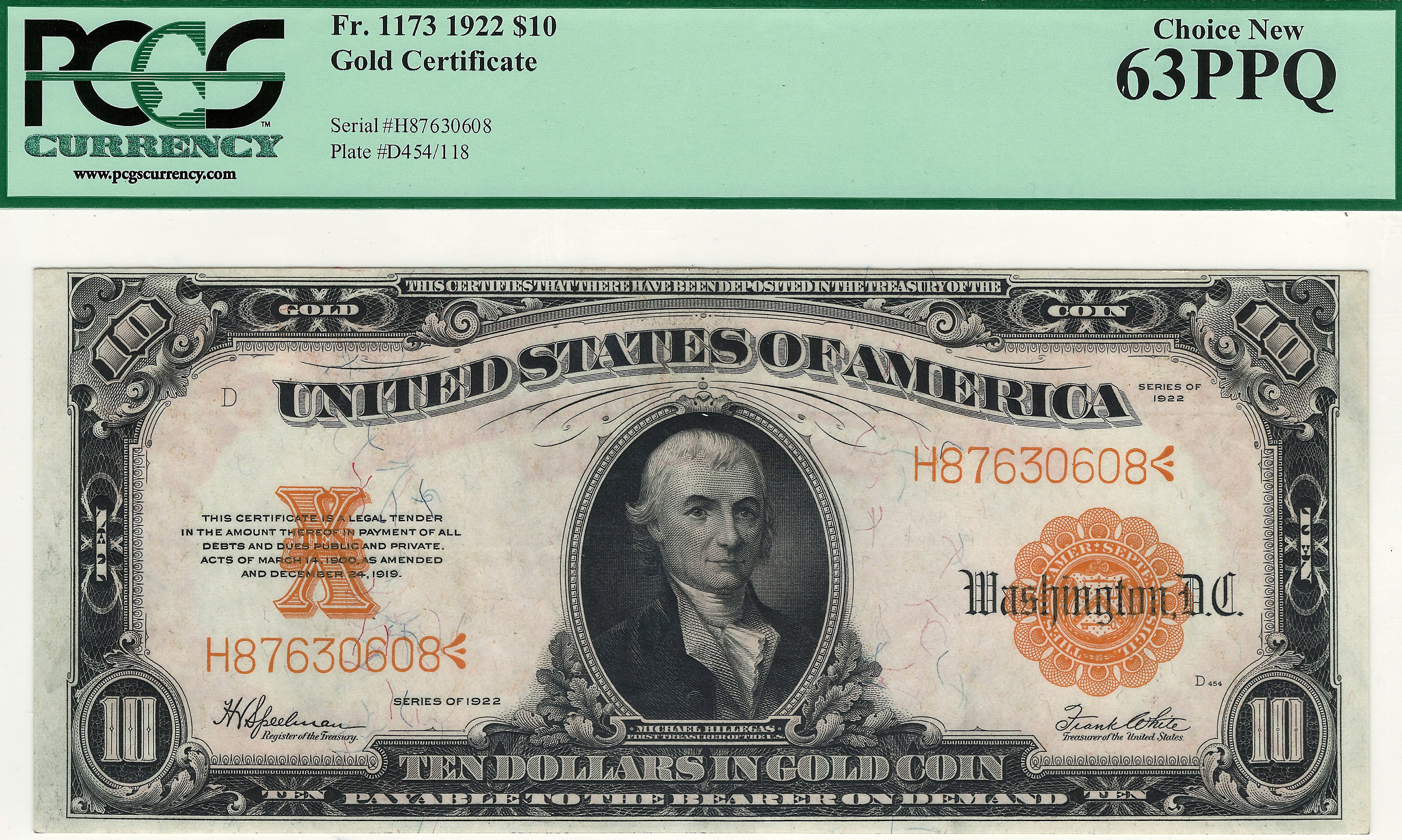 This is a new purcash from the Chicago show. It is a very nice original and Uncirculated 1922 $10 Gold Certificate. The bust of Michael Hillegas, the first Treasury of the United States graces the front. The serial numer is H87630608 and it resides in a PCGS-63PPQ holder. There are no rips, tears, pinholes or folds on this beauty. As the large scans will show you the golden inks are as fresh and vivid as the day it was printed over 90 years ago.