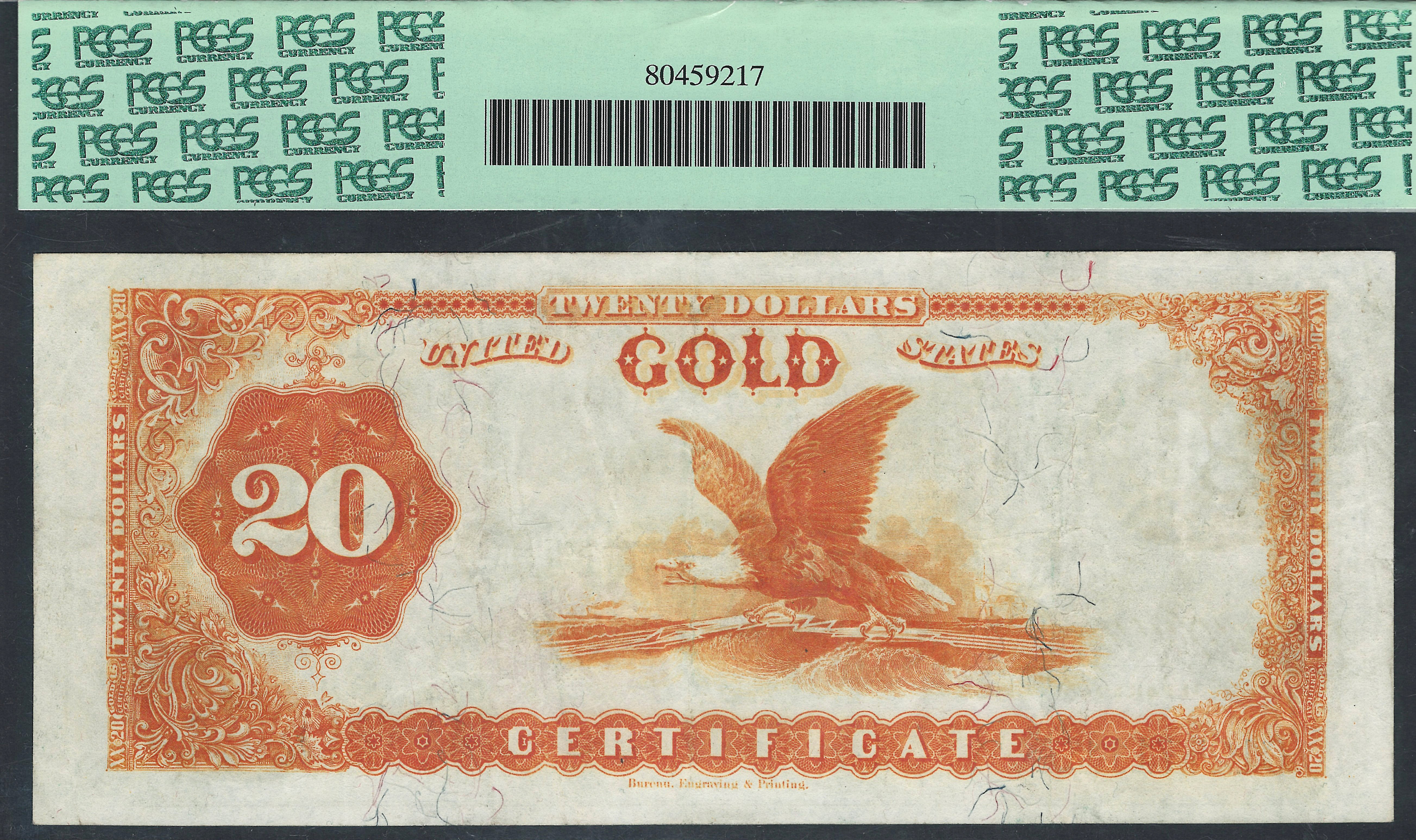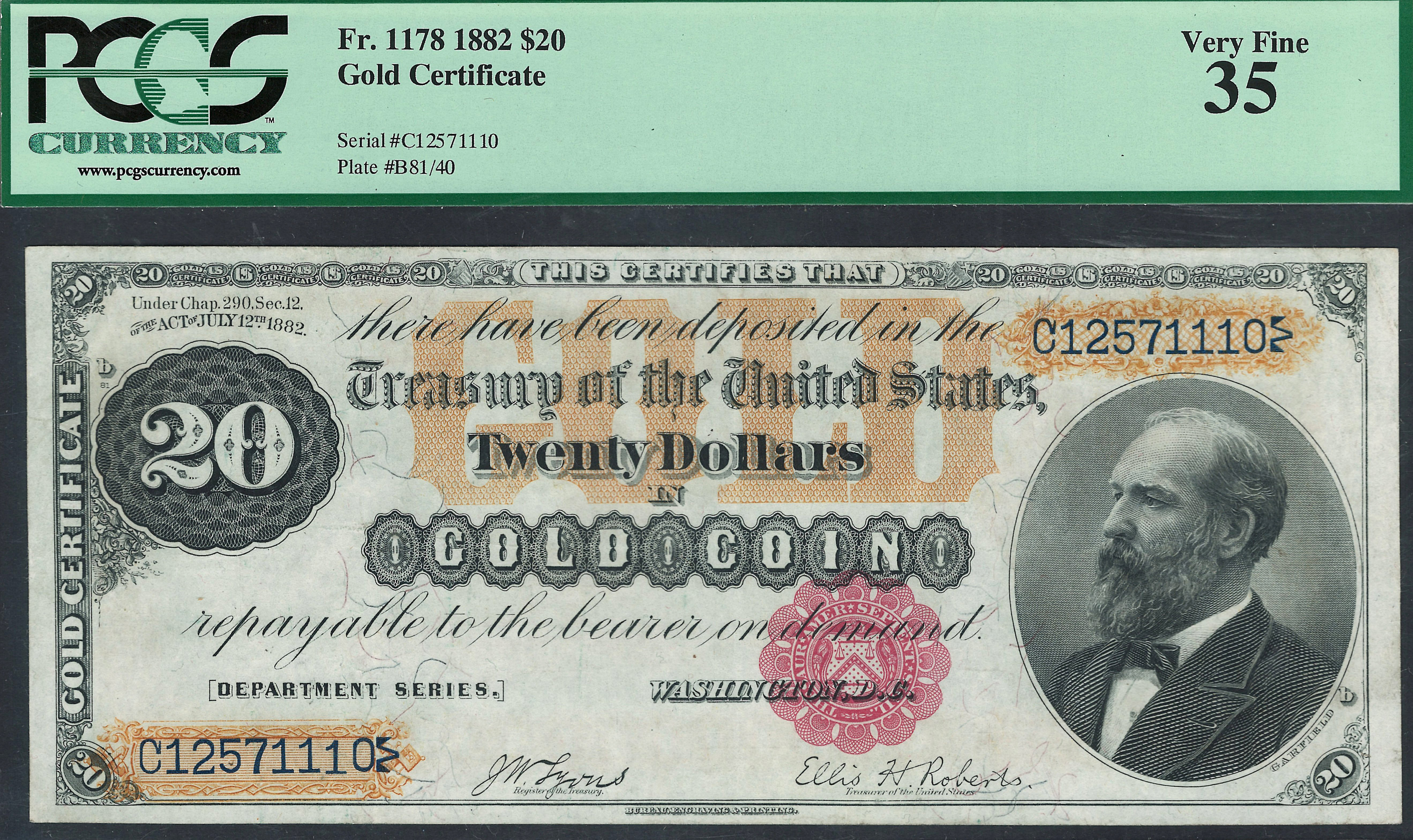Here is one of those tough notes that I really like. This 1882 $20 gold certificate is vastly under graded and under appreciated. Look at the large scans for yourself. Nice corners, no soiling and no bank marks, no pinholes. However it is what it is. 1882 Gold Certs of any denomination is hard to come by in a decent plausible grade. This one has no rips, tears, pinholes or bank marks. The serial number is C12571110 and is in a PCGS-35 holder. Nice grade and a very nice price.