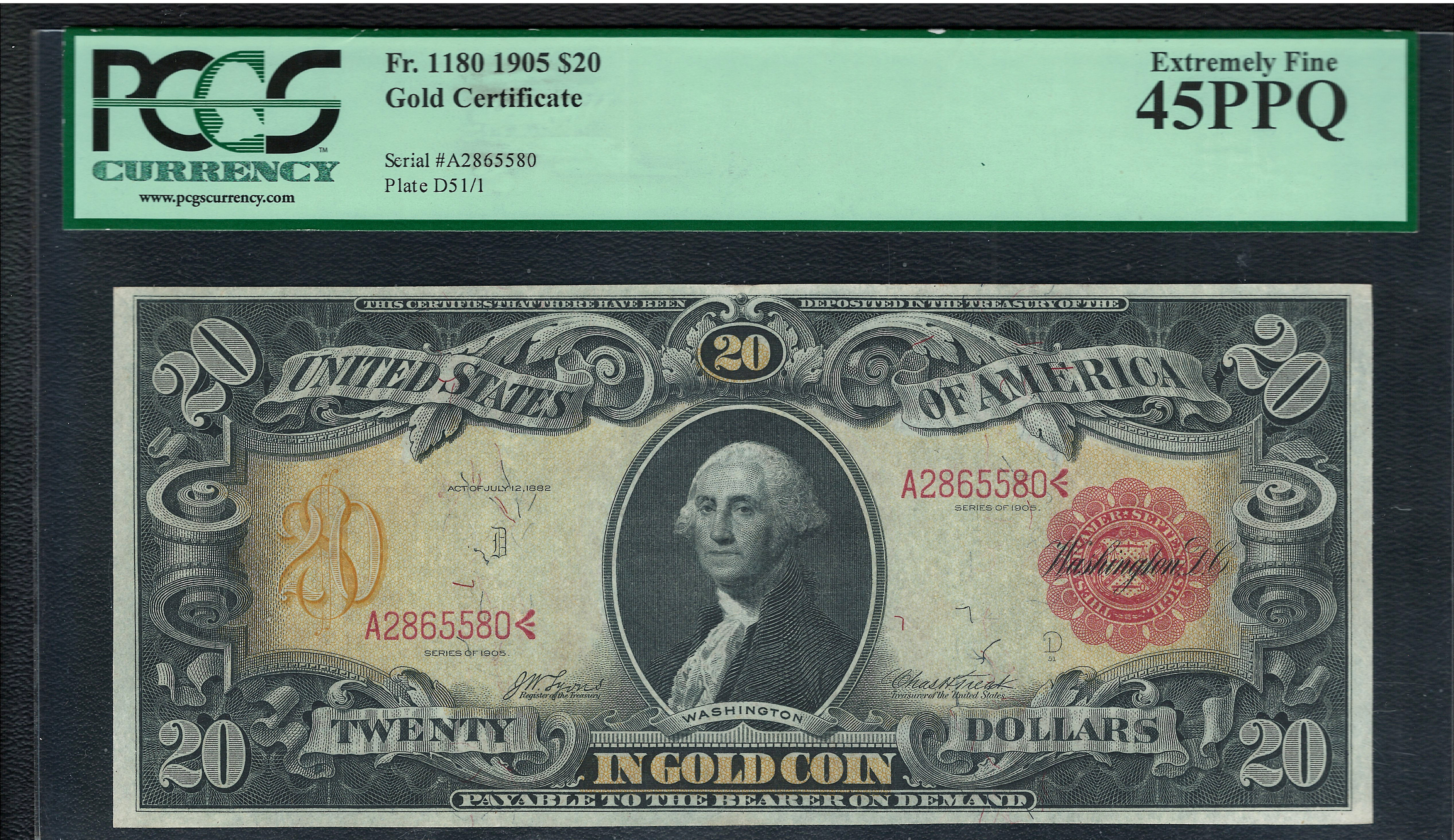 Most collectors do not own a Technicolor note because of the prohibitive cost. The 1905 series consist of a good amount of low graded doctored notes from VG to VF and a run of high end GEM notes that sell upwards of $50,000 to over $70,000. There are very few Extra Fine to AU notes with the PPQ/EPQ designation. Most of these Technicolor’s have been cleaned or pressed out over the years and now lack originality. With GEM notes reaching and exceeding $70,000 there is a big demand for mid grade notes that have retained their originality and have never been doctored. This is one of the few I have seen. When I first saw this note, I did a double take and examined it very carefully. Believe it or not it is totally original with embossing and nice paper wave. There are no rips, tears, pinholes, edge nicks, spots or bank stamps. This is one of those notes I had to have if the price was even close to what I needed to pay for it. After a bit of hard negotiating I did acquired it!