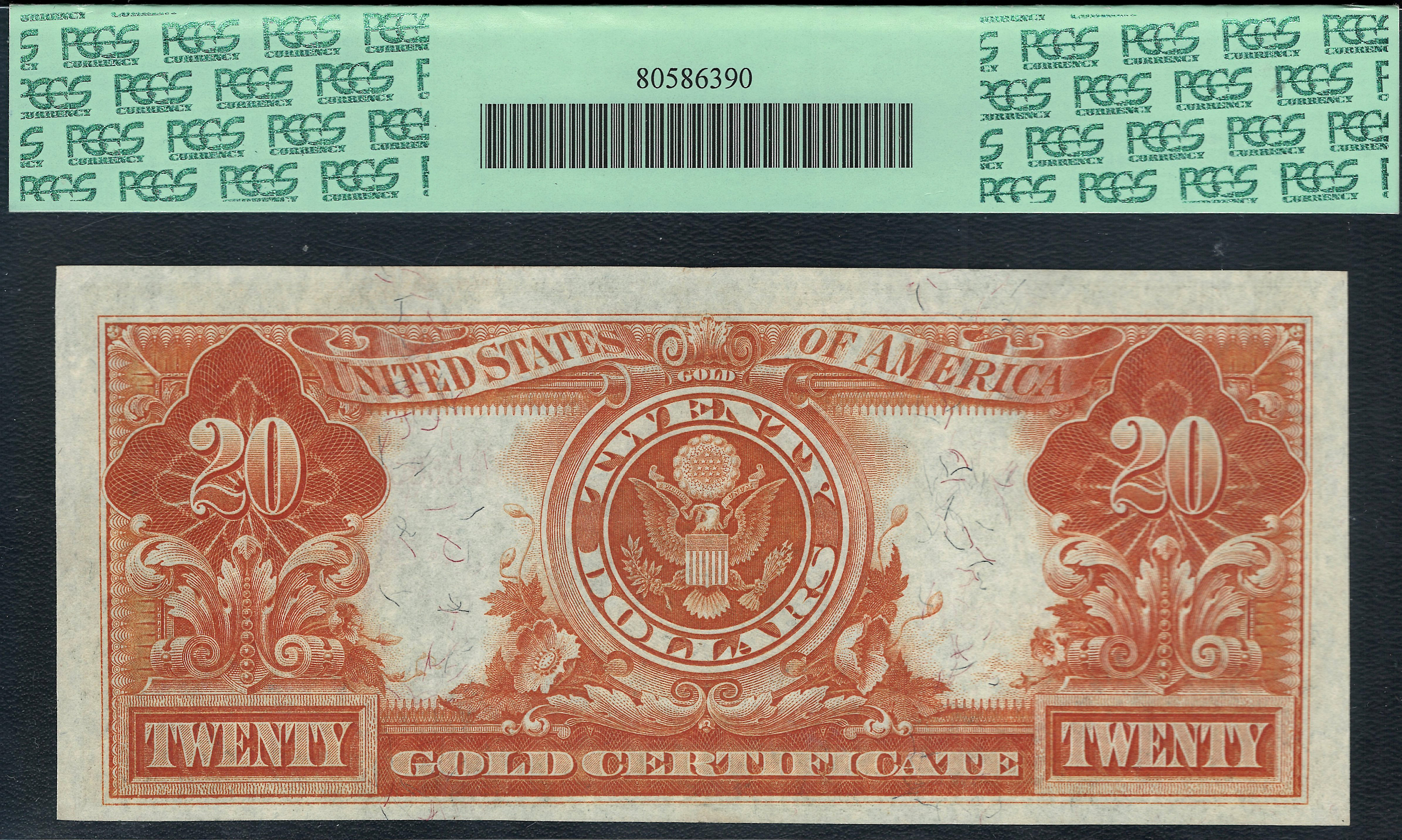 Look very carefully on the large scans on the front. You will notice the very distinctive dark yellow and gold hue throughout the front. It even covers the “IN GOLD COIN” wording at the bottom. This is a perfect example of what a good Technicolor note should look like! This note was obviously folded and put away many years ago with very little if any circulation. You can tell because there is no soil in the folds and the corners have no folds such as what you would expect if it went into circulation. This is a rare grade for that collector that has been waiting for a great example to appear that won’t break his bankroll. The serial number is A2865580 and it is in a PCGS-45PPQ holder. I also once owned the note before this one serial #A2865579 which was in a PCGS-40EPQ holder.