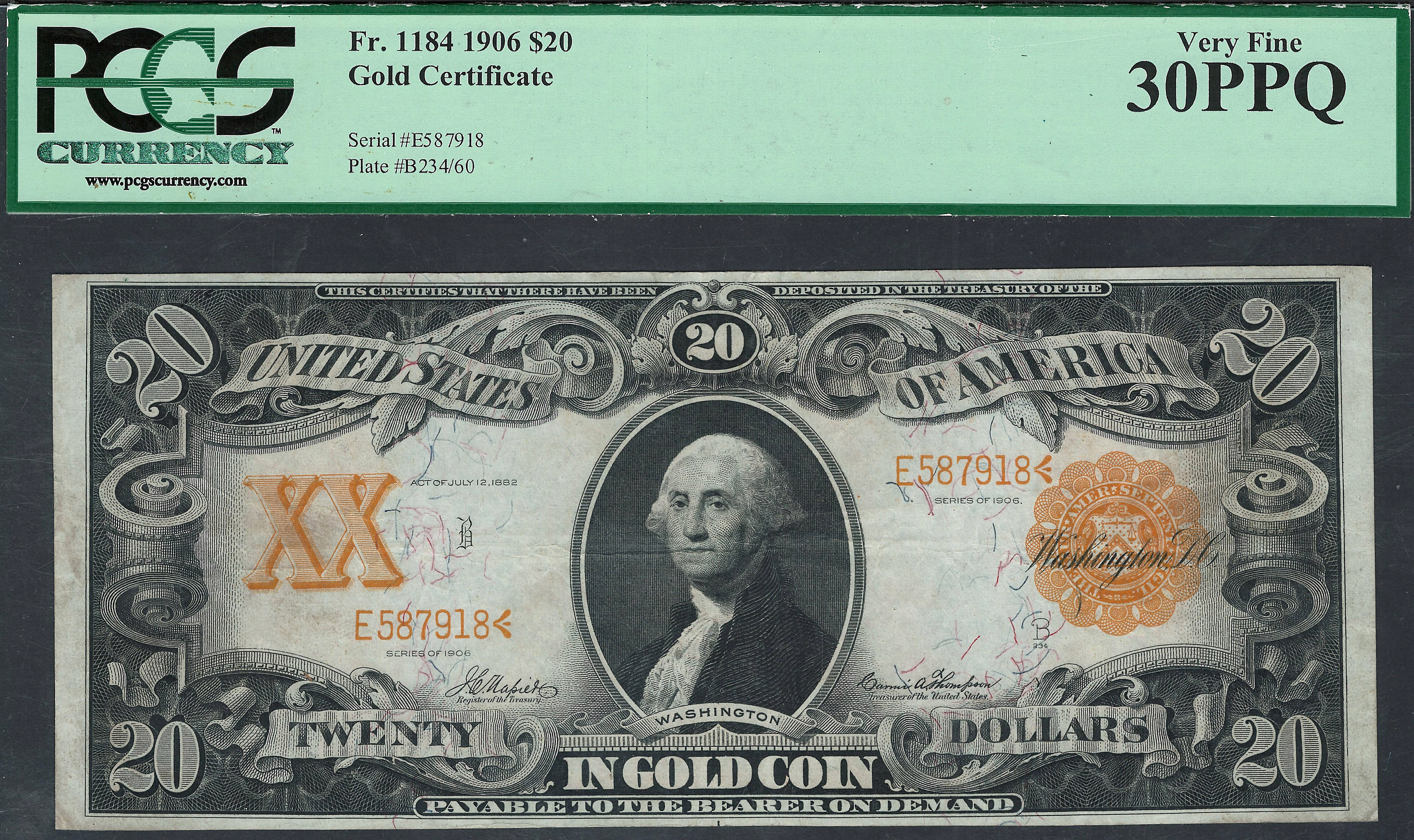 This is the scarcer 1906 Fr-1184 variety, not to be confused with the Fr-1185 variety 1906 $20 Gold Certificate. It was a one year issue. This is one of the very few PPQ notes that PCGS has graded. The 1906 gold certificate had 5 different signature combinations and this one has the Teehee and Burke signature combination. The serial number is E587918 and is in a PCGS-30PPQ holder. It is getting harder and harder to find any mid graded 30PPQ/EPQ to 58PPQ/EPQ gold certificates. Most of them have been pressed and washed out and are flat. When I do find the PPQ/EPQ notes I buy them fast as they are disappearing from the market at a rapid rate.