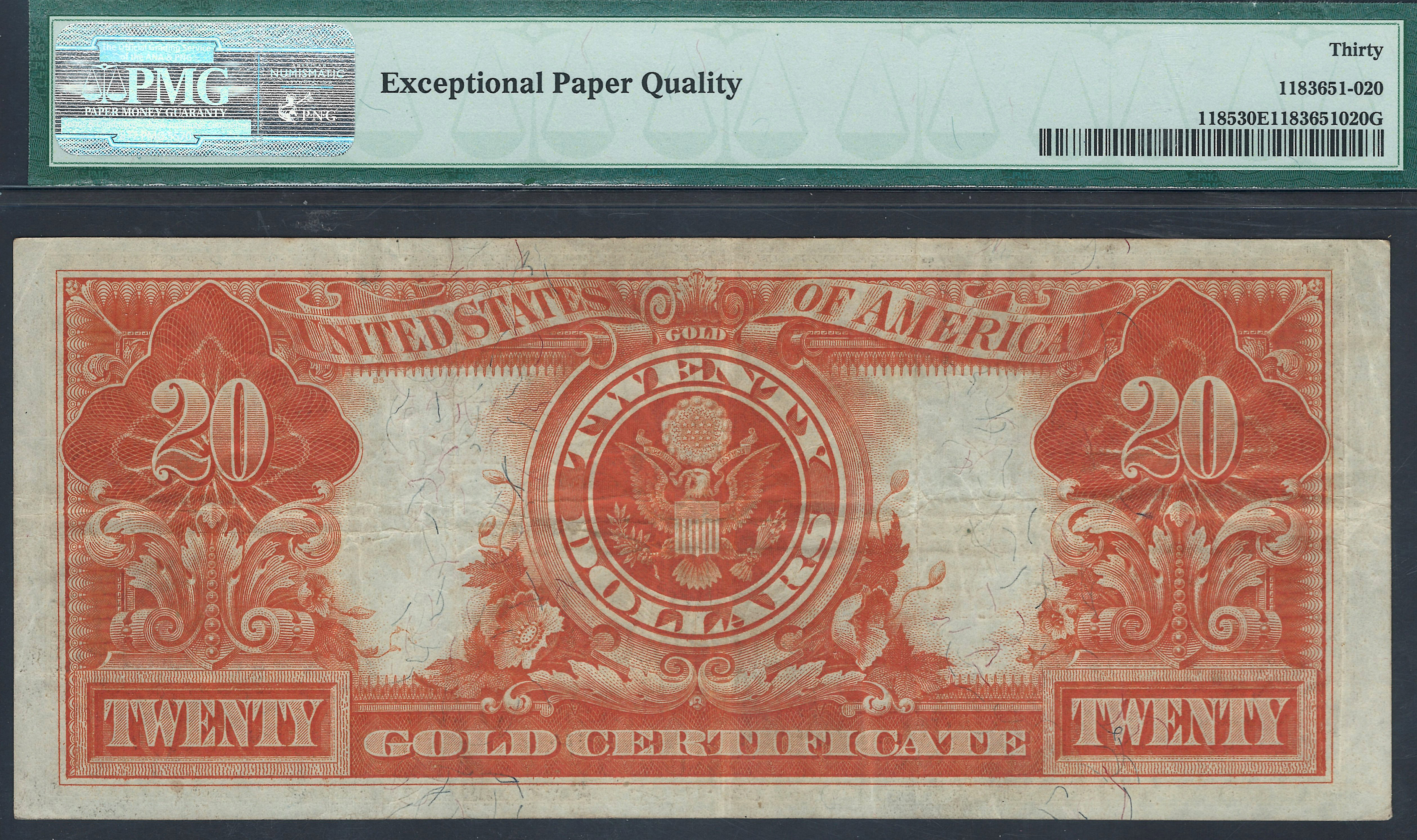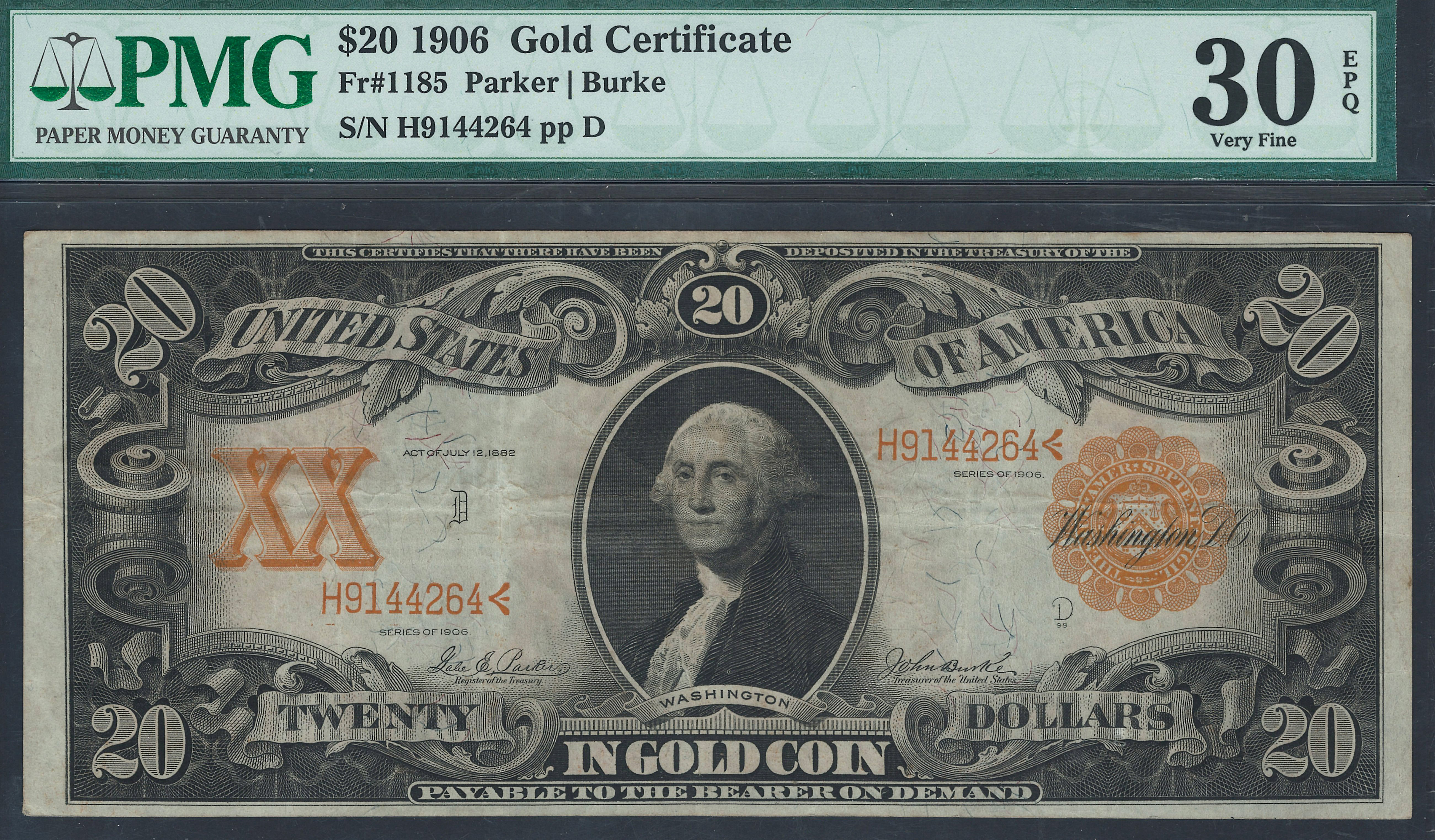 This is a Fr.-1185 also known as the 1906 $20 Gold Certificate. The Ser. is 9144264 and it resides in a PMG VF-30EPQ holder. There are no rips, tears, pinholes, heavy soiling or bank marks. This would make a very nice type note. The 1906 issue was a one year issue and is a very popular gold certificate.