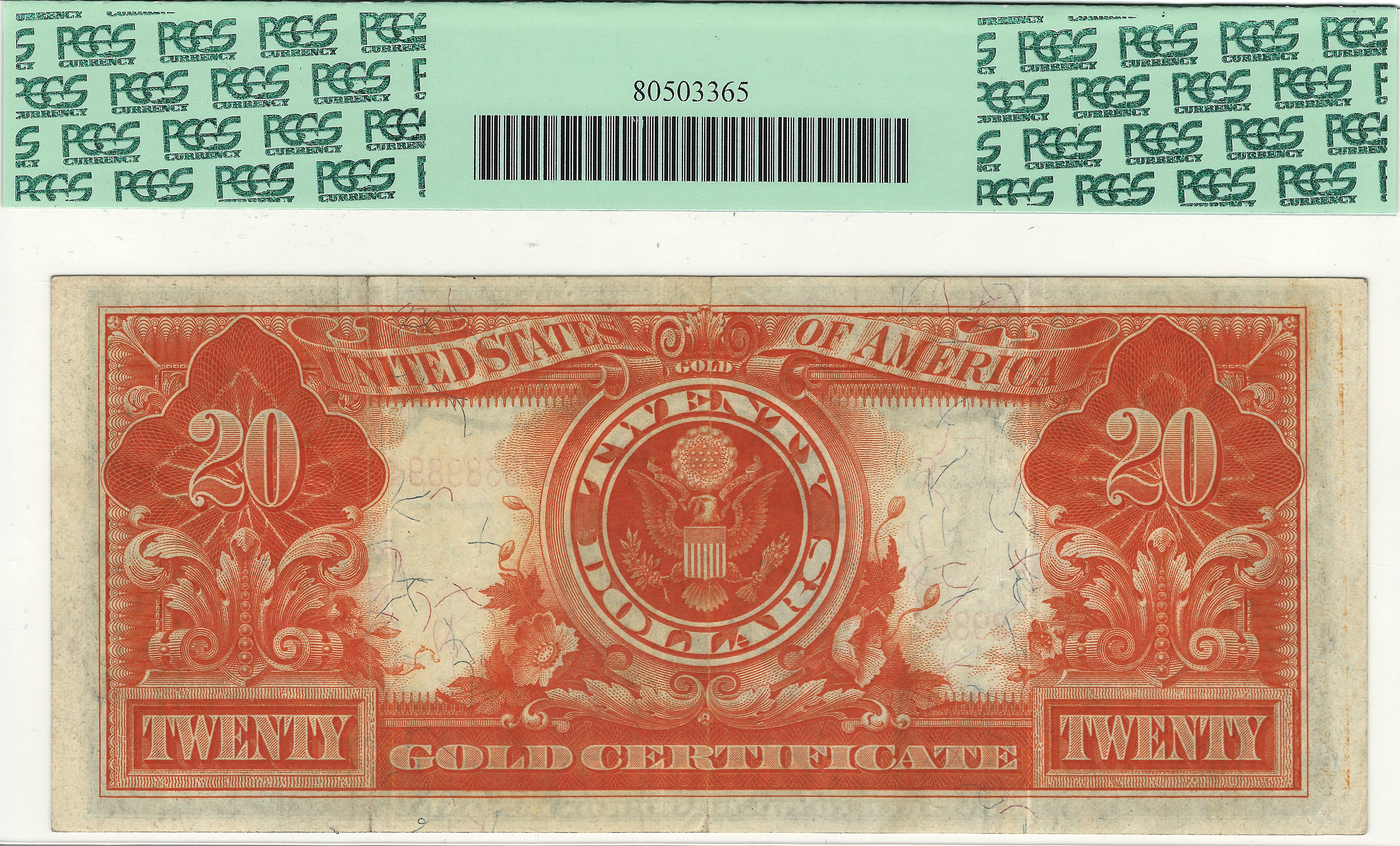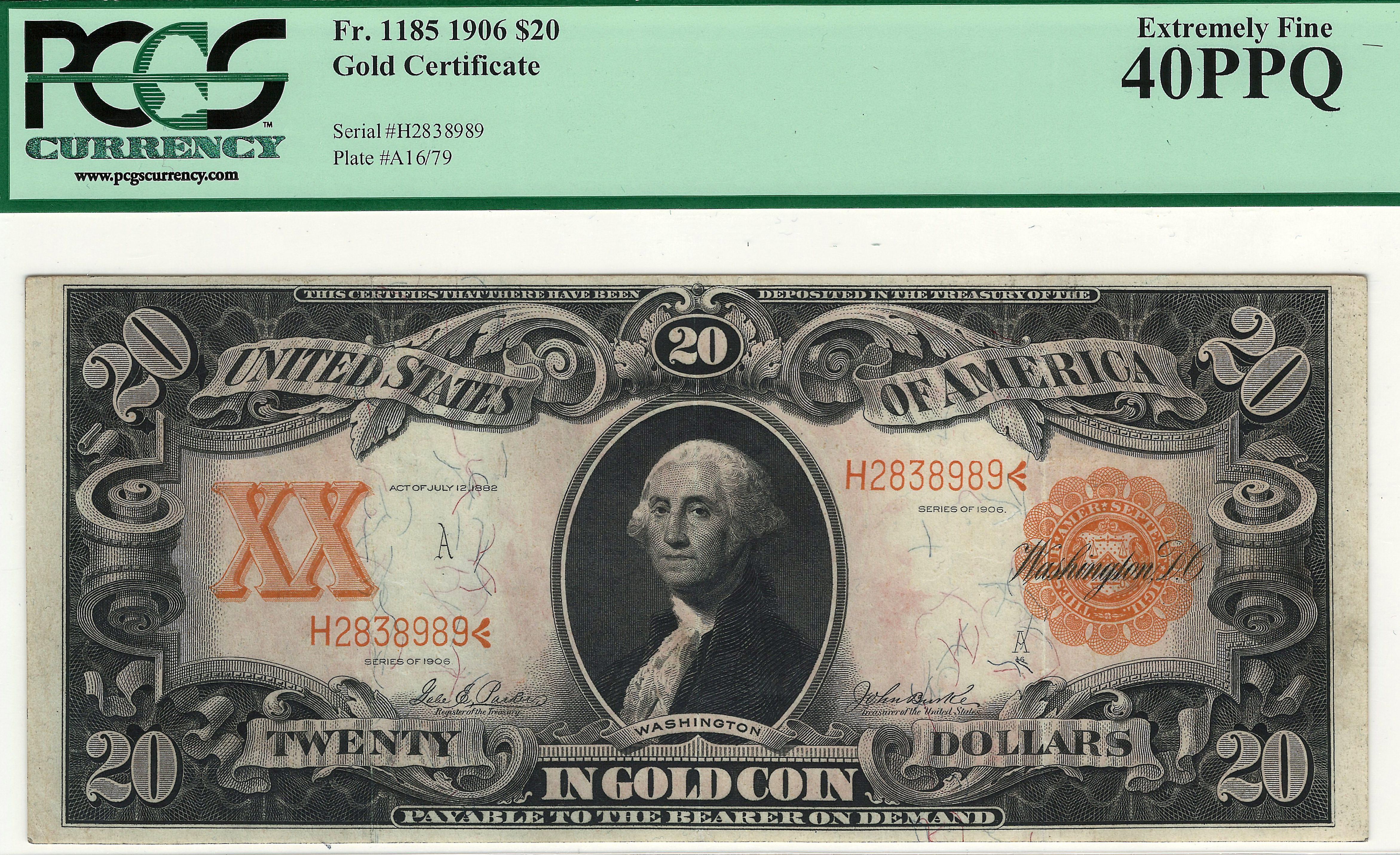 This is a real nice example of the 1906 $20 Gold Certificate. It is a one year issue with four differ3ent signature combinations. It features the head of George Washington and the small gold scalloped seal on the right. The reverse is the same design as the 1905 and 1922 issues. What attracted me to this particuliar note was it originality and the bright burn-golden colors on the reverse. Most of these gold notes were pressed out and cleaned years ago. Once the gold certificates were cleaned the color faded and embossing flattened. This example has never been pressed or cleaned. It is totally original. There are NO rips, tears, pinholes, edge nicks or bank marks anywhere. You will notice the nice paper wave from the reverse. You want to see that for any original note. The serial number is H2838989 and it is housed in a nice PCGS-40PPQ holder. This would make a superb example for a nice original mid grade collection.