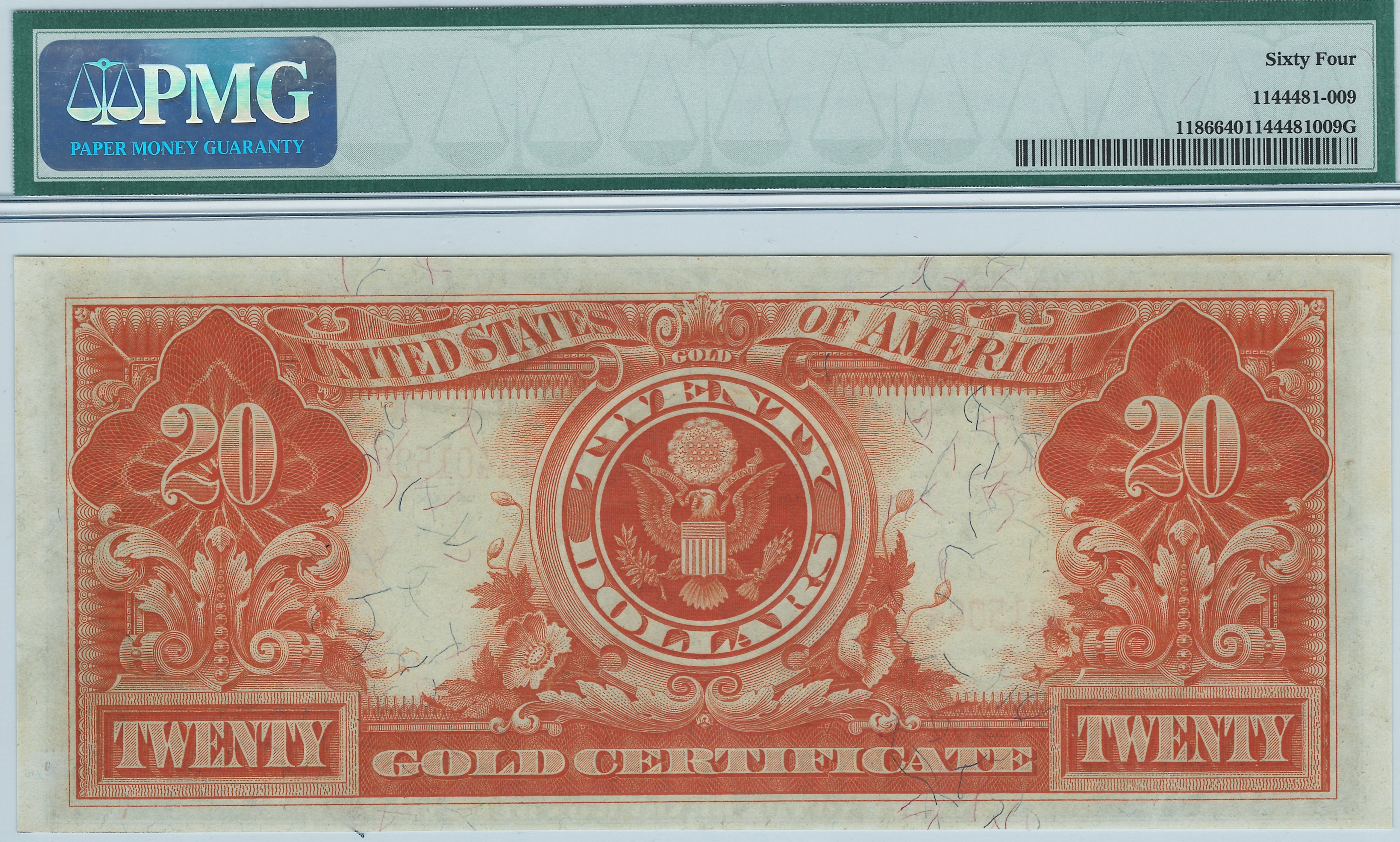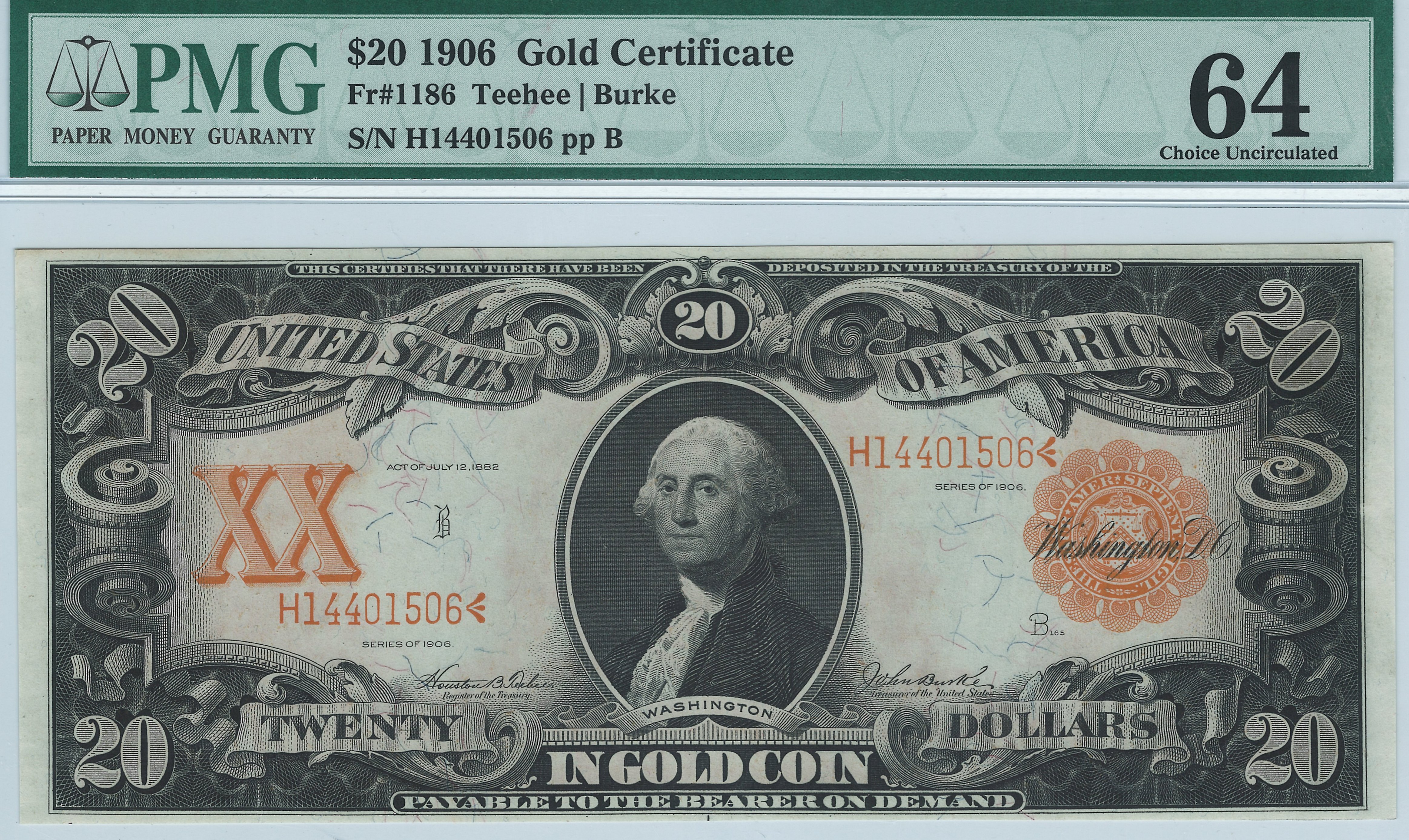 The 1906 $20 Gold Certificate is a one year issue note. This example is one of the nicer ones I have owned. The front margins are near perfect but check out the large even boardwalk margins on the reverse. That is what makes this example so nice. The deep golden burnt-orange color is so vivid it jumps out at you. I am not sure why this did not get a EPQ, maybe it was one of the first ones turned in before PMG gave out EPQ designations. PMG did not use EPQ for their first six months in existence. It does not matter because there are no rips, tears, pinholes or any other issue I can see. The serial number is H14401506 and it is in a Choice Uncirculated PMG-64 holder.