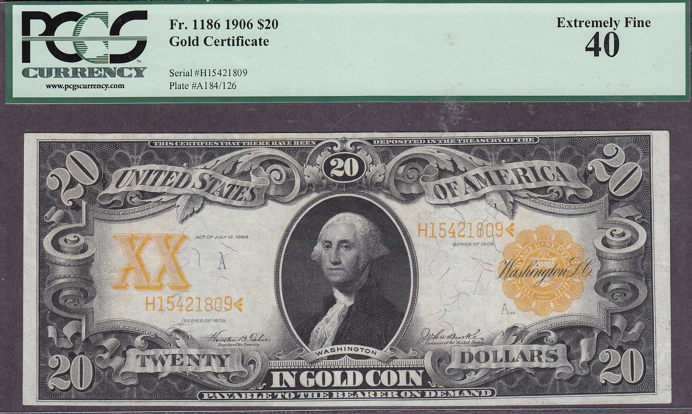 Fr.-1186 1906 $20 Gold Certificate Ser. H15421809 PCGS EF-40