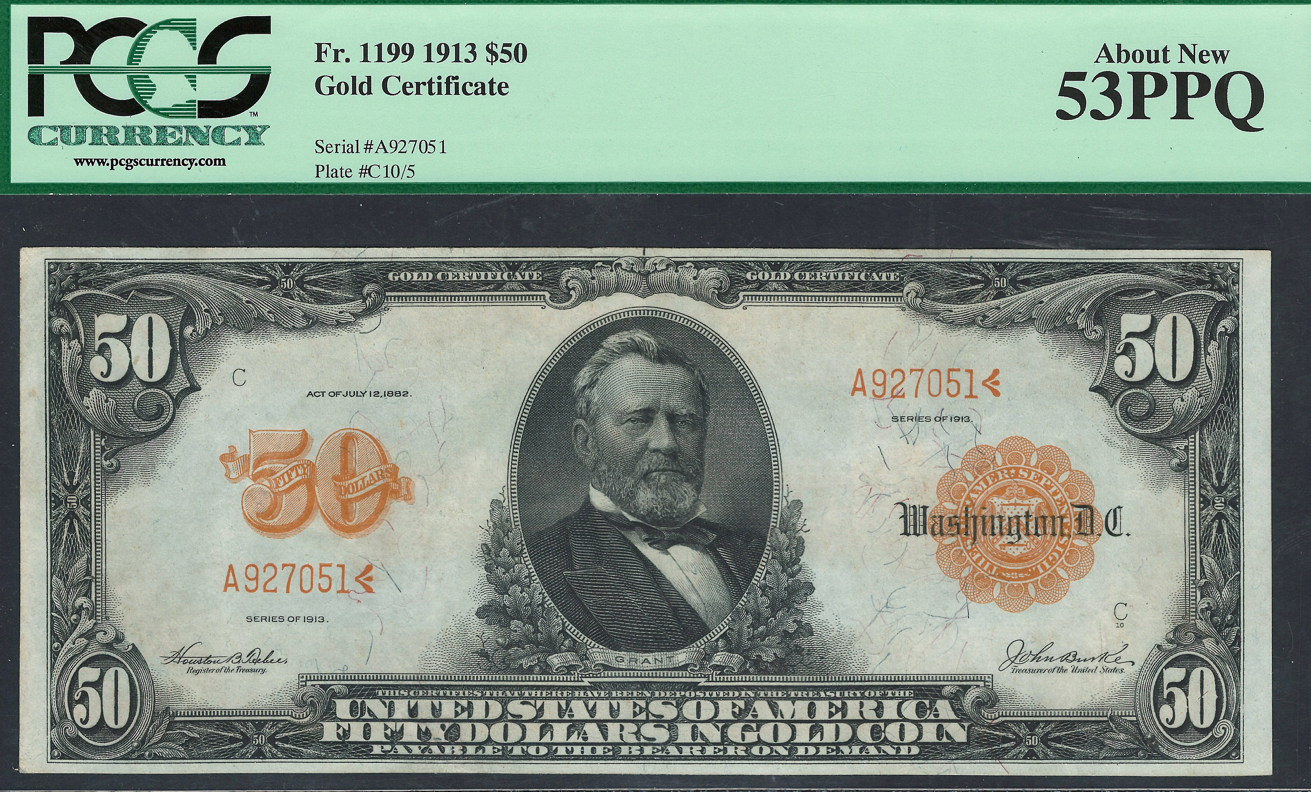 This is the nicest 1913 $50 Gold Certificate that I have ever had on this website. I've been looking for over two years for a original 1913 $50 Gold Certificate in a AU PPQ/EPQ grade. This one year issue note is very special as it was ONLY issued one year and it features a bust of Ulysses S Grant on the face. It seems to be one of the key notes of the large size gold certificates to find. Check out the beautiful burnt orange colors on the obverse and fantastic margins all around. This is a fantastic type note for the AU collector. Not many around! I was very excited to get this note in this grade. The serial number is A927051 and is in a PCGS-53PPQ holder.
