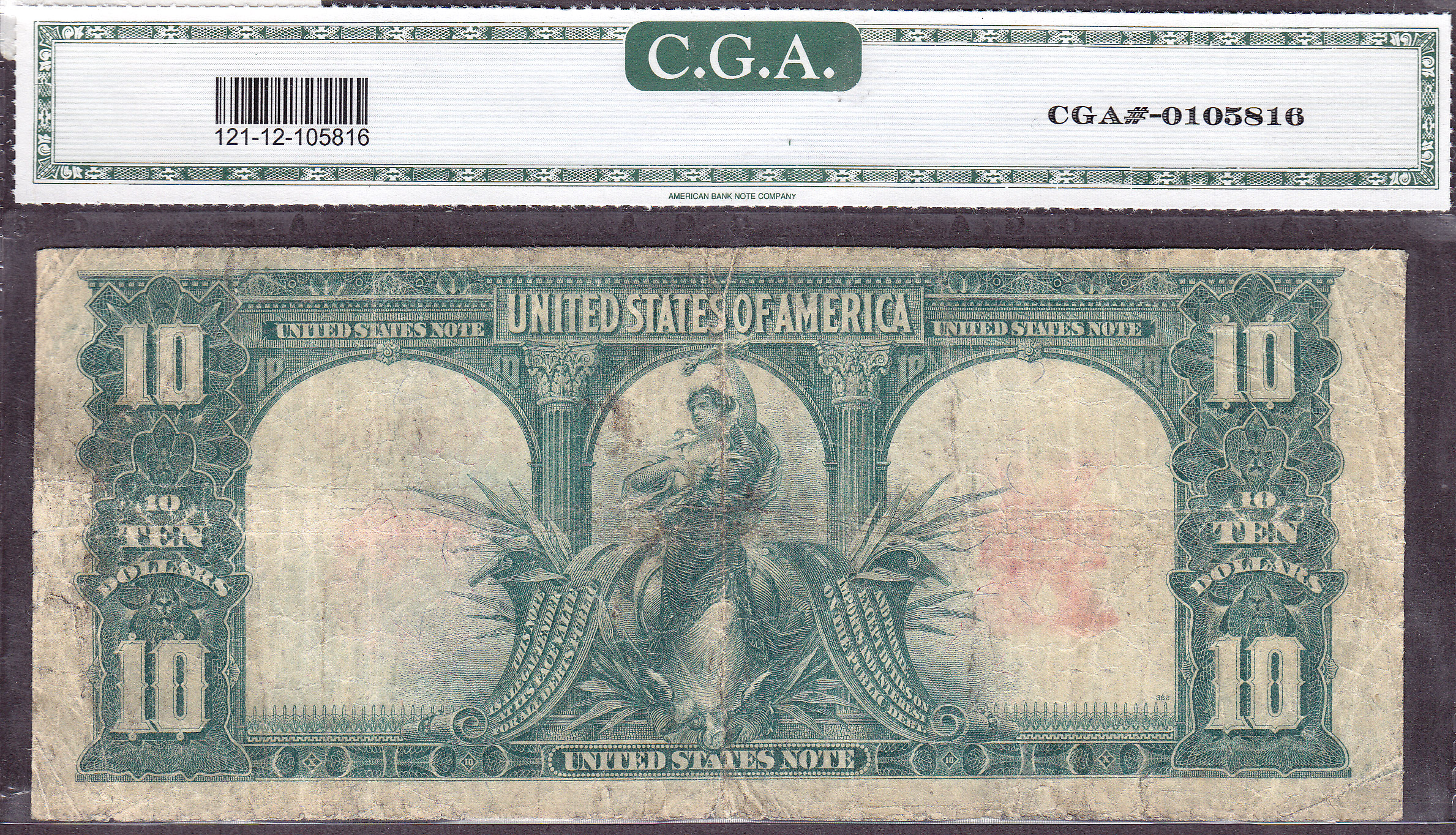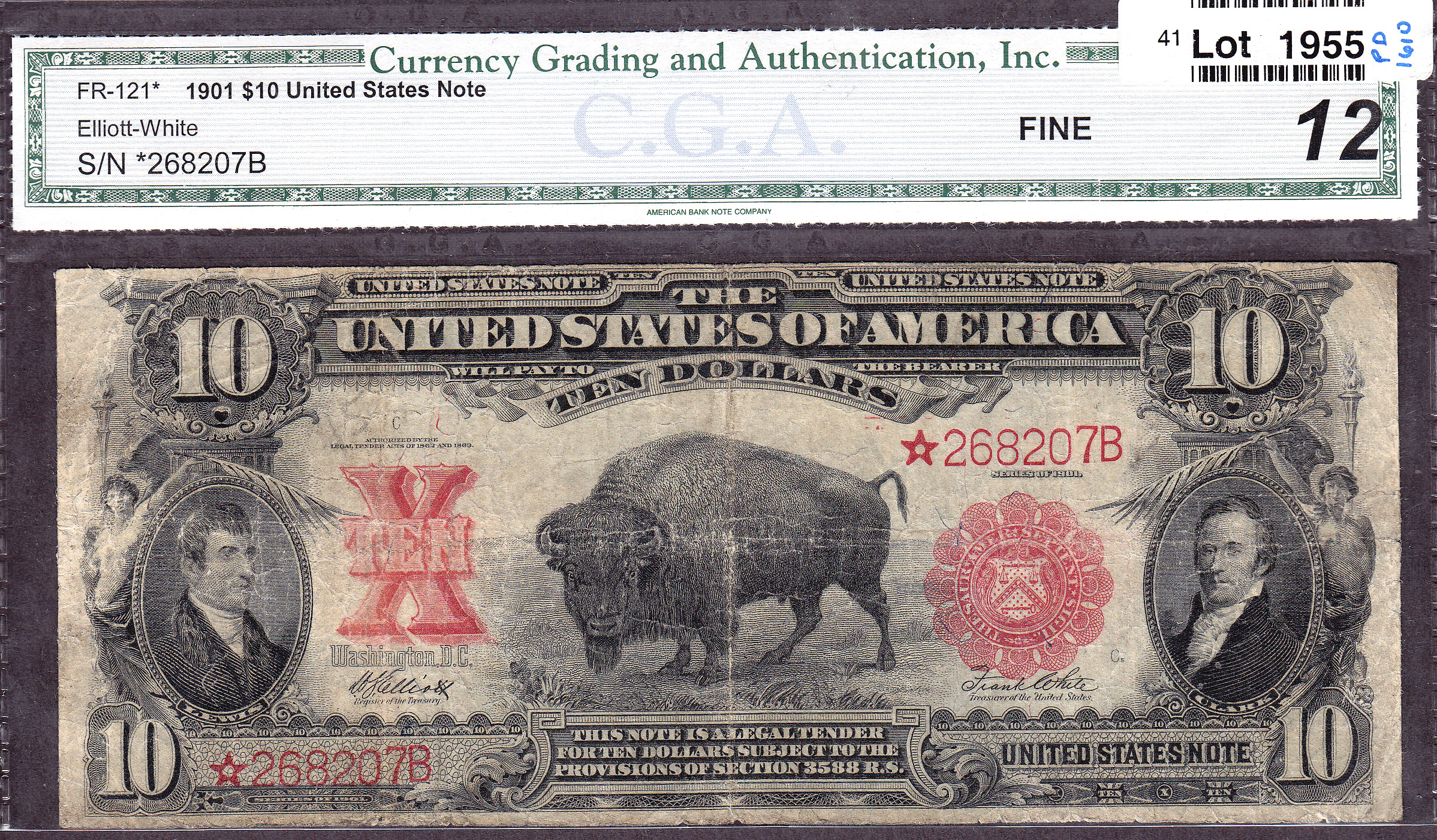 This is a 1901 $10 Legal Tender Bison MULE Star with the serial number of*268207B. It has been graded as a CGA F-12. I believe it will cross over to a PCGS at the same or better grade. There are 31 known of this FR#. The Murray large Size Star book list this note in Fine condition at $2500 and $1,000 in VF. A nice note for the price. Cmon make me an offer.