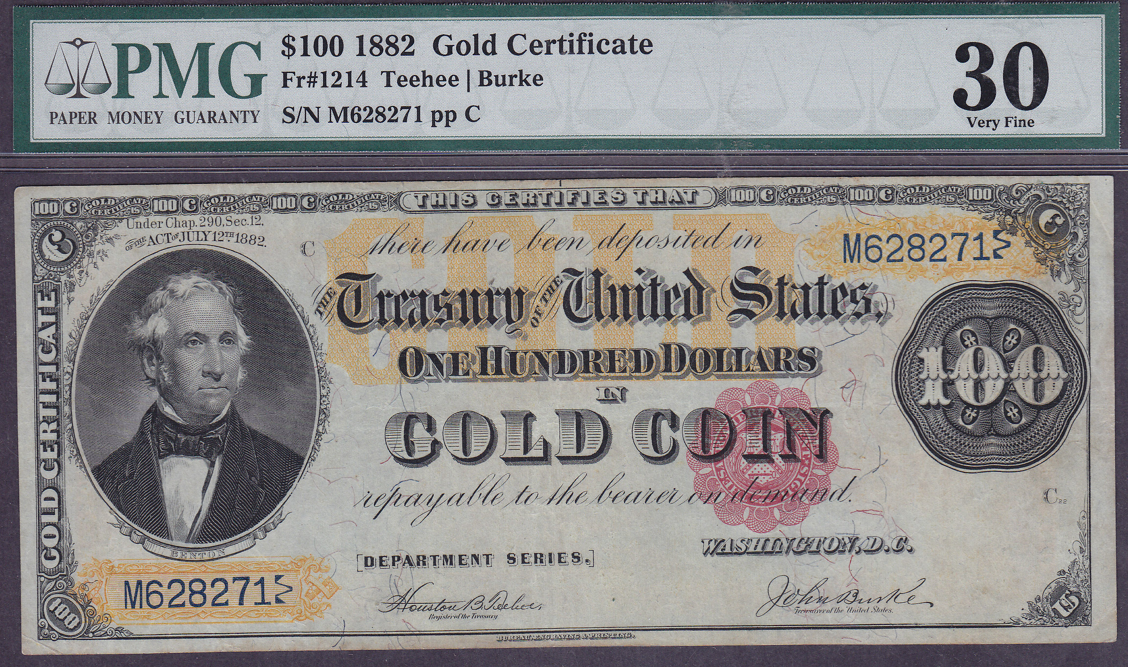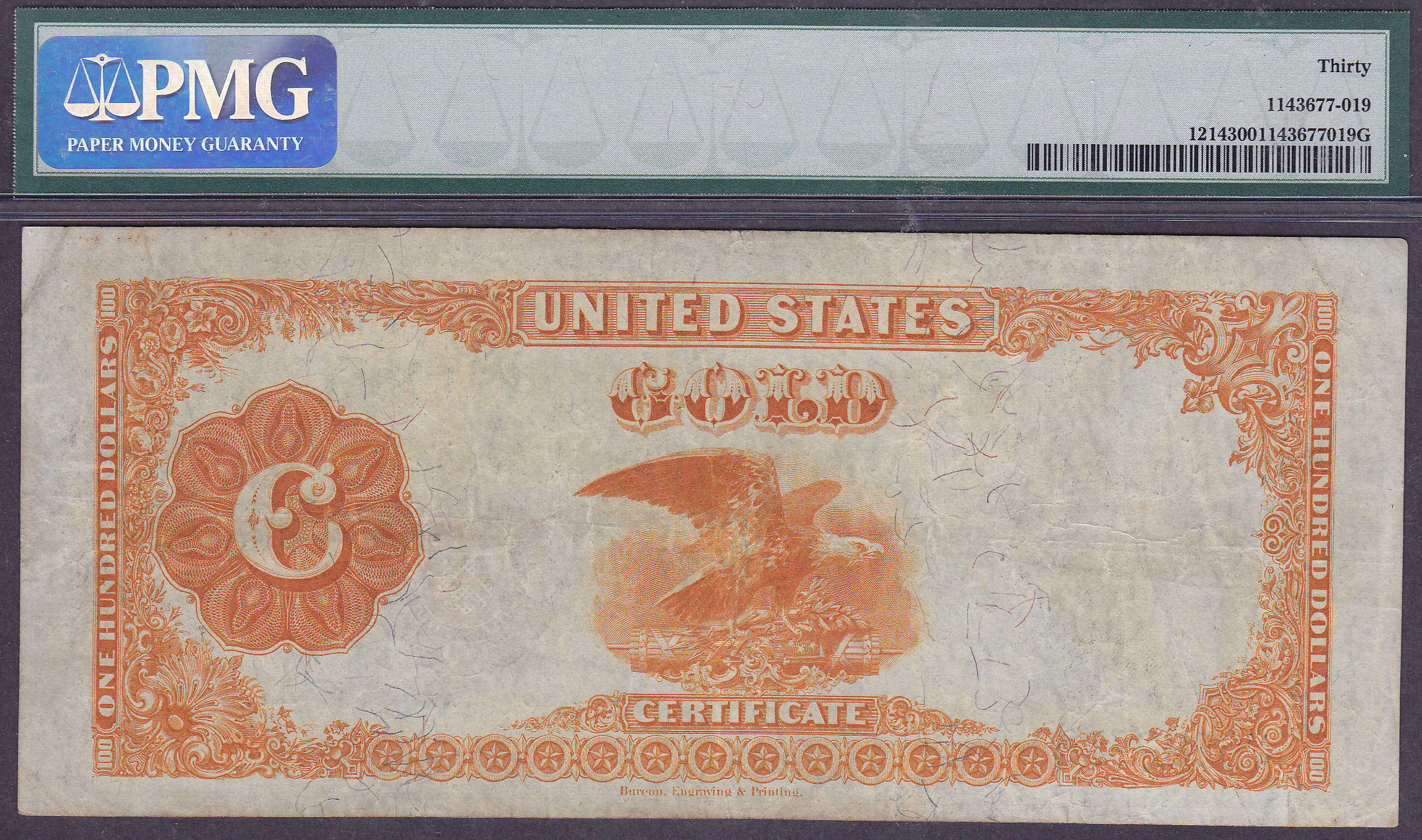 This is a 1882 $100 gold certificate that is a perfect speciman for the type collector who want a problem free note without spending a lot of money. As you look at the large scans you will notice that there are no rips, tears, pinholes, surface markings or hard soiled folds. The ruby red seal and the gold overlay is all there. The serial number is M628271 and is in a PMG VF-30 holder.
