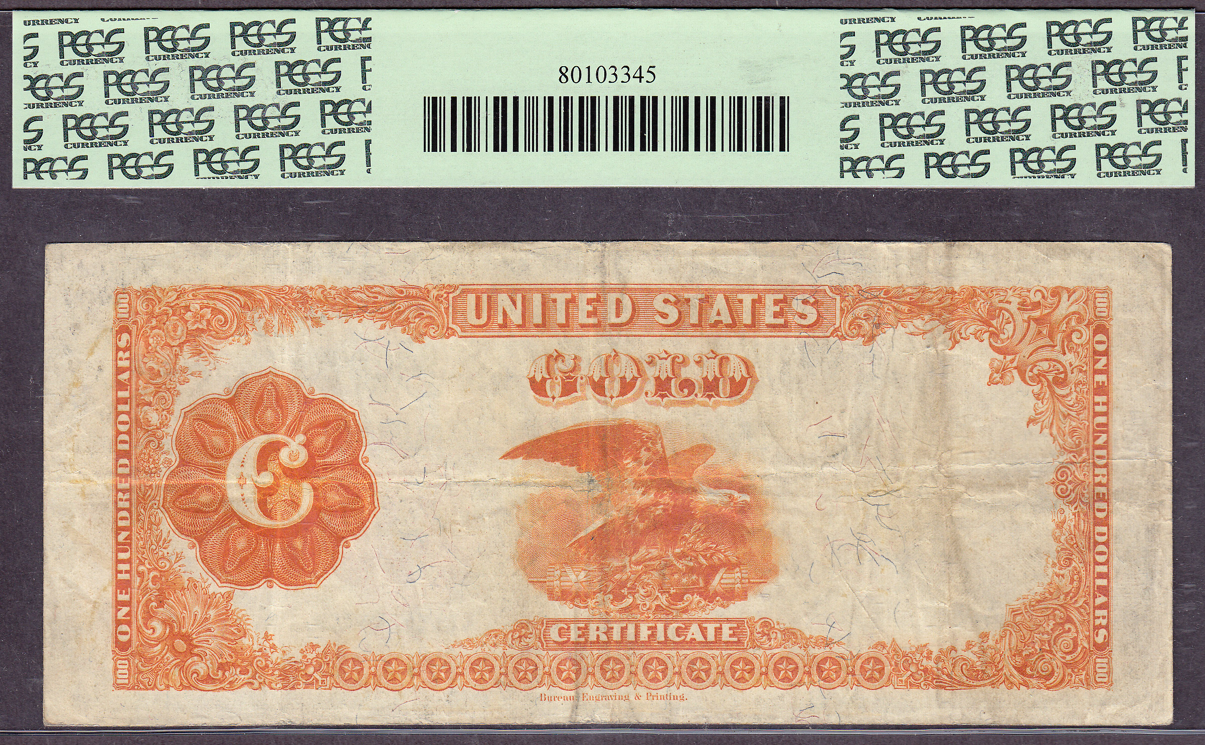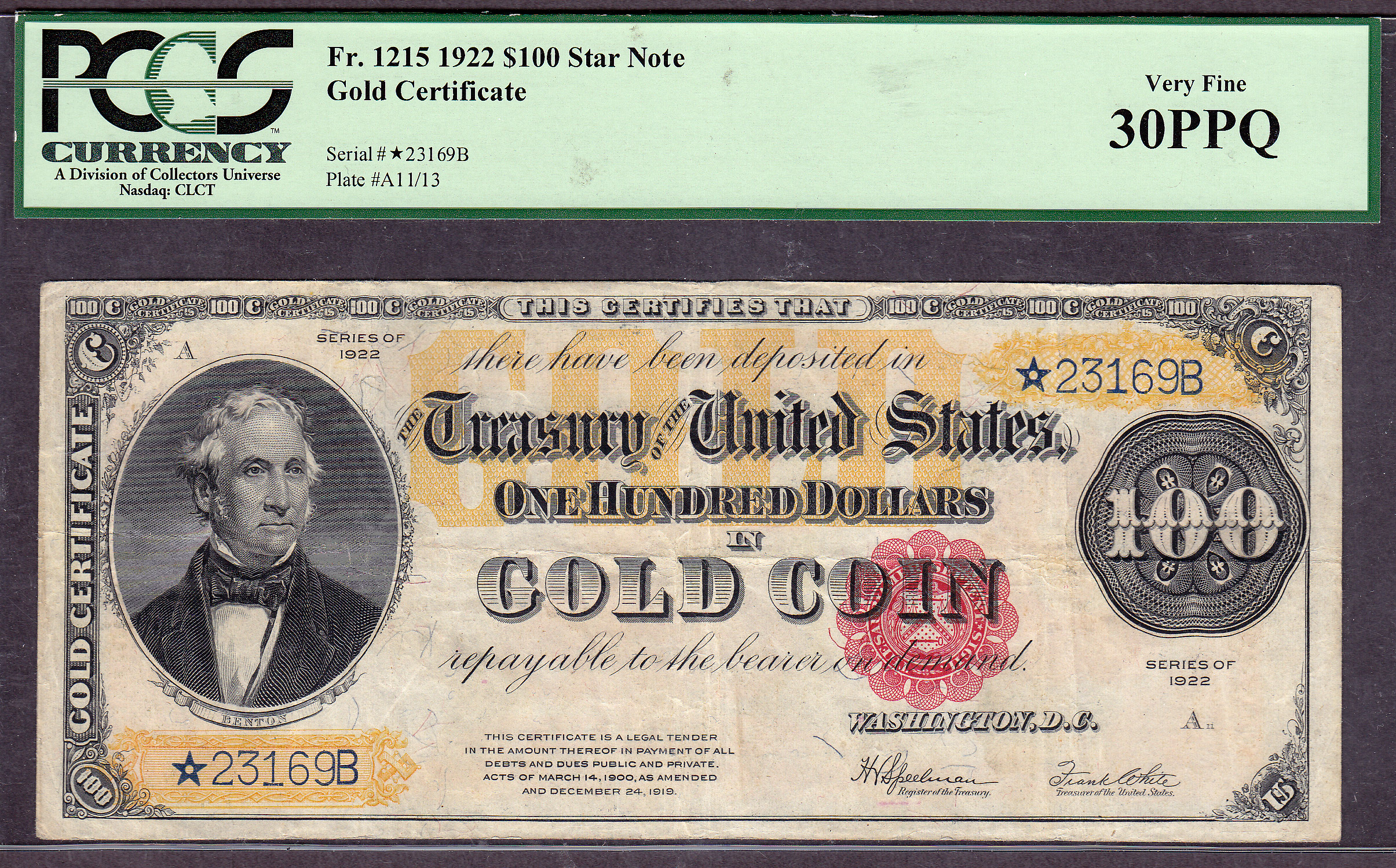 VERY-VERY RARE! This very note is one of my all time favorite Large Size star notes. Here is one hell of a nice and very rare Golden 1922 $100 Gold Certificate Star Note. For those of you who are in the know, there are only about 17 of these known and most of them are in Fine condition. I have owned several of the ones in fine condition over the years and to be able to purchase this jewel was a blessing to me. As a major large star collector for many years, I knew exactly what I had stumbled upon. It immediately went into my private Jhon E Cash Collection of Large Size Stars. I purchased this note from a coin shop in South Carolina a few years ago. The client walked in the coin show and wanted to sell this note along with a cigar box of full of old coins. The coin dealer called me and we did a deal that everyone came out a winner. I could not believe I had finally had located one of the very, very few unmolested 1922 $100 Gold Certificate stars. This one was new to the census as the collector had it put away for many years. I could not wait till I received it in the mail a few days later. This is one of the rarest and hardest to find Large Size Gold Certificates stars known, the 1922 $100 Gold Certificate. PMG has only graded one higher and it’s in a PMG-40EPQ. The note that is in a PMG-40EPQ holder is on a dealer’s website right now for $27,000 wholesale, $30,000 retail. It is only the second EPQ star I know of for this type. This beauty is in the Jhon E Cash Collection for now. Whichever collector eventually ends up with this jewel will proudly display it as the crown jewel of their Large Size Star Collection.