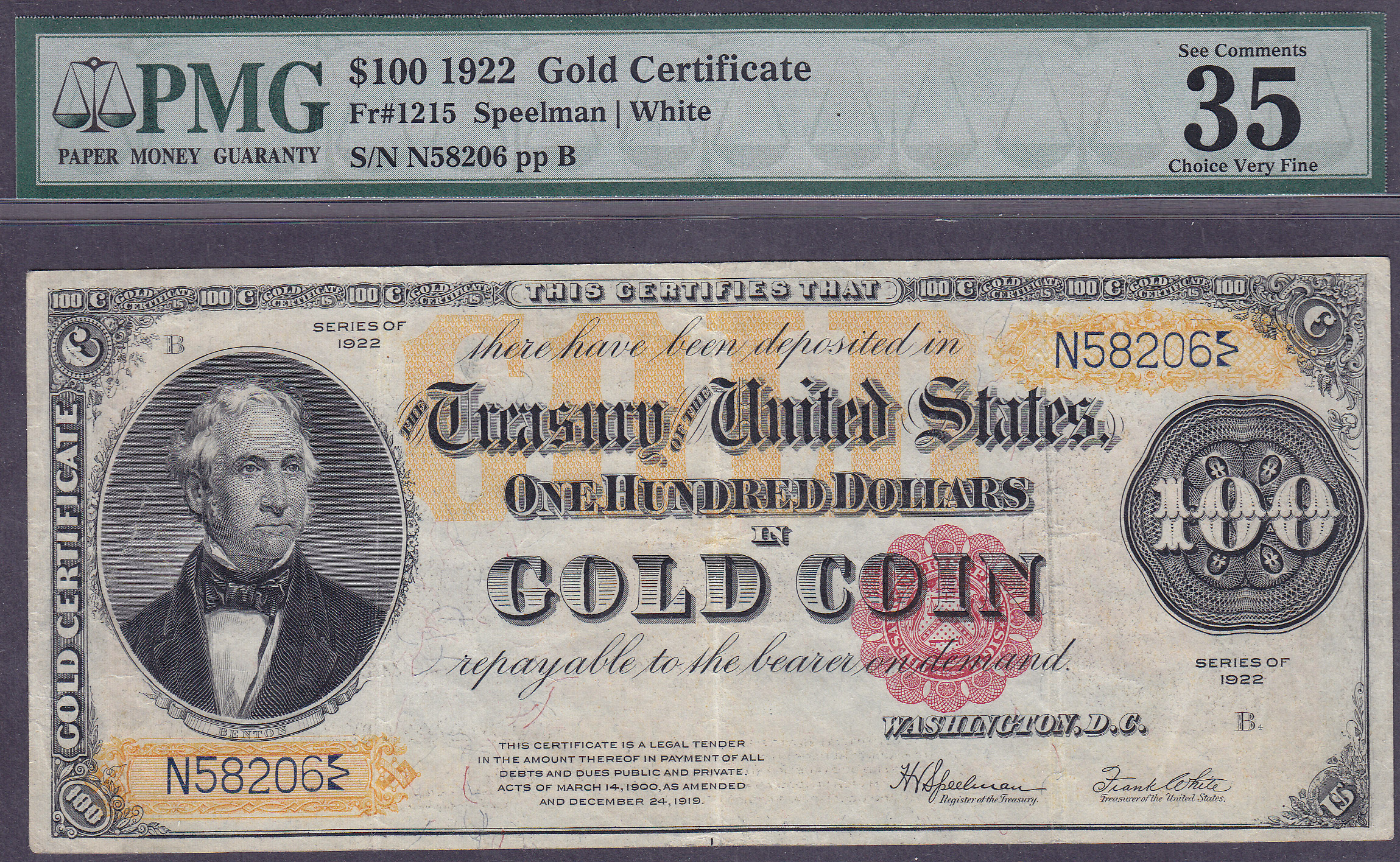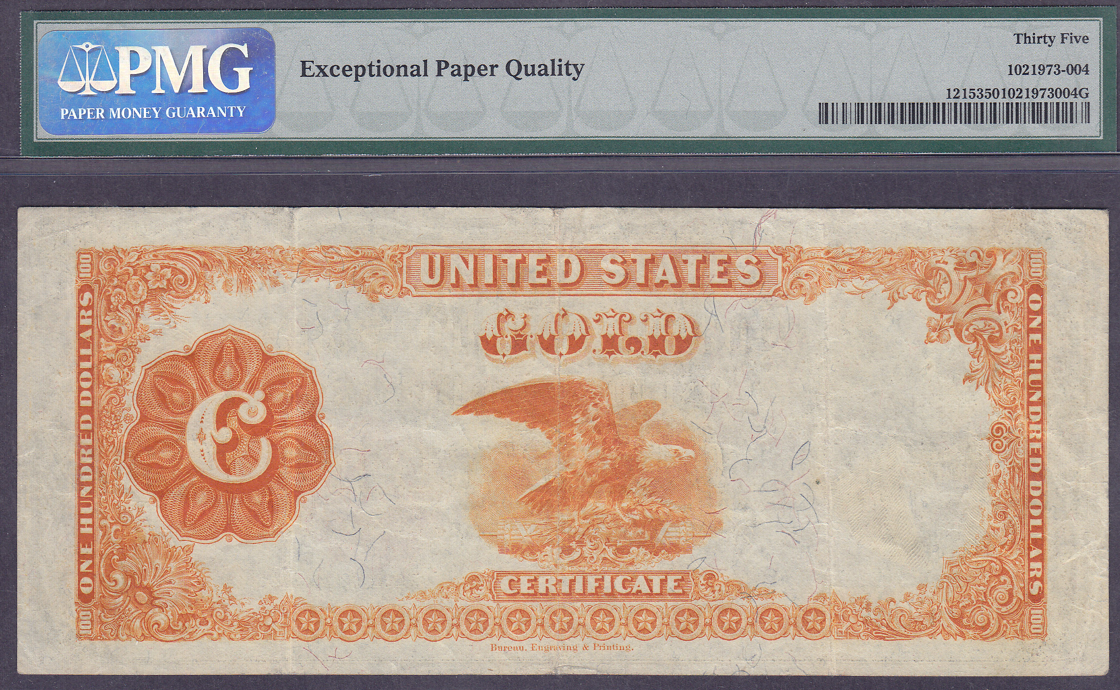 This is one of the nicest mid-grade no problem 1922 $100 Gold Certificates I have ever owned. The serial number is N58206 and it is in a Very Fine PMG-35EPQ holder. What make this note so special is the burnt-orange color on the back and the PPQ designator. The lipstick red seal is extremely bright and the color on the reverse is unusually original. This is one of those notes that was put away in a book many years ago as there is hardly any signs of circulation. It has retained its original embossing. So often they are faded and washed out. The paper quality is well preserved. This lightly circulated Gold Certificate has been put away somewhere safe for many years. There is no signs of soiling as you see with so many of these old Gold Certificates. The burnt-orange color fades quickly and badly when it is washed or exposed to long time sunlight. That is why you need to get a note with the "PPQ or EPQ" notation. That means it all original, never messed with as so many of the gold certificates are today. You will not find but a handful of any large size gold certificates with the PPQ designator on them. Origionality is very tough to come by on gold certificates, because of the color. This example would make a great acquisition form anyone putting together a nice collection of large size gold certificates.