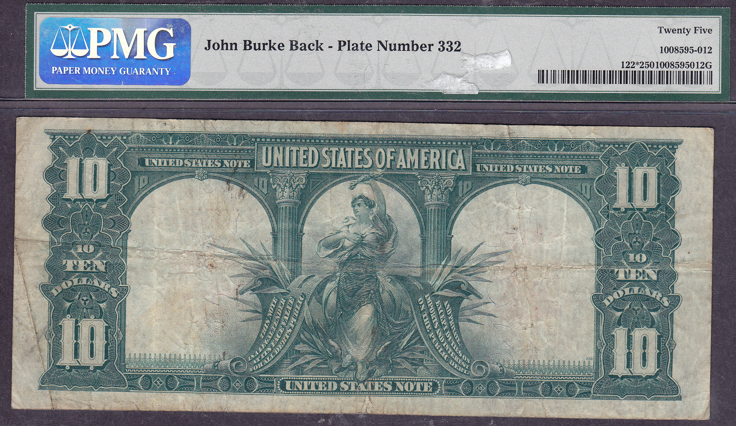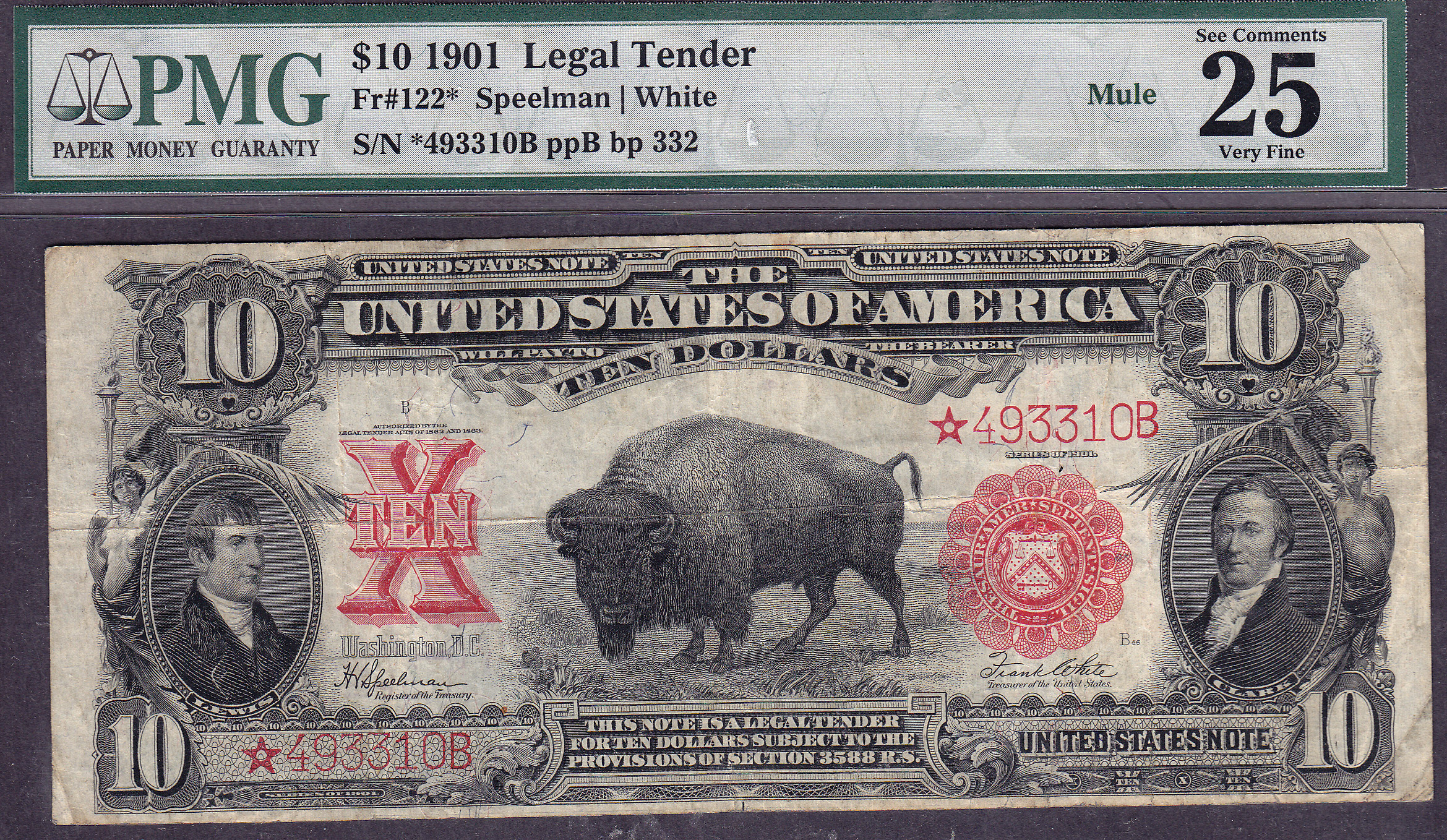 THIS IS A VERY RARE MULE 1901 BISON STAR NOTE. IT IS TIED FOR 3rd FINEST OF THE 10 KNOWN LEGAL TENDER MULE STAR NOTES. IT IS CERTIFIED AS A VERY FINE-25 BY PMG. THE SERIAL NUMBER IS *493310B. IT LOOKS MUCH BETTER THAN A VF-25. NO PROBLEMS AT ALL WITH THIS NOTE. IT IS THE 3rd FINEST OF THE 9 KNOWN. HOW RARE IS THAT? This note is also a very, very rare John-Burke plate number.