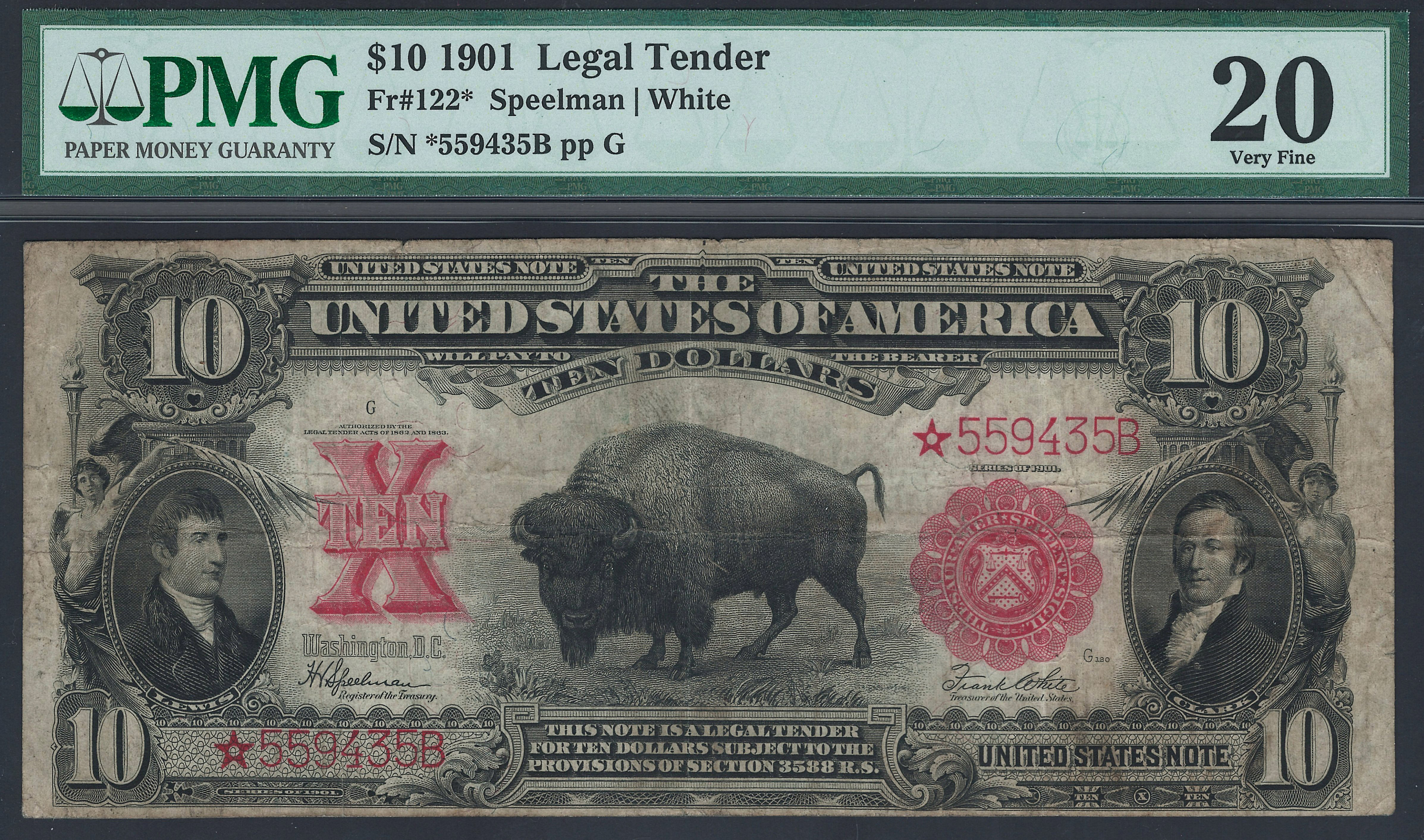 I stole this note and now you can too! I was lucky when I bought this note a few weeks ago. It is a 1901 $10 Legal Tender Starnote. Stars on these Bison's are very rare in any grade. When you do find them that are usually with a rip or a tear or some other issue. Not this one, no rips, tears or pinholes, just even circulation. The serial number is *559435B and it is in a PMG-20 holder. Heck the price I'm selling this for is not much more than a common Bison. The first person who sees this Bison star at $2995 is going to buy it thinking I made a mistake. Like I said I stole this one and now you can too. This will be the bonus note for those who get here early.