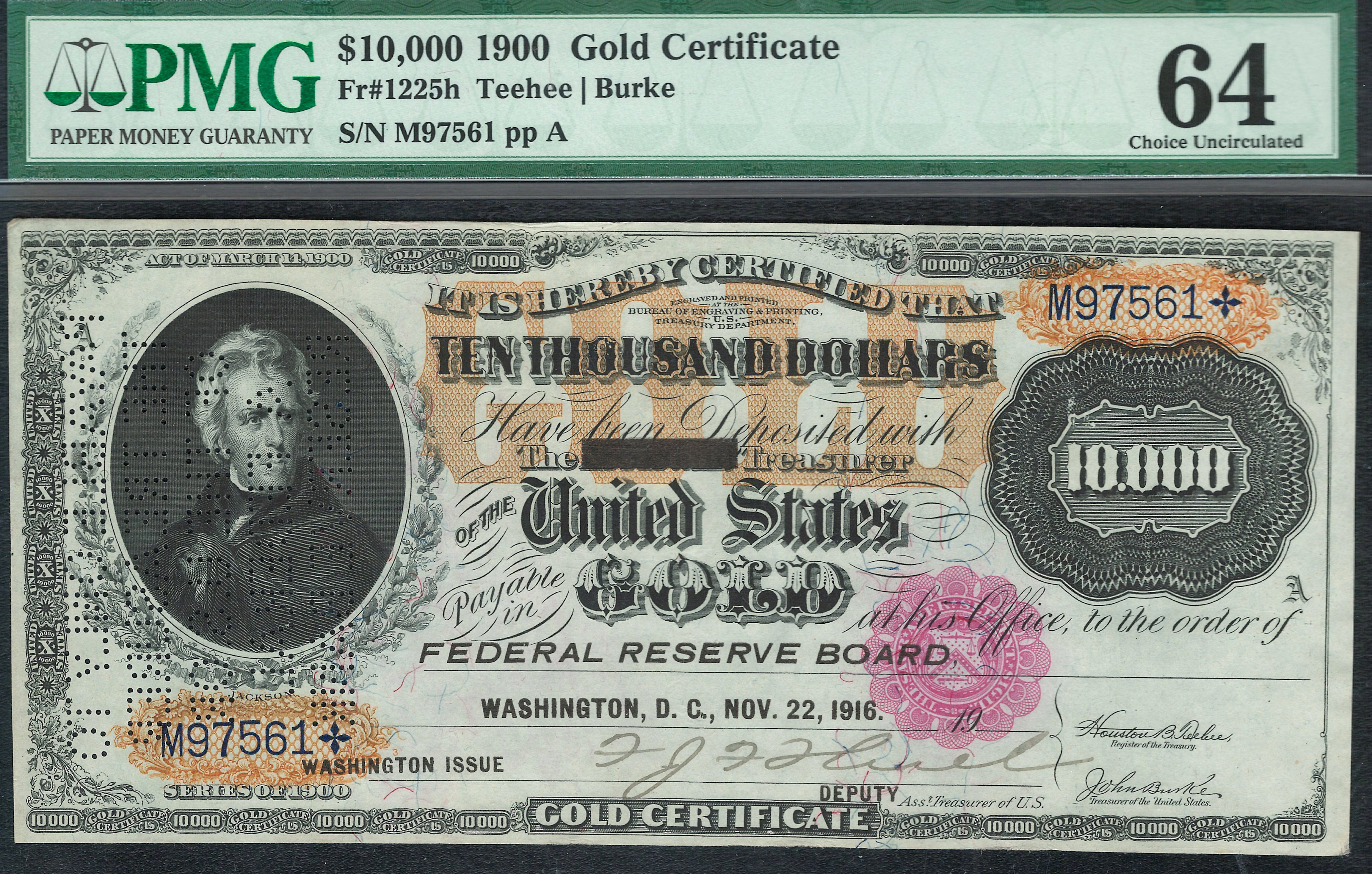 Fr.-1225H This is the 1900 $10,000 Gold Certificate with Ser. H59607in a PCGS-64 holder.