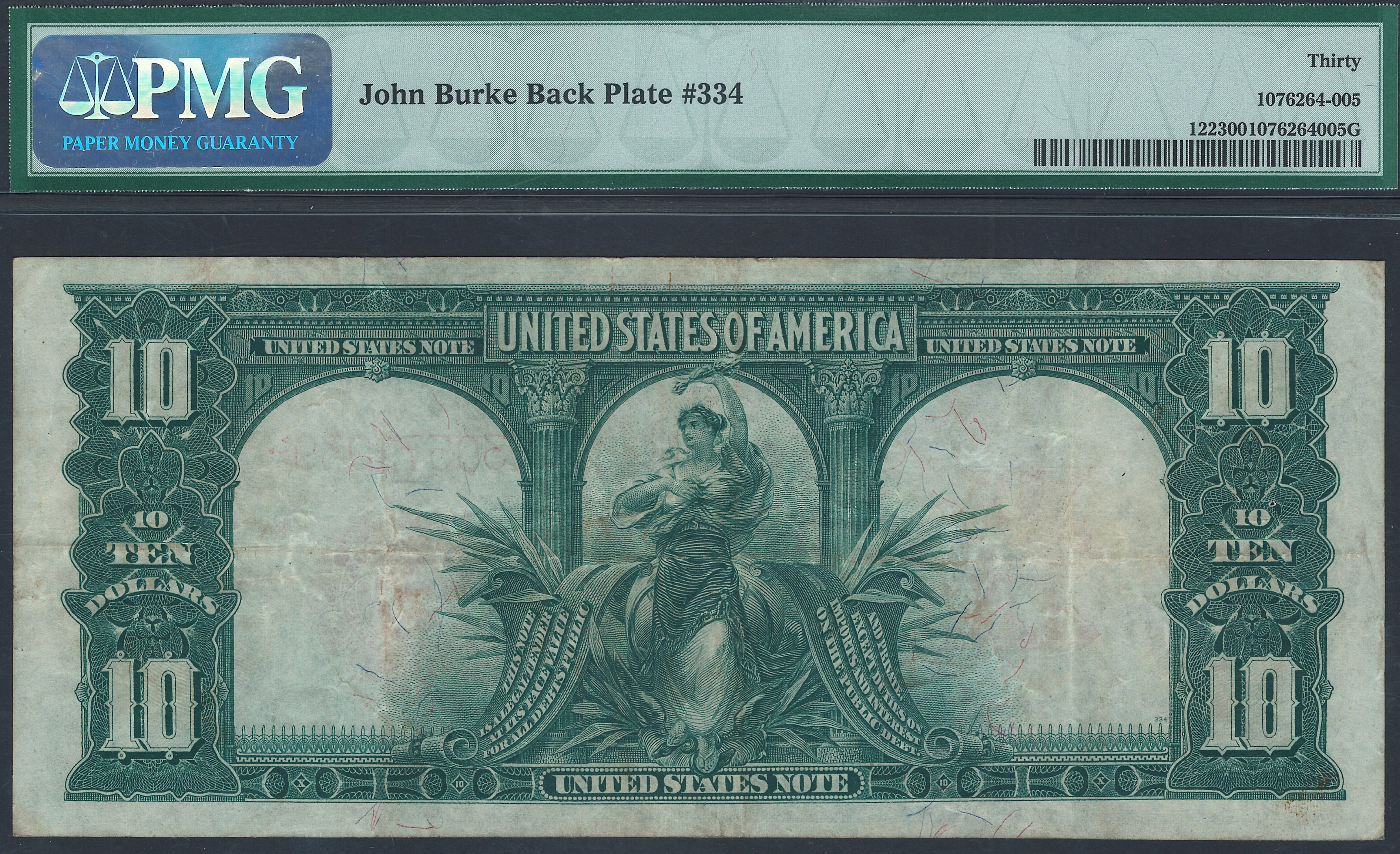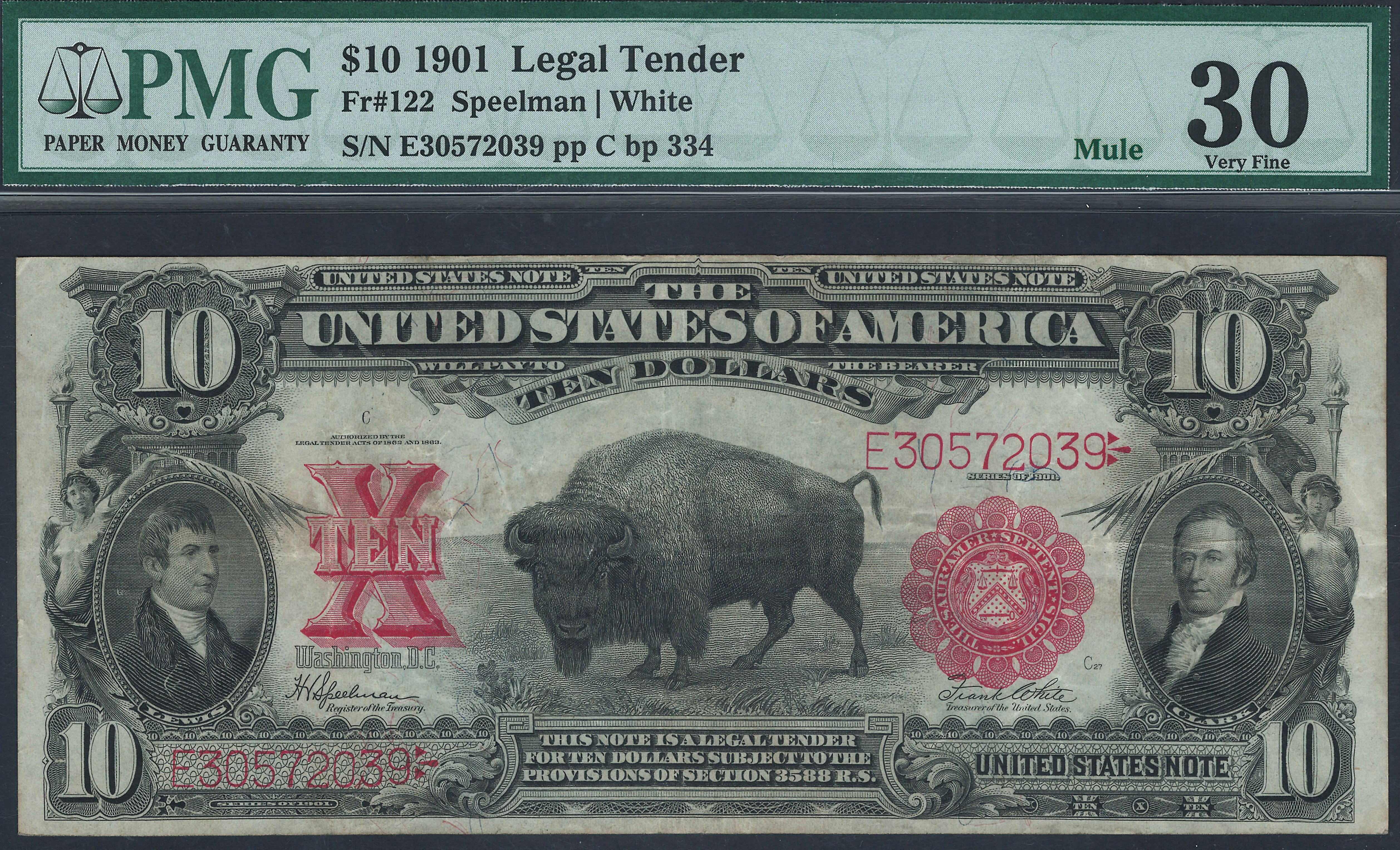 Here is an example of the 1901 $10 Legal Tender commonly referred to as the Bison note. The Bison note is one of the most collected notes along with the Chief Note, the Tombstone note and the Porthole note. This one is problem free with no rips, tears, pinholes or marks. The serial number is E30572039 and is in a PCGS-30 holder. It is priced for a quick sale. As a bonus it is also a John Burke Back Plate #334 MULE note.