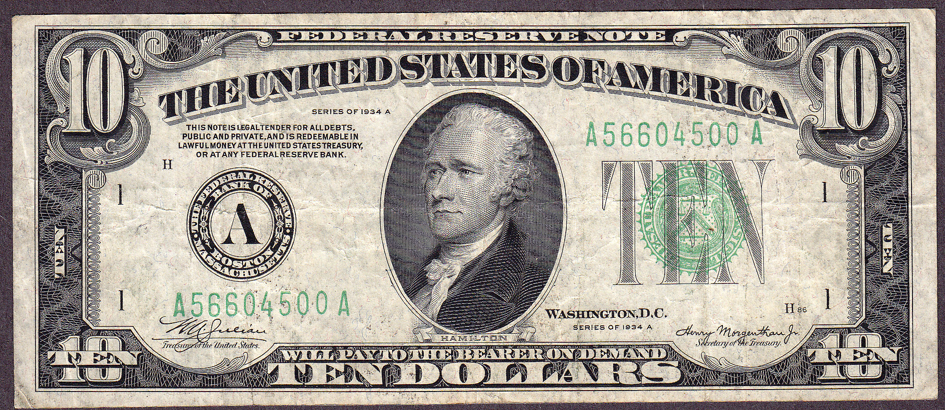 Fr.-1336A 1934-A $10 Boston FRN Ser. # A56604500A Raw