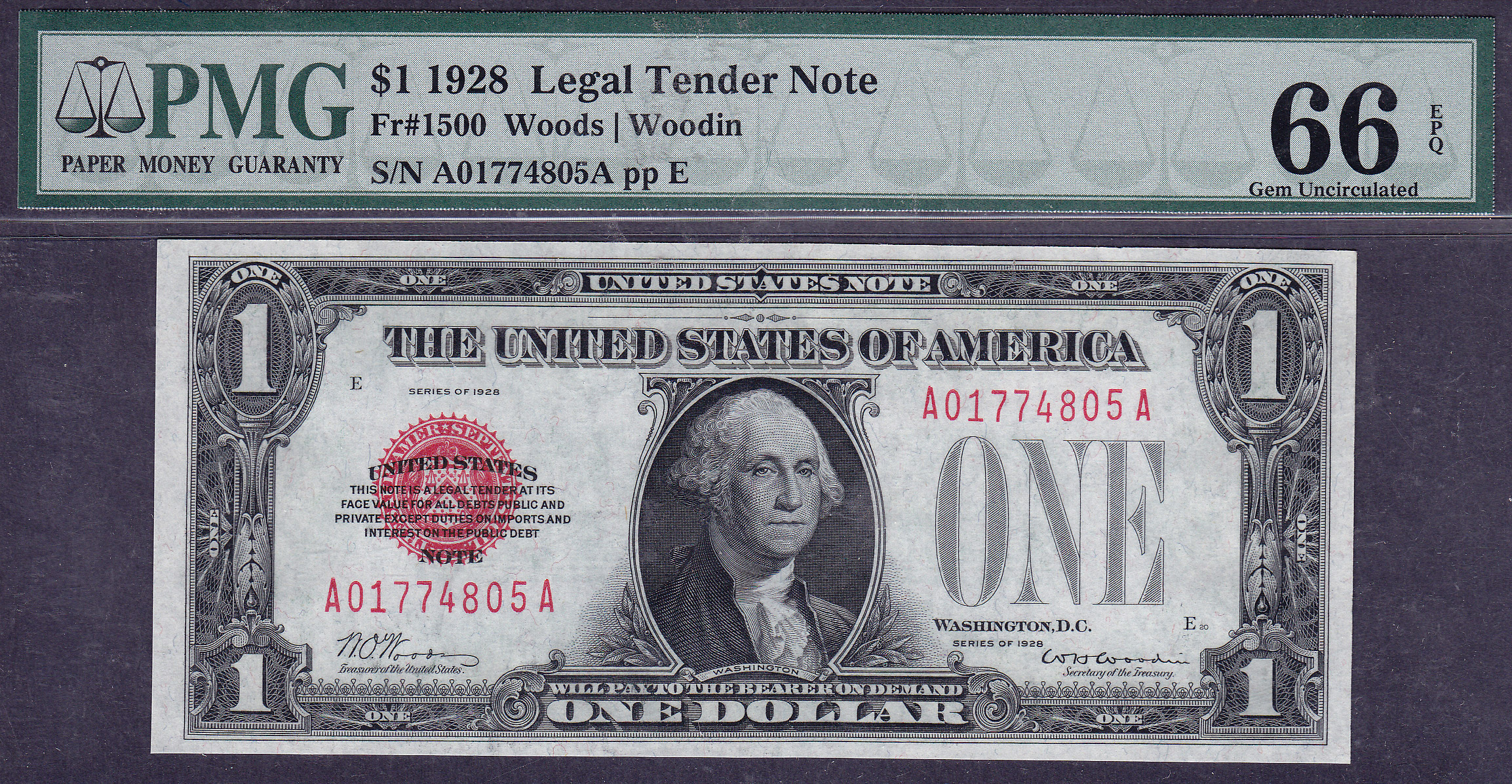 This is the perfect 1928 $1 Red Seal. Check out the large scans. The deep embossing and large broadwalk margins. The lip-stick red seal shines right through the holder. PMG-64s are selling "Wholesale for over $1,000. This is a steal to acquire a superb GEM for $950.