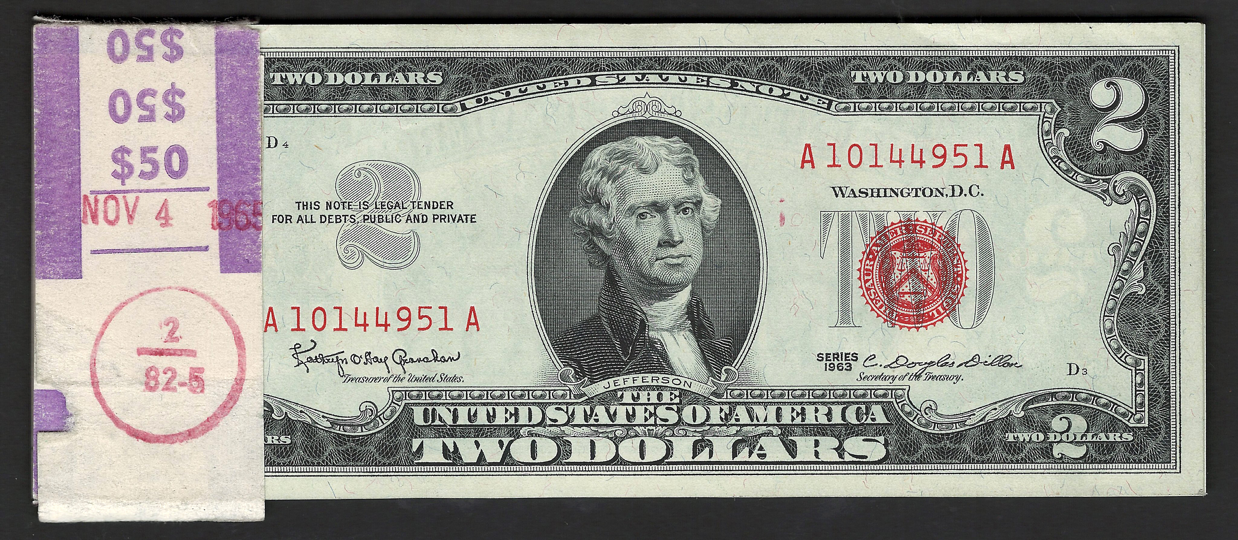 This is a nice and interesting set of 25 consecutive 1963 $2 bills that are in the same $50 wrapper that it came with from the BEO 51 years ago. One of the notes near the back is a star note. I took this set as a trade in at the Schaumburg CSNS show back on April 26th, 2014. Check the large scans for details. If you would like additional info feel free to contact me at 214-769-9936.