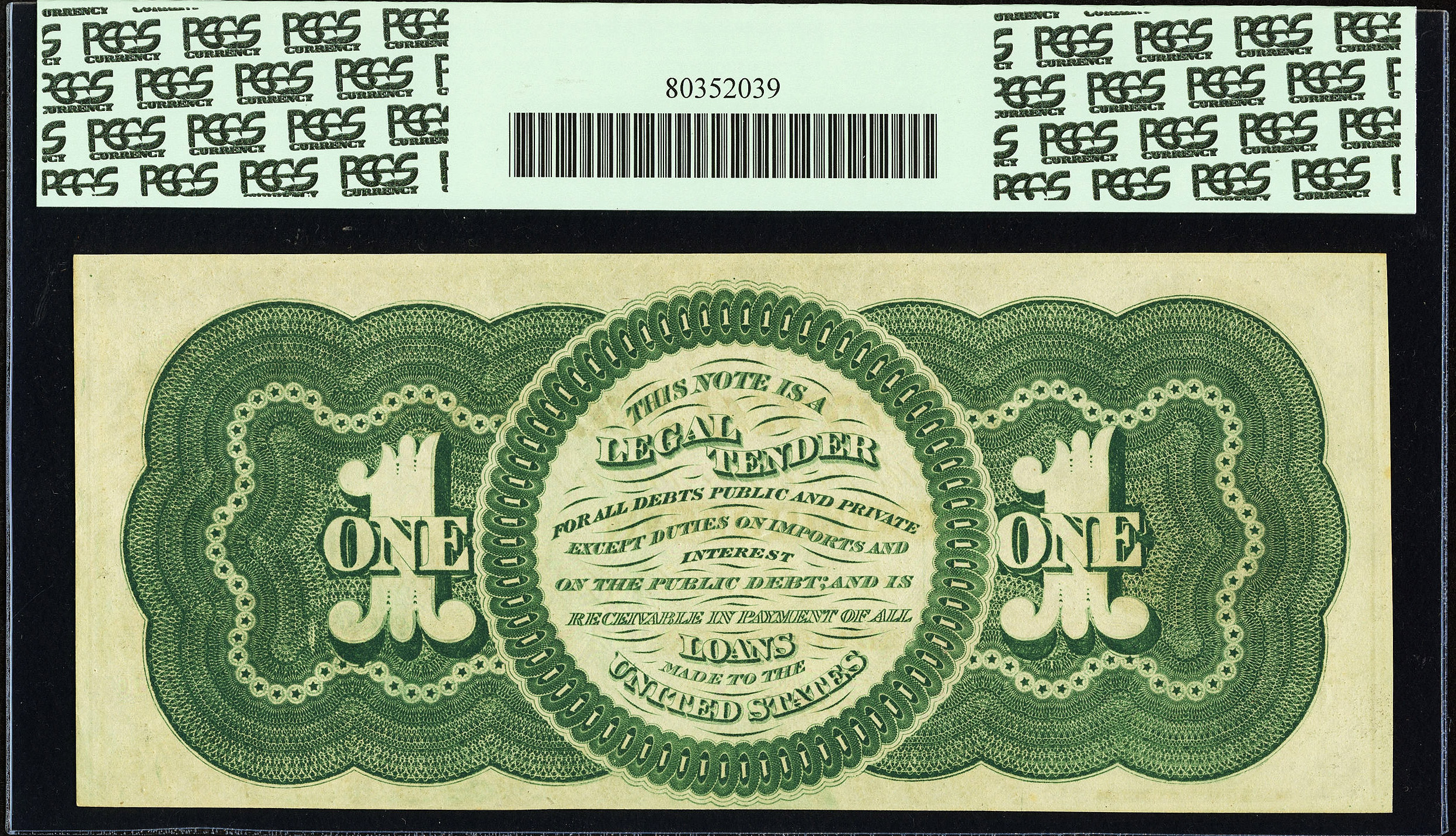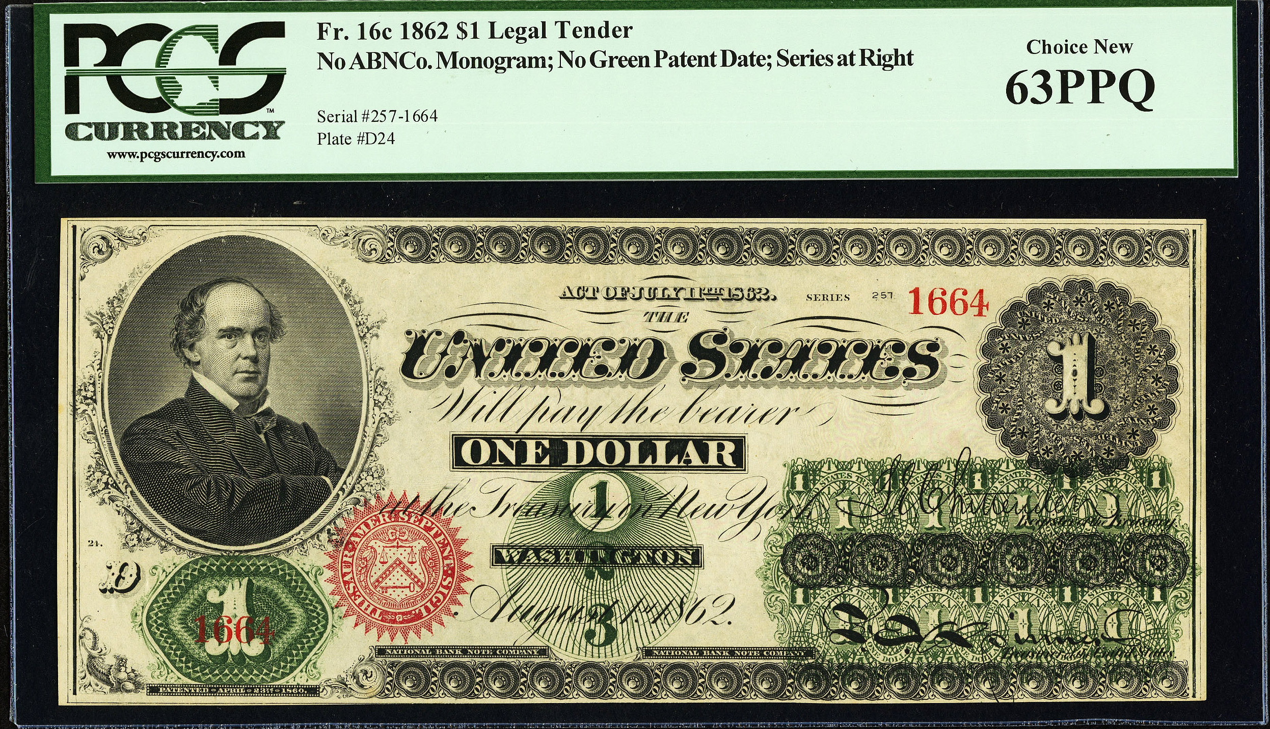 This is one cool FR-16C1862 $1 Legal Tender in a PCGS-63PPQ holder. Like most of these notes the margins are tight but the eye appeal, color and surfaces certainly has this note looking for a higher grade. There are no rips, tears, pinholes or corner folds. A totally original note.
