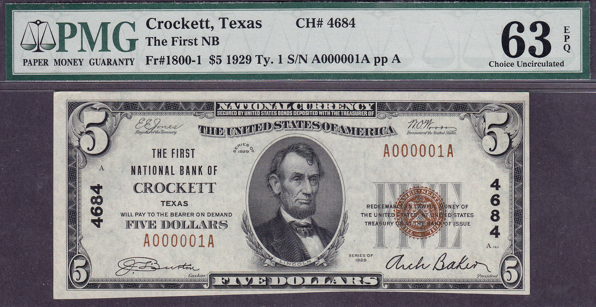 This is one of those rare notes that comes along every once in a great while. This is a "Hand Cut" 1929 $5 NBN from the tough First National Bank of Crockett, Texas. It is also one of the few serial number one notes from the A-A Block. Which means this was the first $5 bill printed from this bank. How cool is that? It is located near Houston in Houston County. The city was named after Davey Crockett, The legendary fighter who died in the Alamo in 1836.