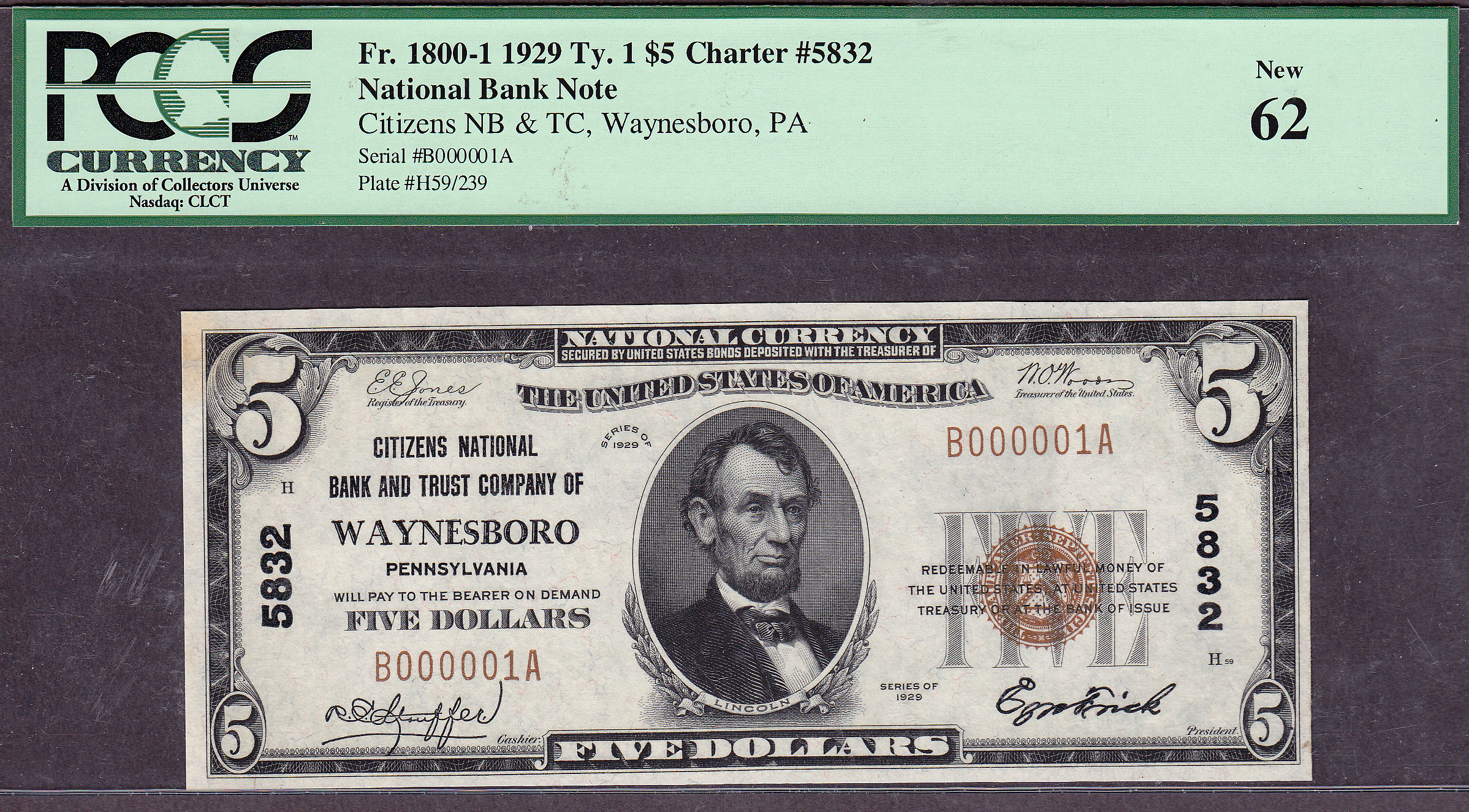 This is a very stunning note. It is from the Citizens National Bank and Trust Company of Waynesboro, Pennsylvania. ,,, Charter # 5932. It features the low serial number of B000001A. The only thing ,,,I can tell is there is a tiny-bit of light foxing at there upper left top. Other than that is problem free. No folds, tears, rips or pinholes. Great even margins and eye appeal. HIGHLY COLLECTIABLE. PER