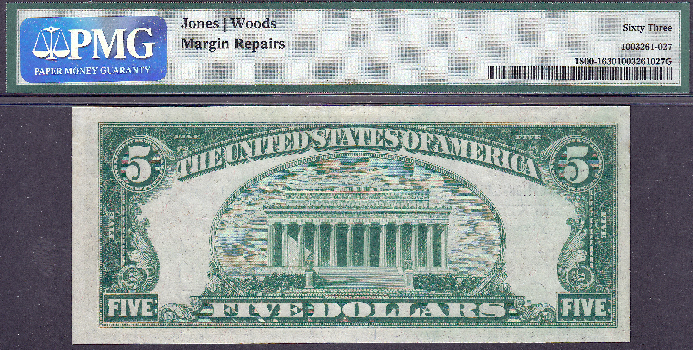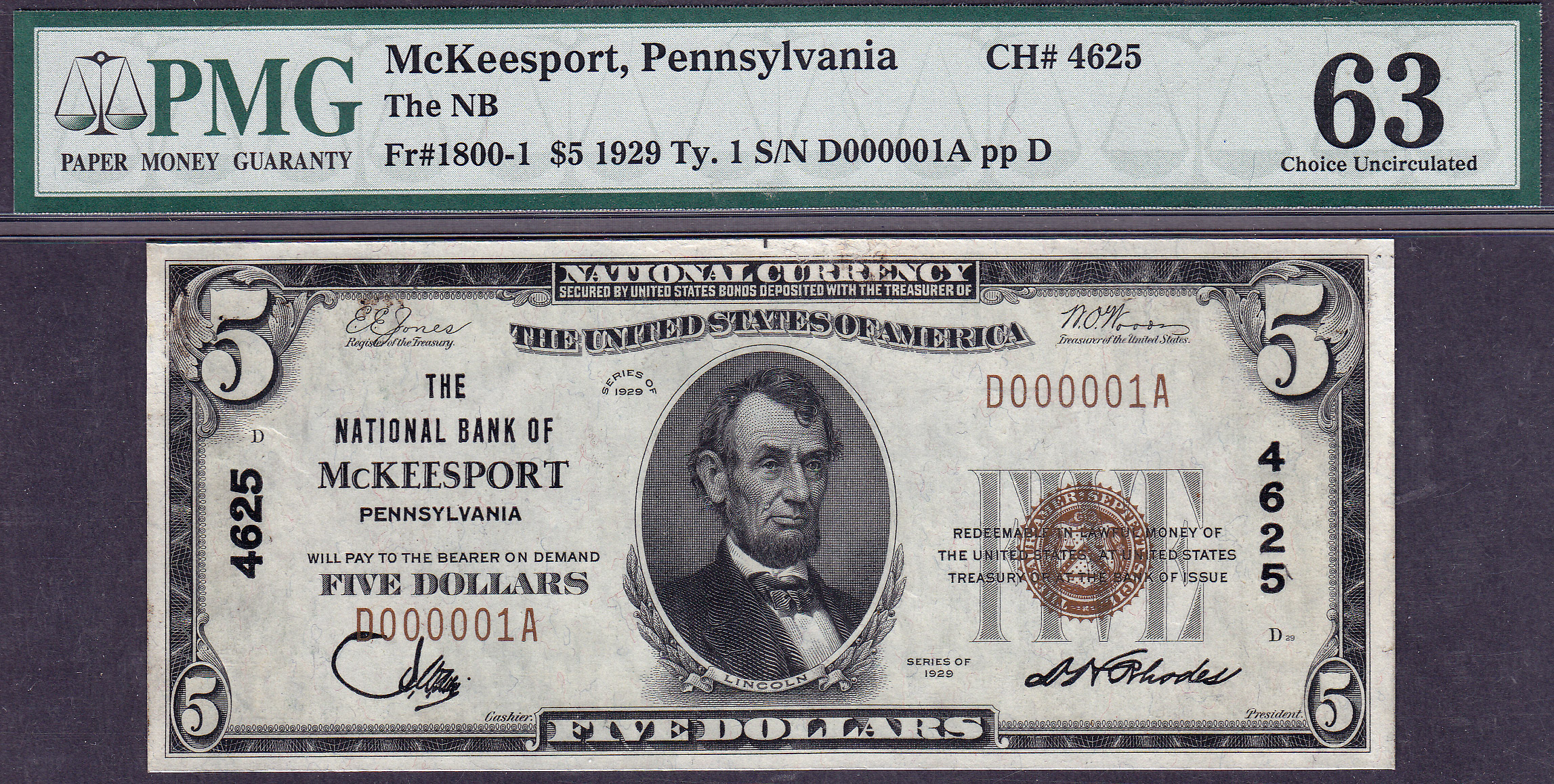 This a 1929 $5 NBN form The National Bank of McKeesport, Pennsylvania, Charter # 4625. It has been graded as a PMG-63. The serial # is D000001A. PMG has notated "Margin Repairs". Well you look at the large scans and try to find it because I havent found it.
