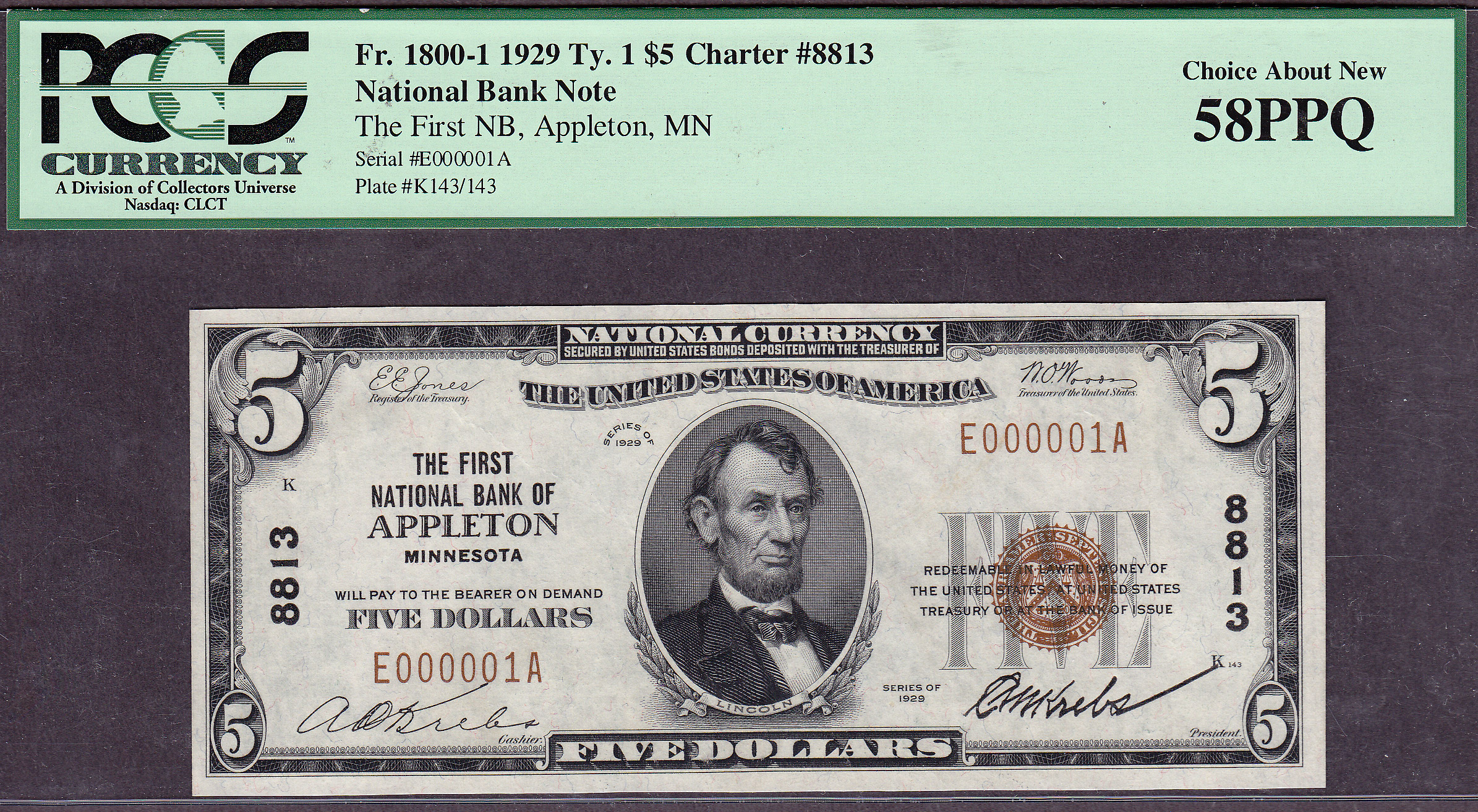 This is a very nice example of a 1929 $5 NBN from the First National Bank of Appelton, Minnesota with a serial umber of E000001A. There are very few serial number 1 notes from the state of Minnesota in any denominations. Here is one of them. There are only 5 small size Type 1 $5 serial # one notes from this bank. JEC