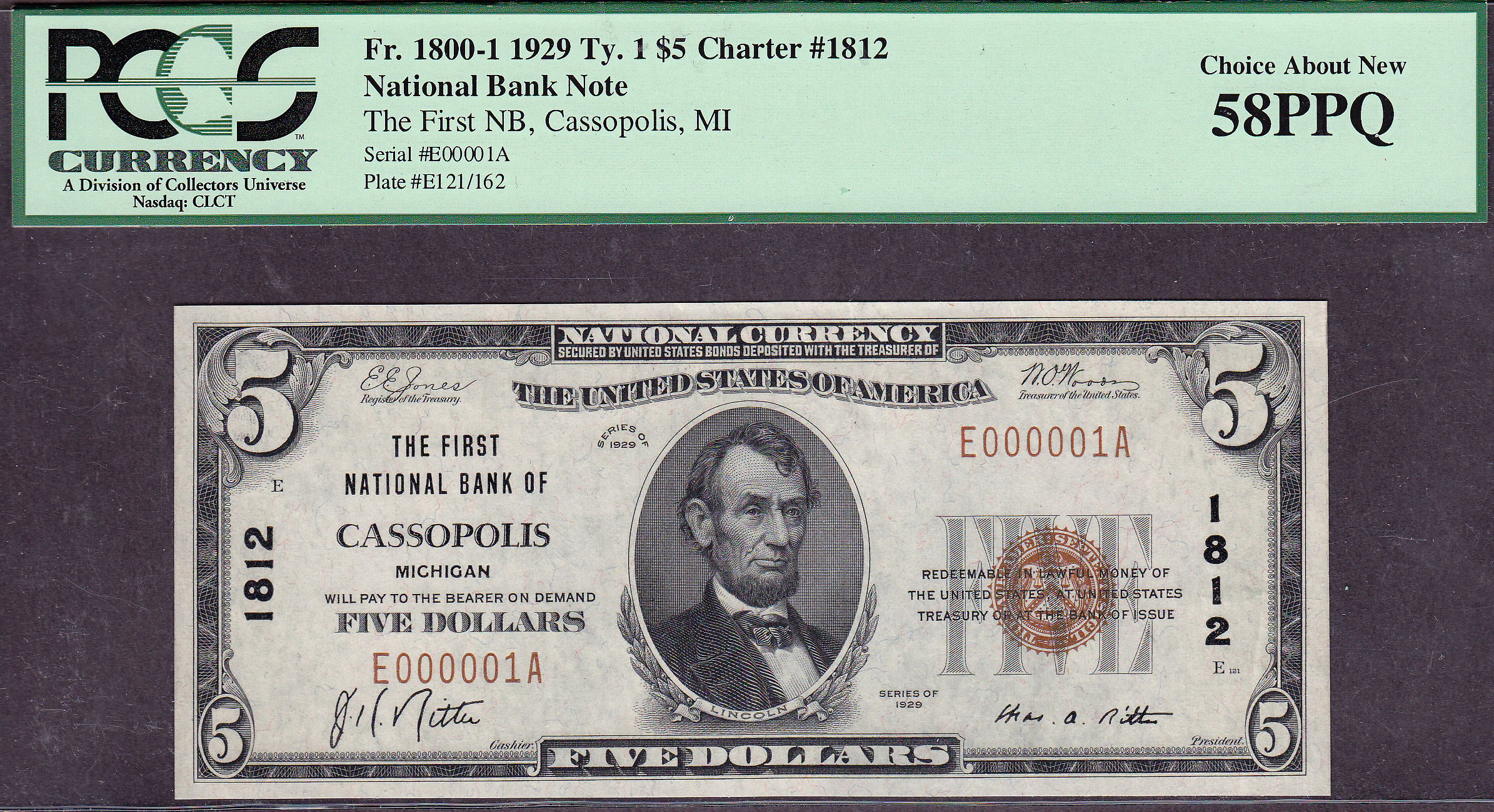 This is a very nice and popular 1929 $5 NBN form The First National Bank of Cassopolis, Michigan. It has a serial number of E000001A. This note is in pristine condition with no pinholes, tears, rips or bank marks. It is graded as a PCGS-58PPQ