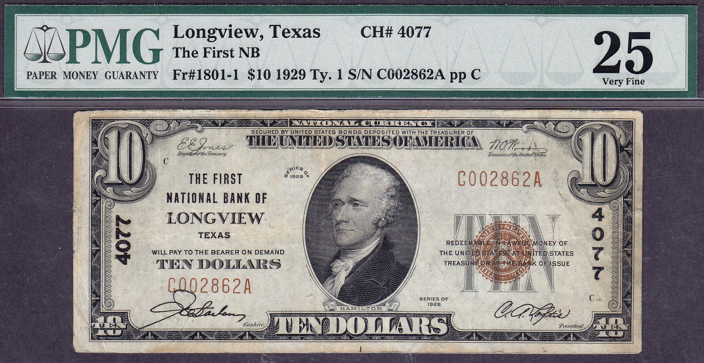 This is a desirable 1929 $10 Type-1 National Bank Note from The First National Bank of Longview, TX. Longview is located in Gregg County. This note is much rarer than most people think. When was the last time anyone saw one? I love Longview, Texas. The beer is cold there.