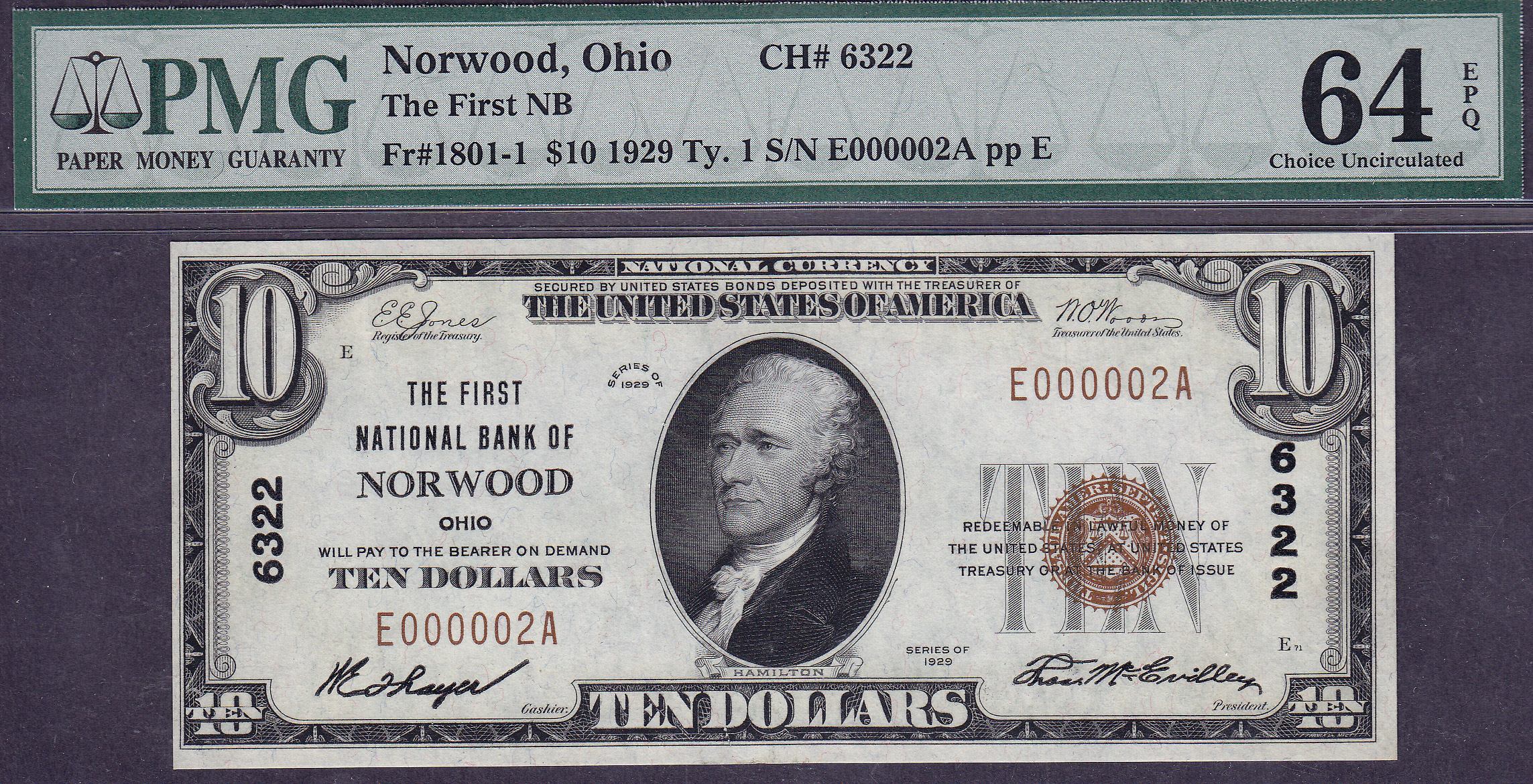 A very nice example of a PMG-64EPQ Choice Uncirclulated 1929 National Bank Note from The First National Bank of Norwood, Ohio. The low serial number of E00002A only enhances the note. Most of these notes are on the lower denominations, rarely on a $10 or $20.