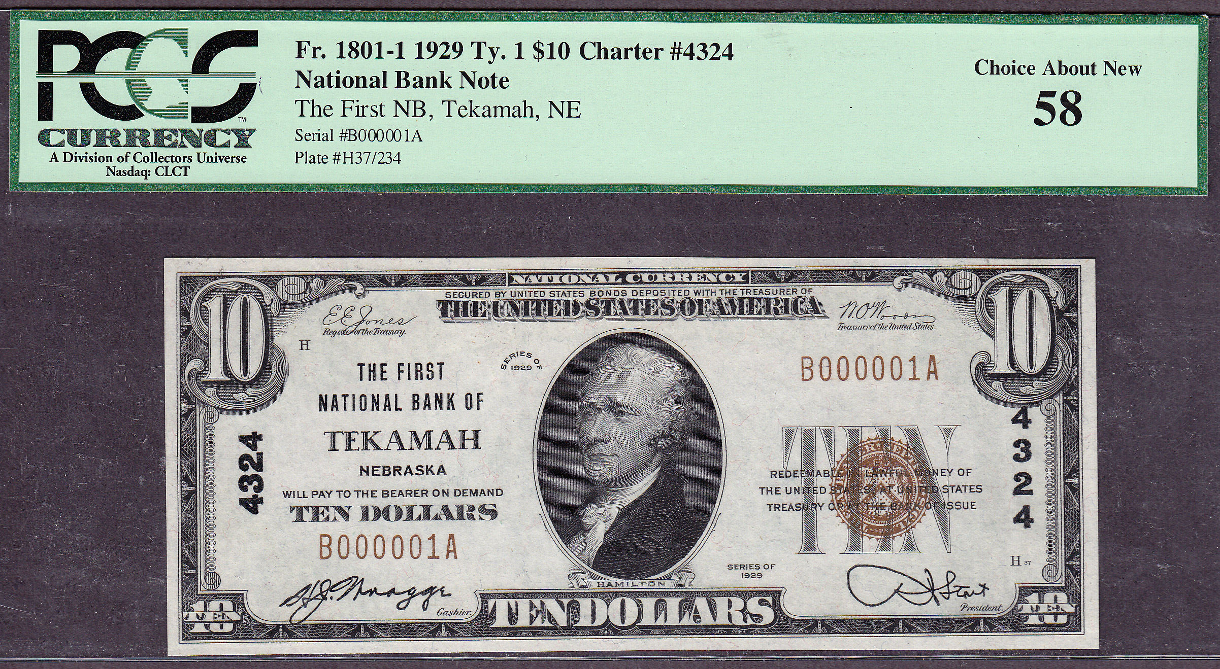 Fr.-1801-1 1929 $10 Tekamah, NE Ser. # B000001A PCGS AU-58