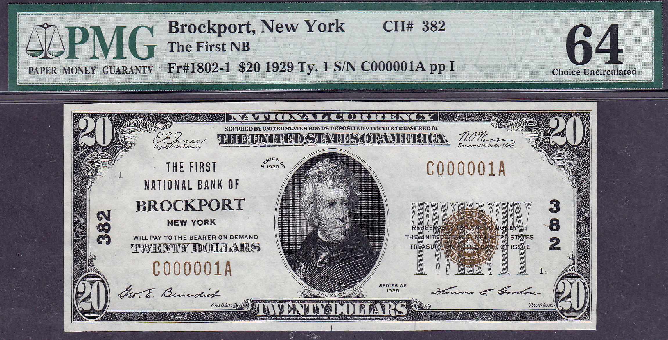 1929 $20 NBN The First Nat Bank of Brockport, NT Ser # C000001A PMG-64.