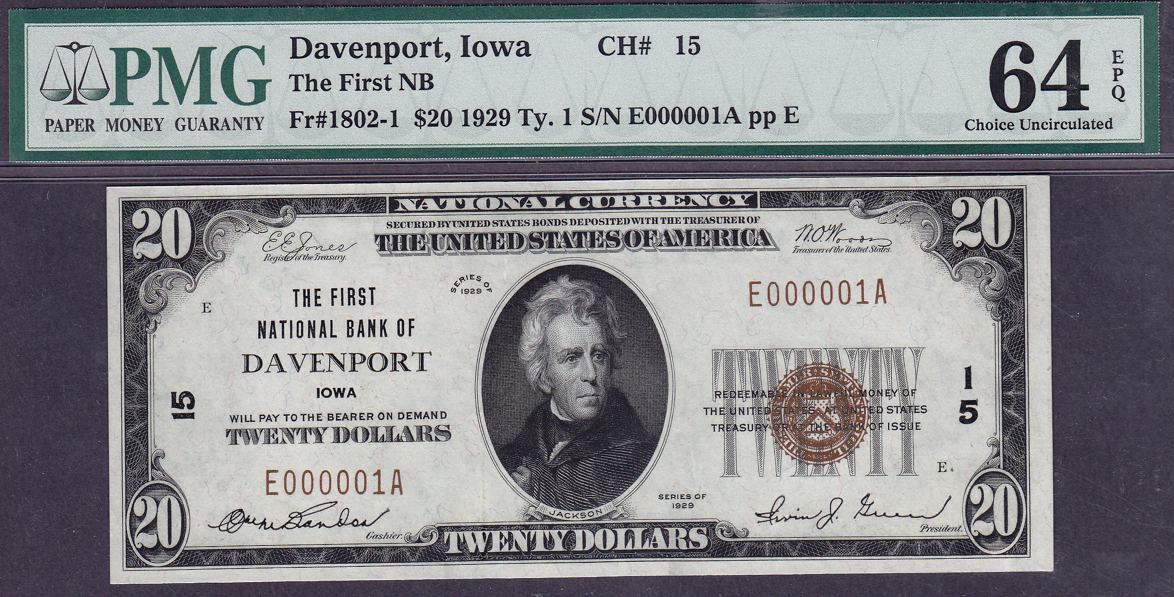 This is another one of my favorite notes. It is from The First National Bank of Brockport, New York. It is located in Monroe County. There 7 1929 Type-1 $20s KNOWN ON THE BANK. This is The highest graded of its type on the bank, and its a serial number one note. How cool is that?