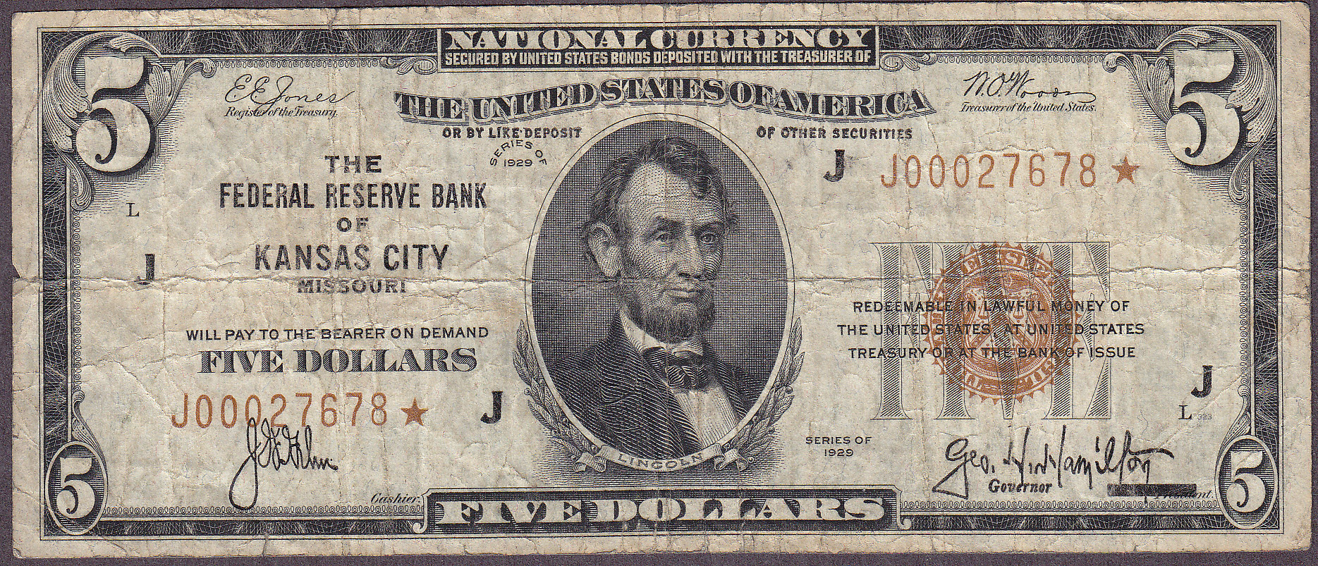 Fr.-1850J* 1929 $5 Kansas City FRBN Star Ser. # J00027678* Fine
