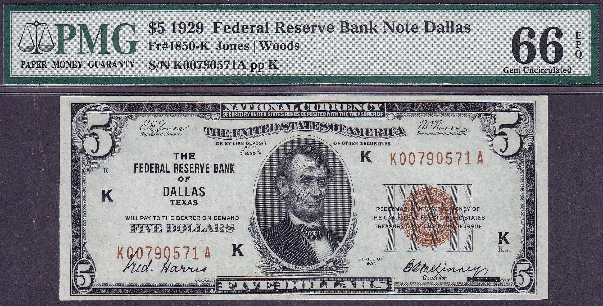 Dallas Rocks! Check out this stunning 1929 $5 FRBN from the ever tough Dallas district. You will love this one with the boardwalk margins and near perfect centering. PMG has notated Exceptional Paper Quality and its has earned that distinction. The serial number is K00790571A. Dallas, along with Richmond and Minneapolis is one of the key district to completing this district set. Very few $5 FRBN notes are found from these three districts in GEM much less a PMG-66EPQ.