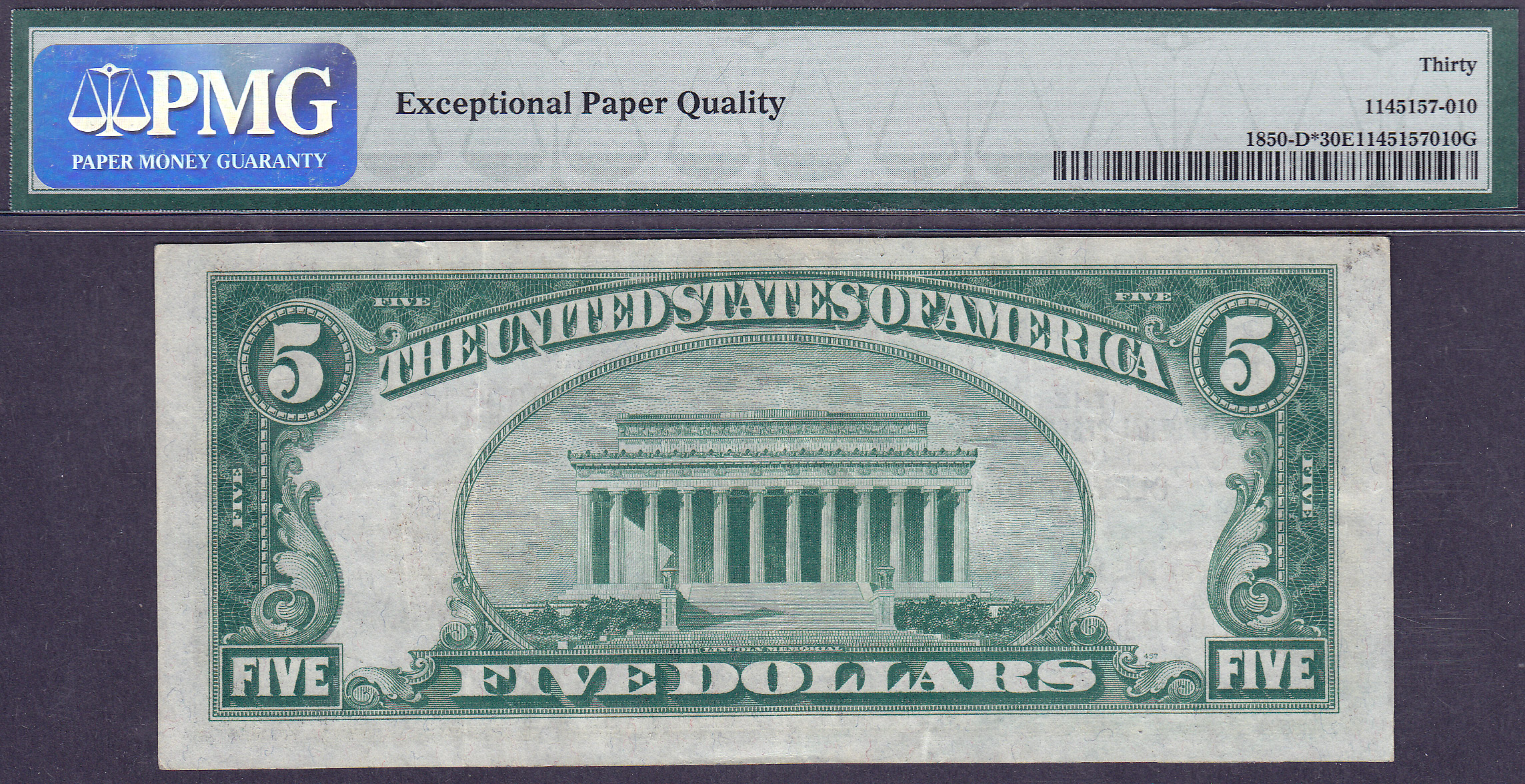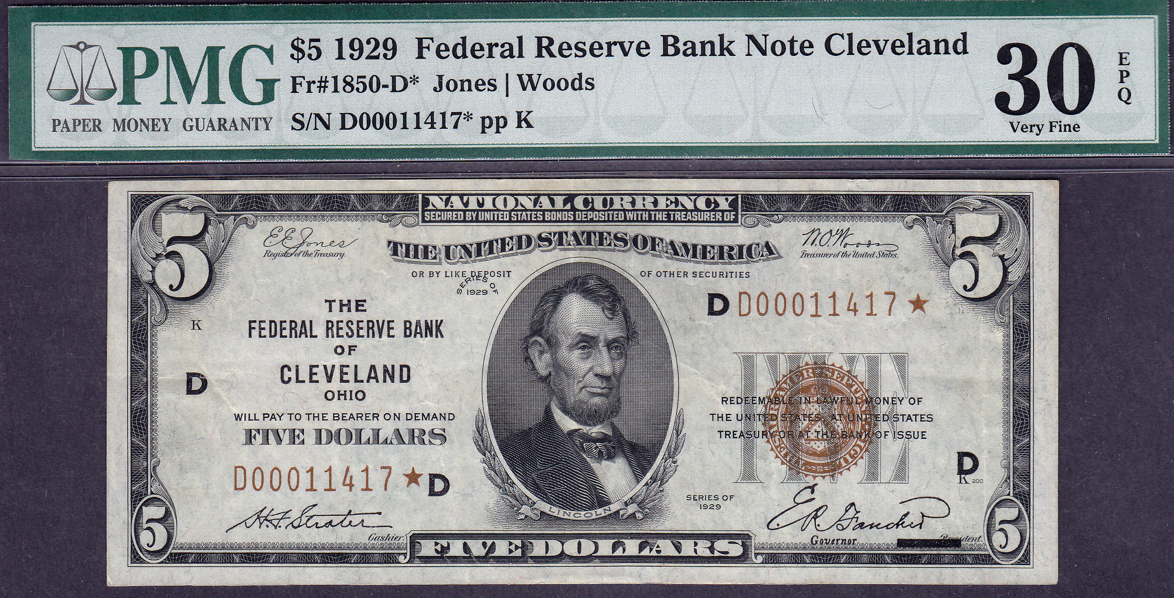 A cool 1929 $5 Cleveland FRBN Star. This EX-Dean Oakes and Jhon E Cash pedigreed note has the serial # of D00011417*. It is graded as a PMG VF-30EPQ. Of the 60,000 printed there are 37 survivors. This evenly circulated note is totally original with no issues. This note is the second finest 1929 $5 Cleveland star graded by PMG with a PMG EF-40EPQ graded higher. This is a steal by anyones standard at this price.