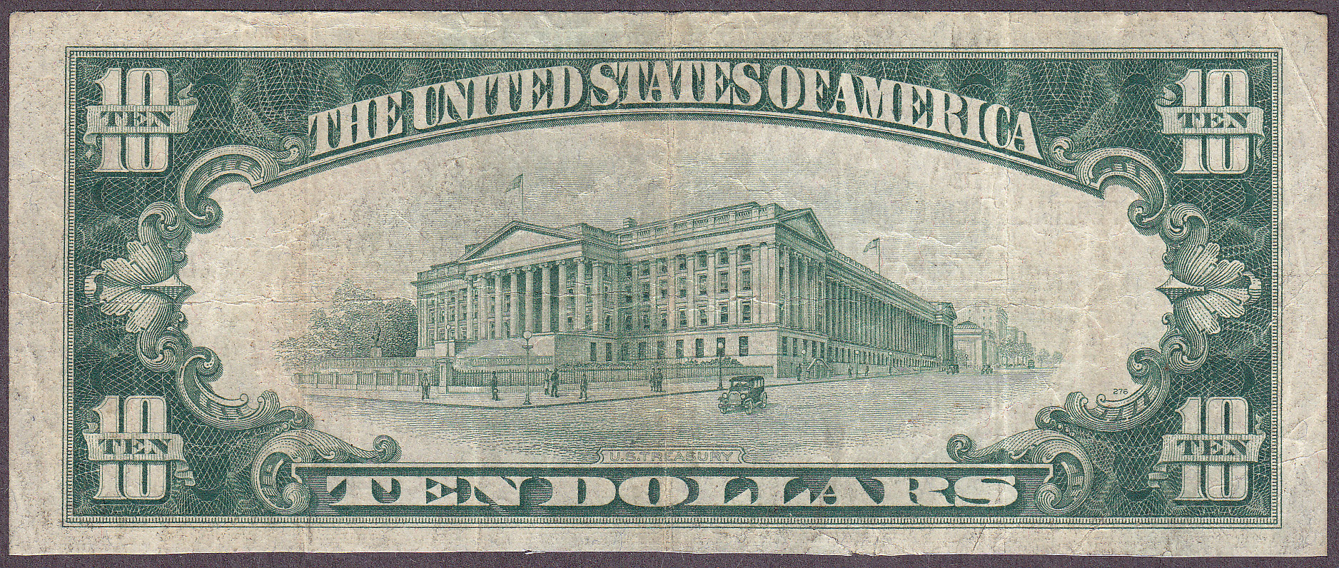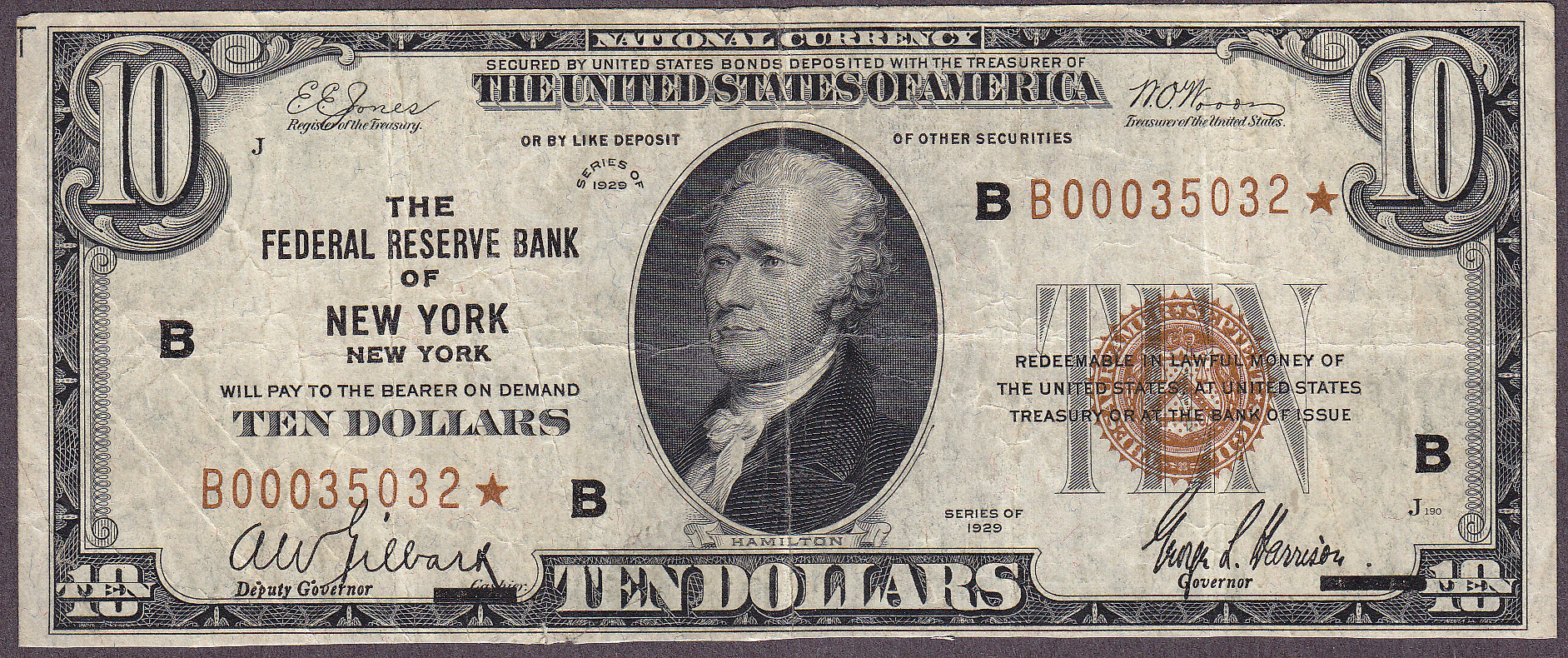 Here is another problem free 1929 $10 FRBN star from the New York district in Very Fine condition. There are no rips, tears or pinholes. The serial number is B00035032*. This would make a nice addition to a mid grade FRBN Star collection.